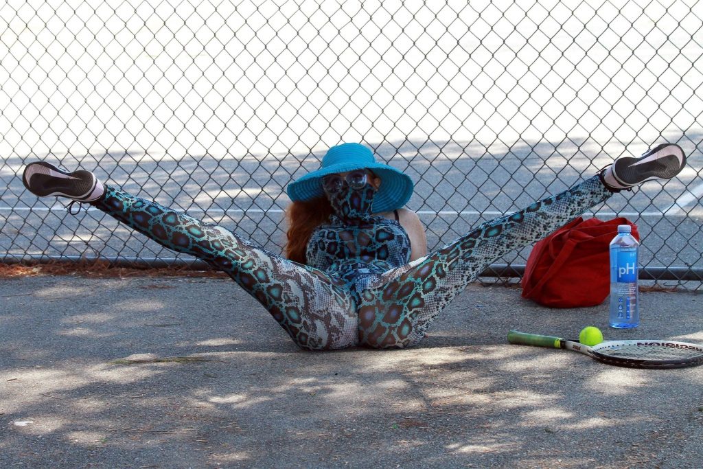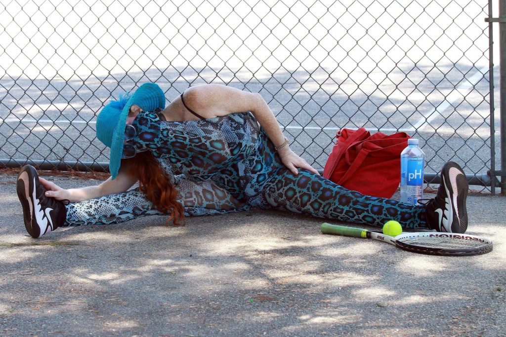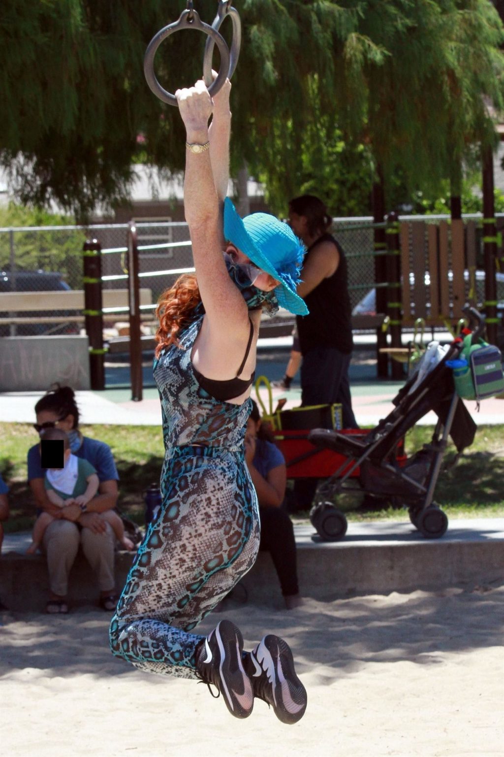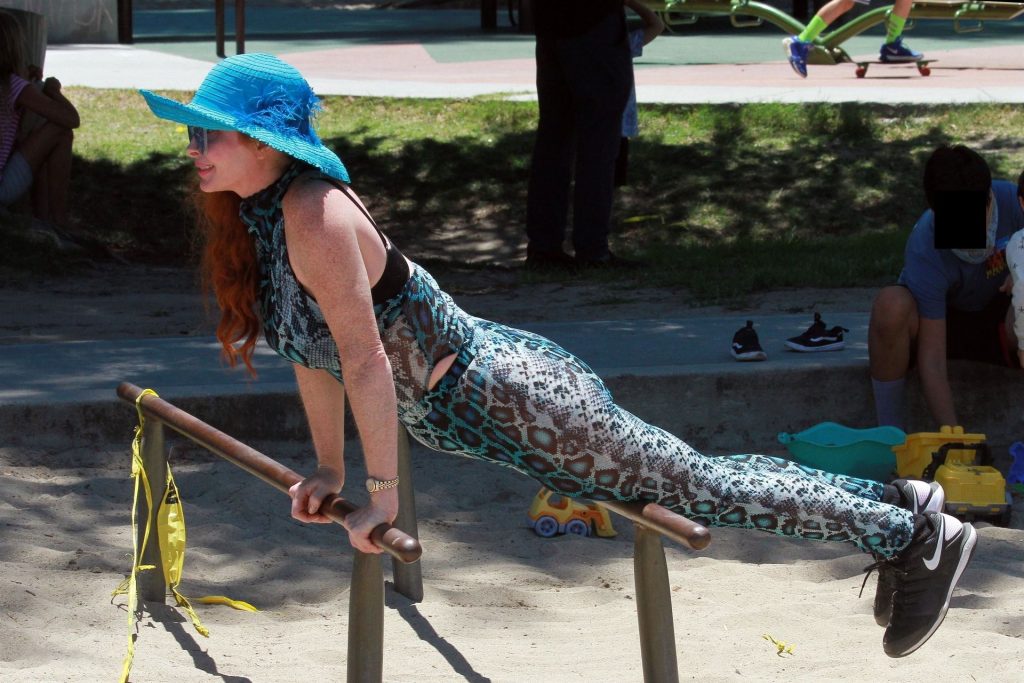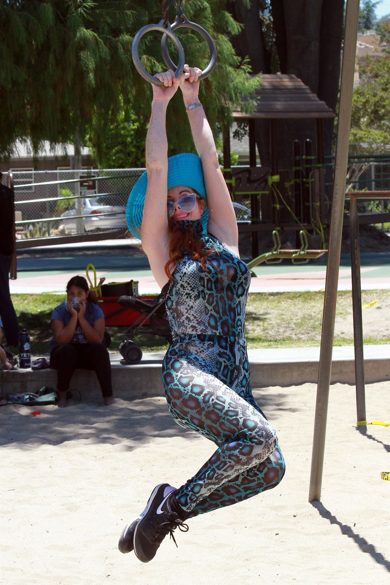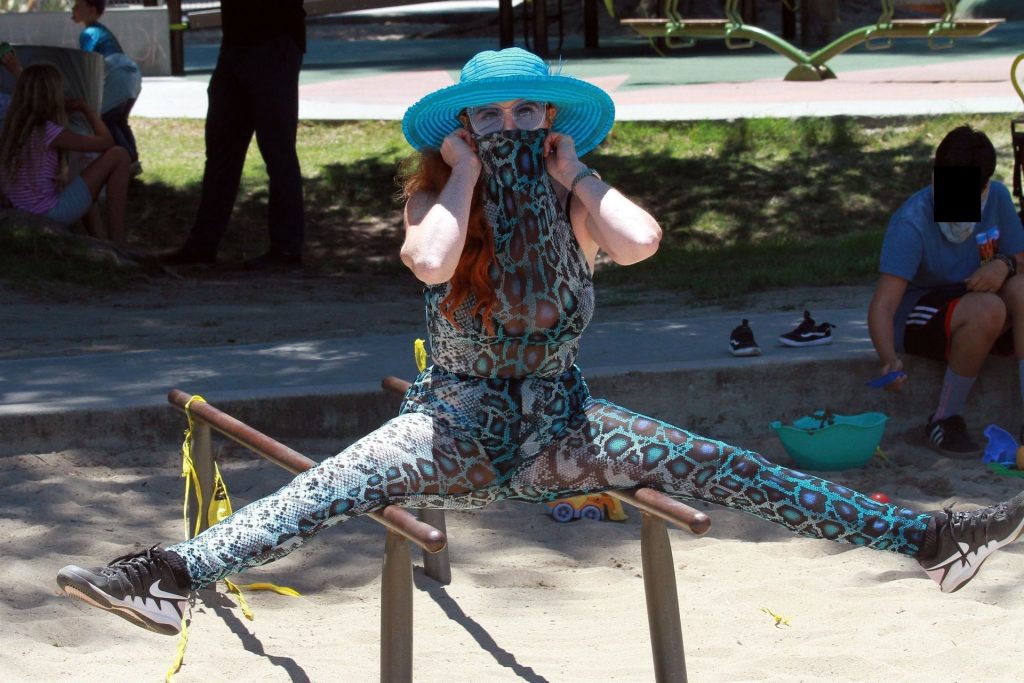 Atriz Phoebe Price é vista posando com um conjunto turquesa com estampa animal no parque para seu treino – Studio City, 17/07/2020.