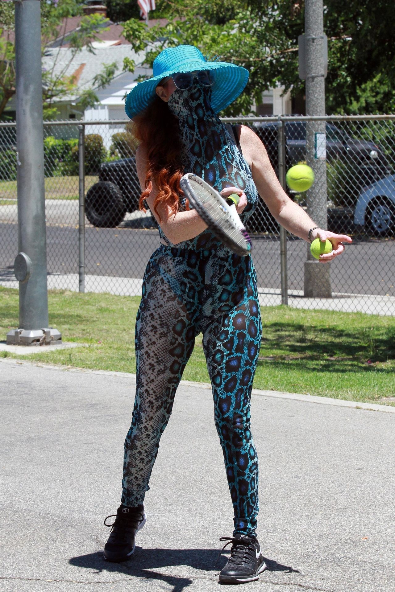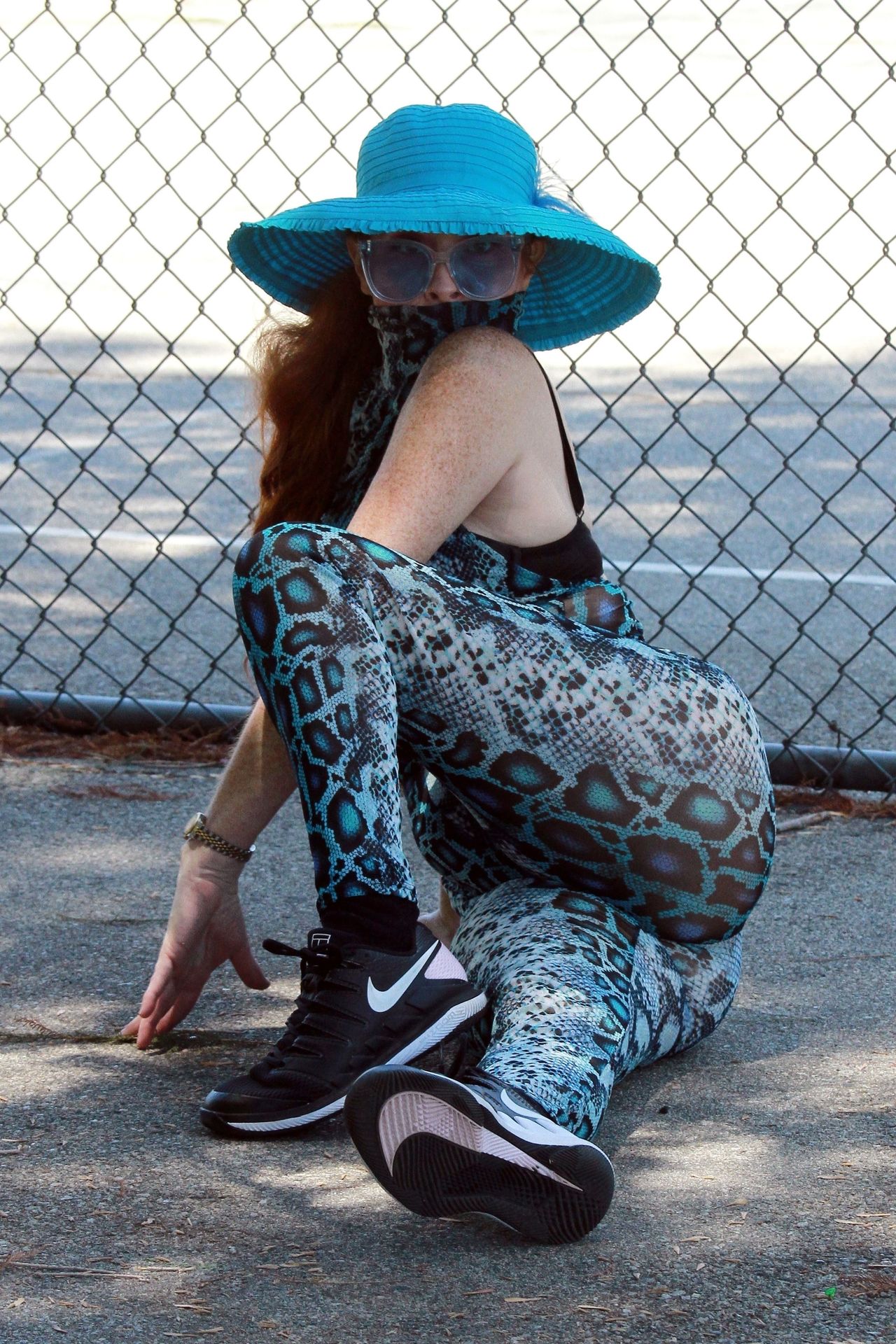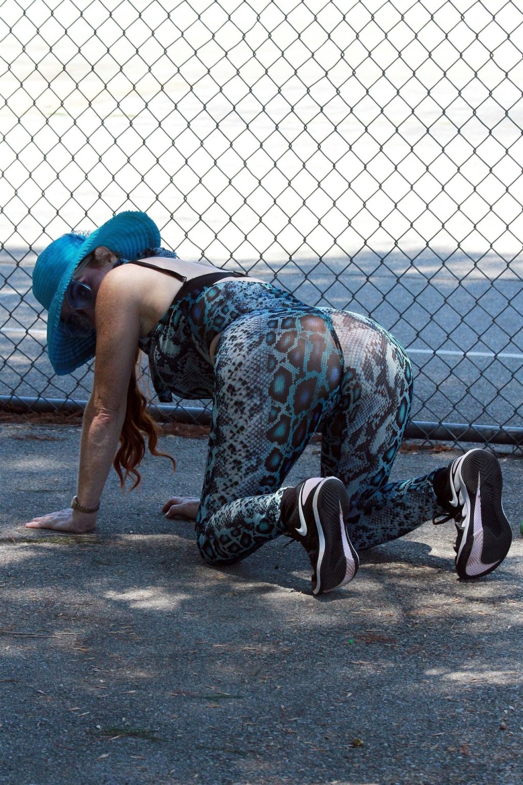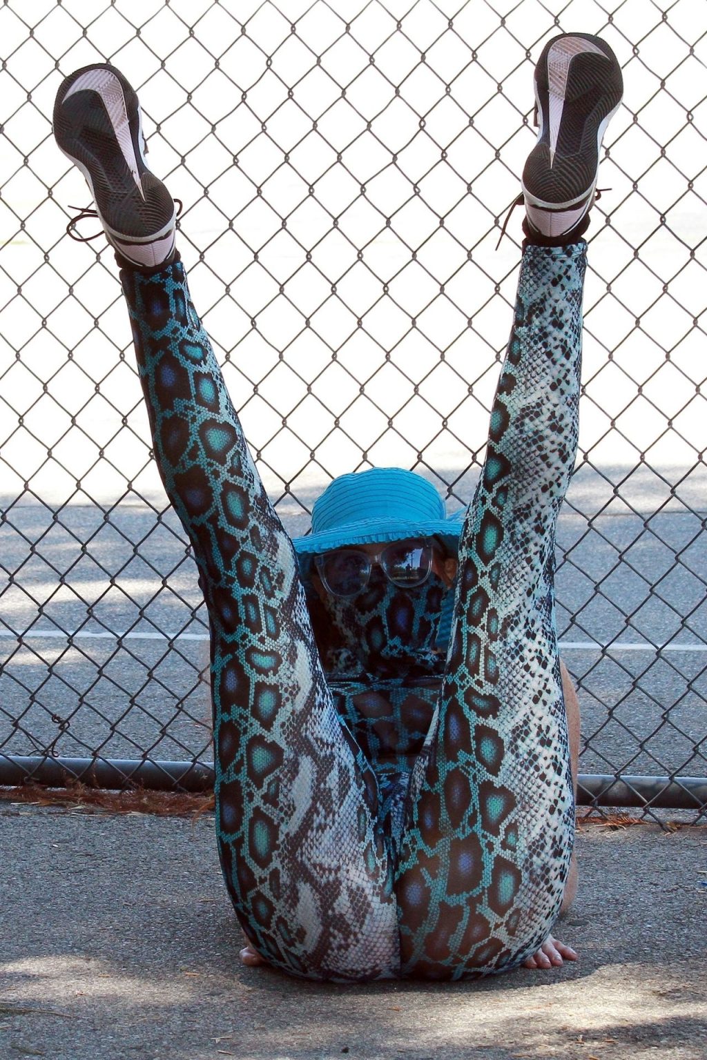 Phoebe Price usa um conjunto turquesa com estampa animal para seu treino (42 fotos)