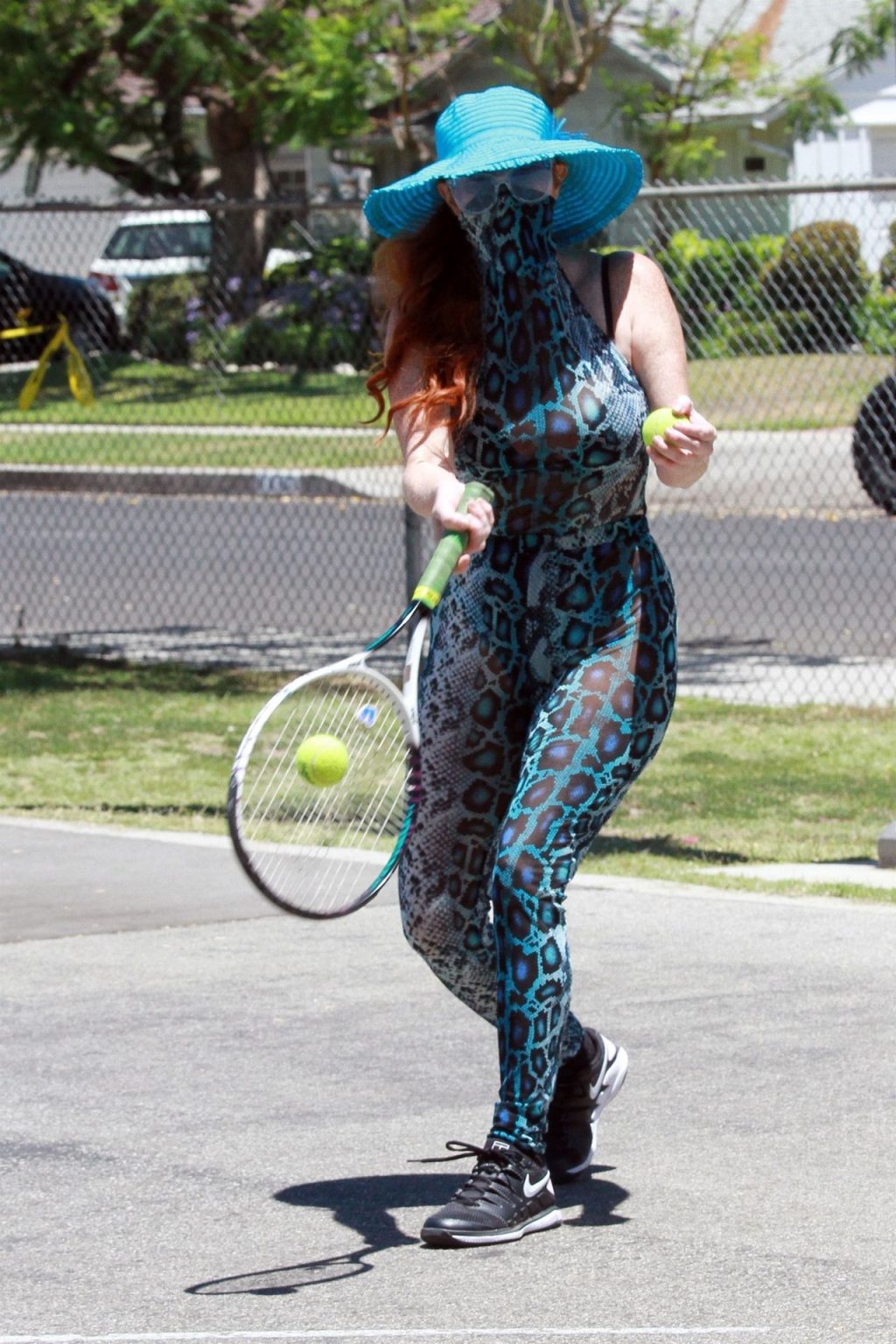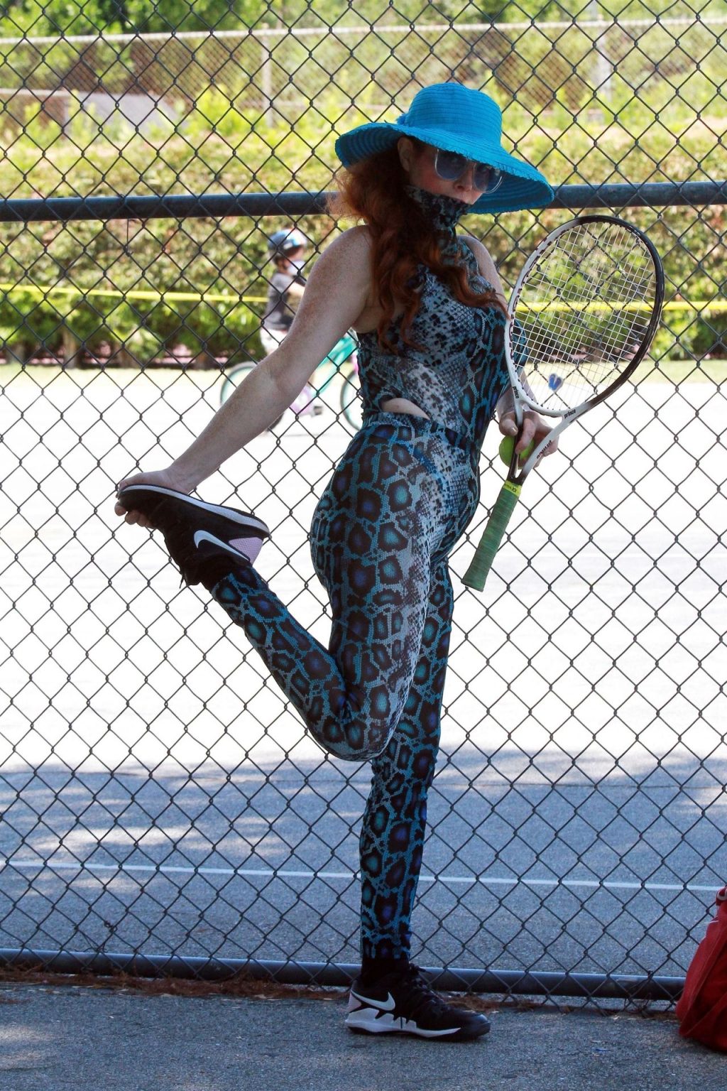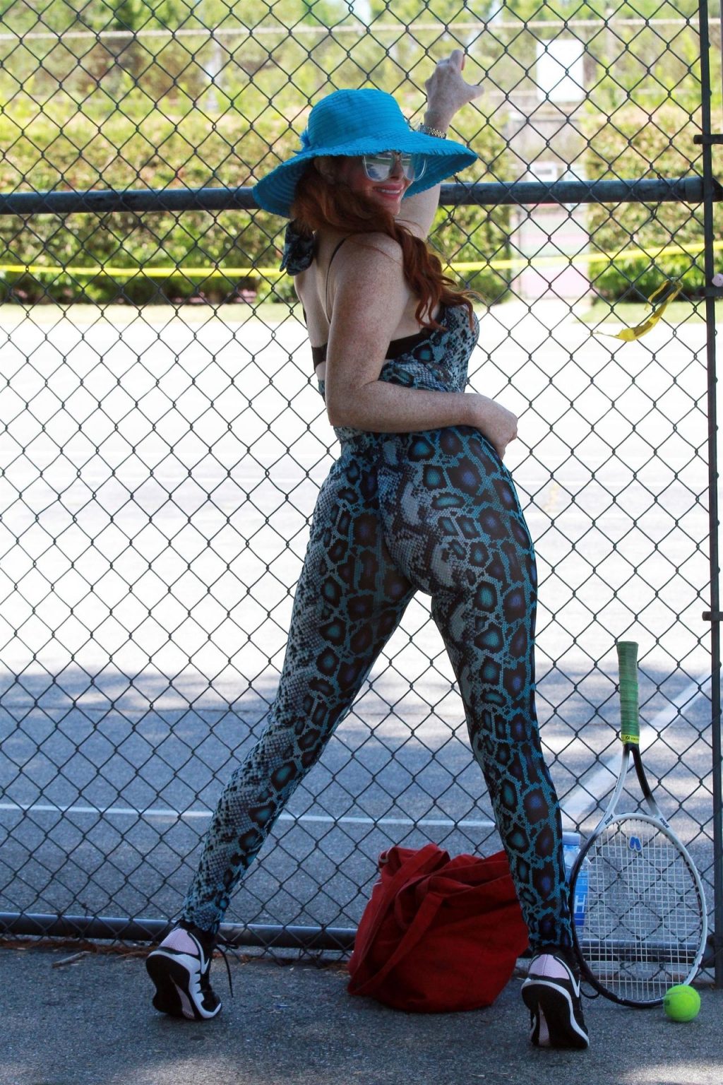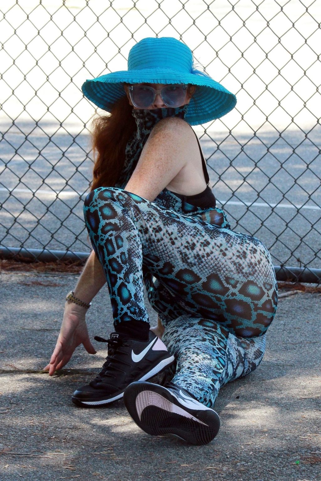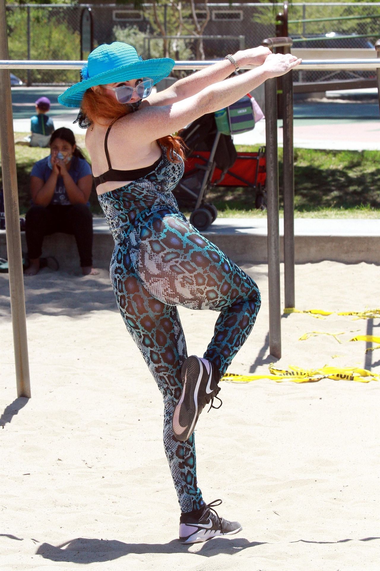 Phoebe Price usa um conjunto turquesa com estampa animal para seu treino (42 fotos)