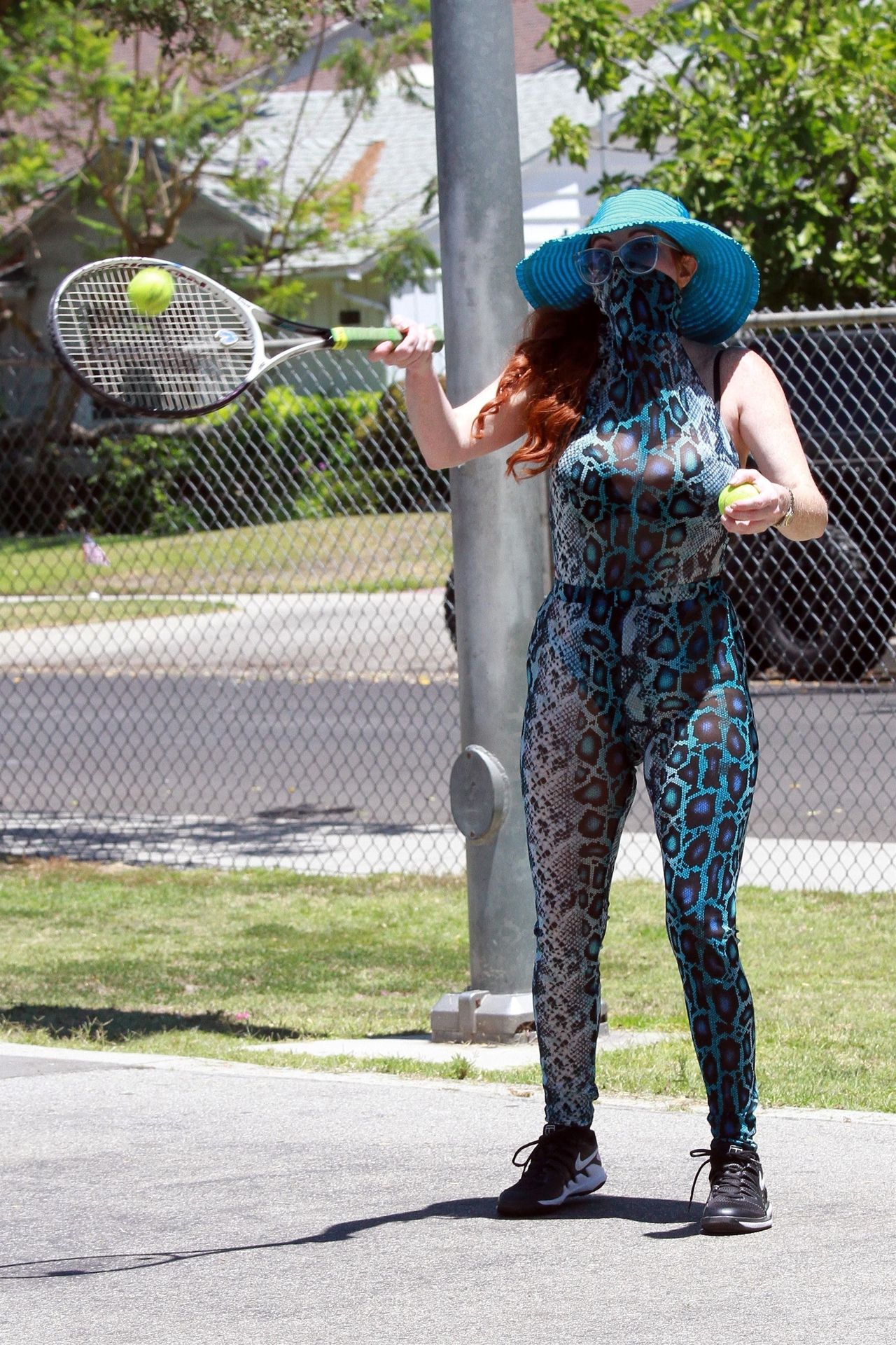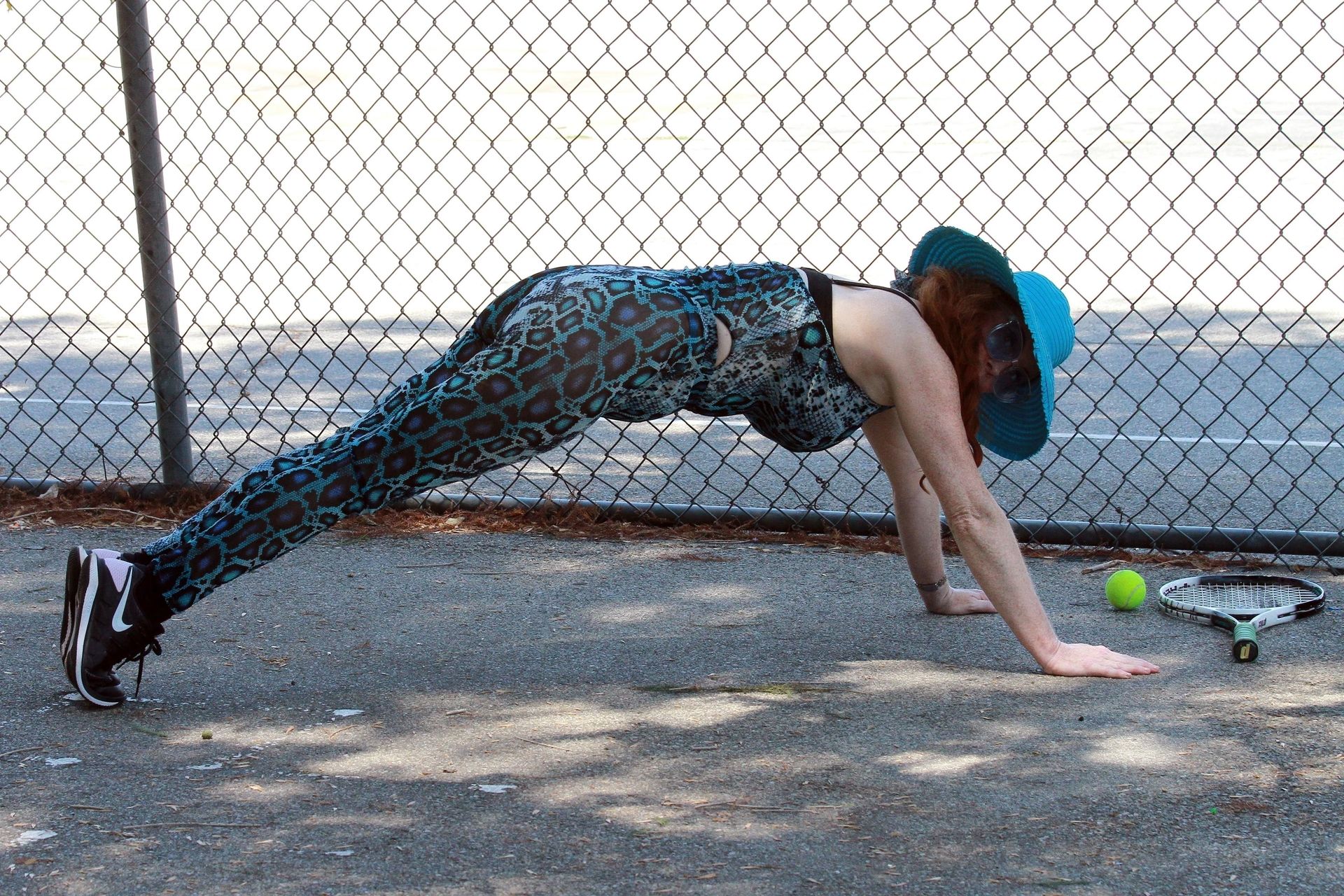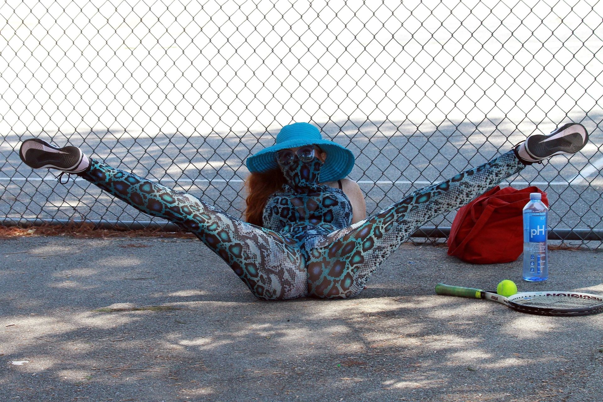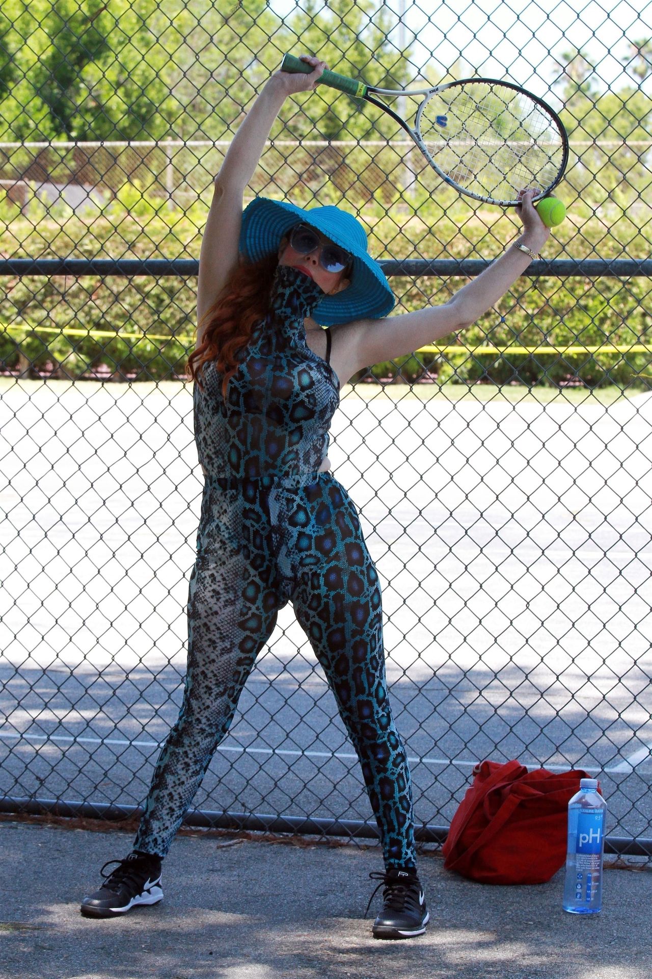 Phoebe Price usa um conjunto turquesa com estampa animal para seu treino (42 fotos)