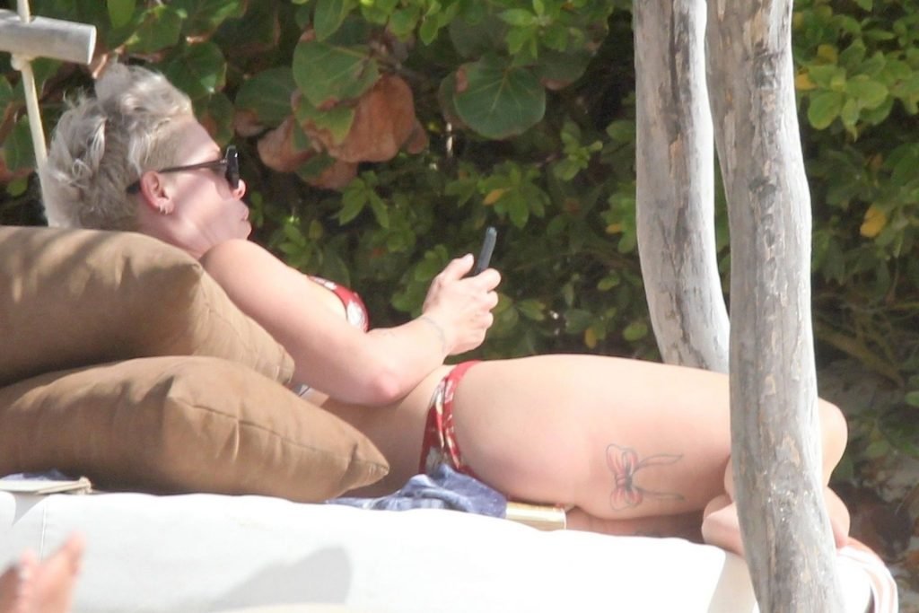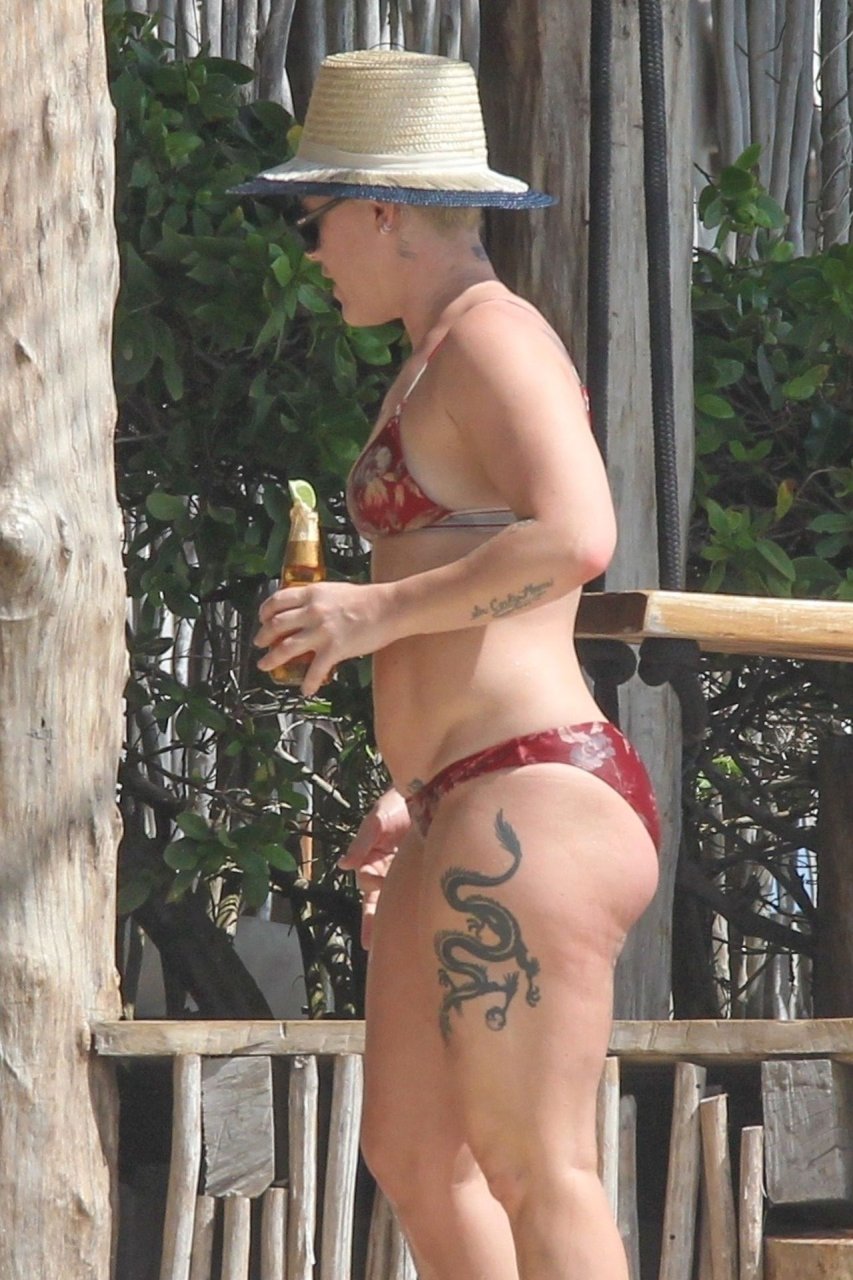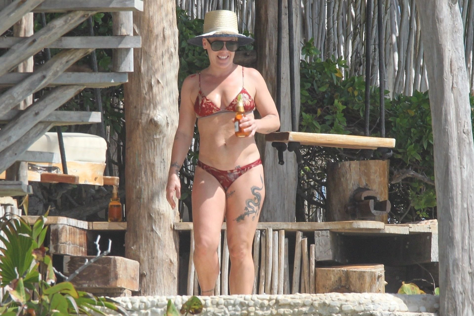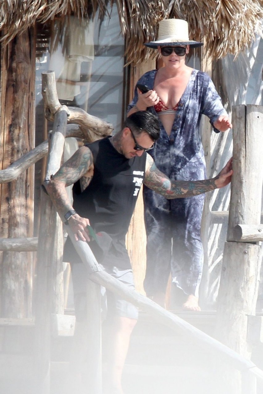 A cantora P!nk e Carey Hart estão aproveitando a boa vida enquanto bebem cerveja e tomam sol em Tulum, México, 25/02/2019.