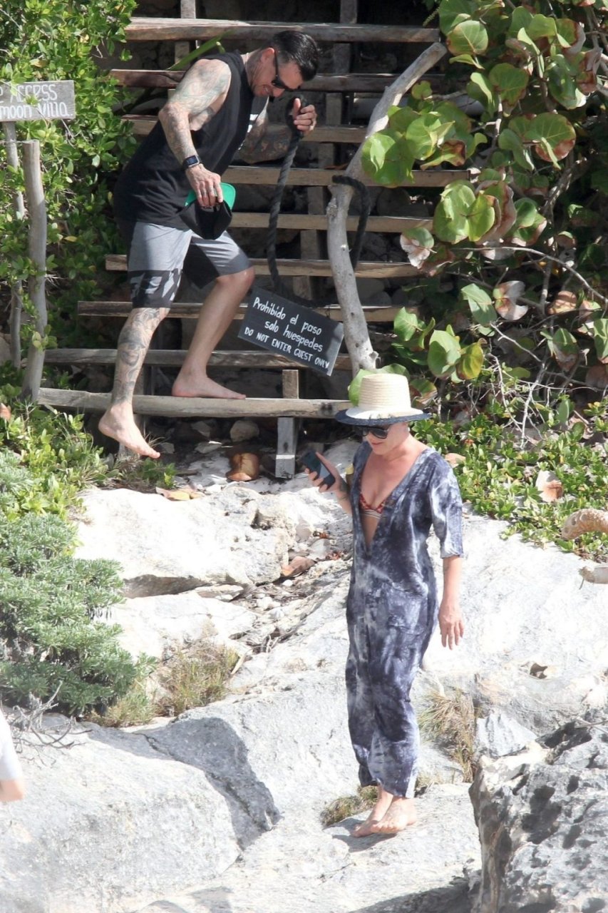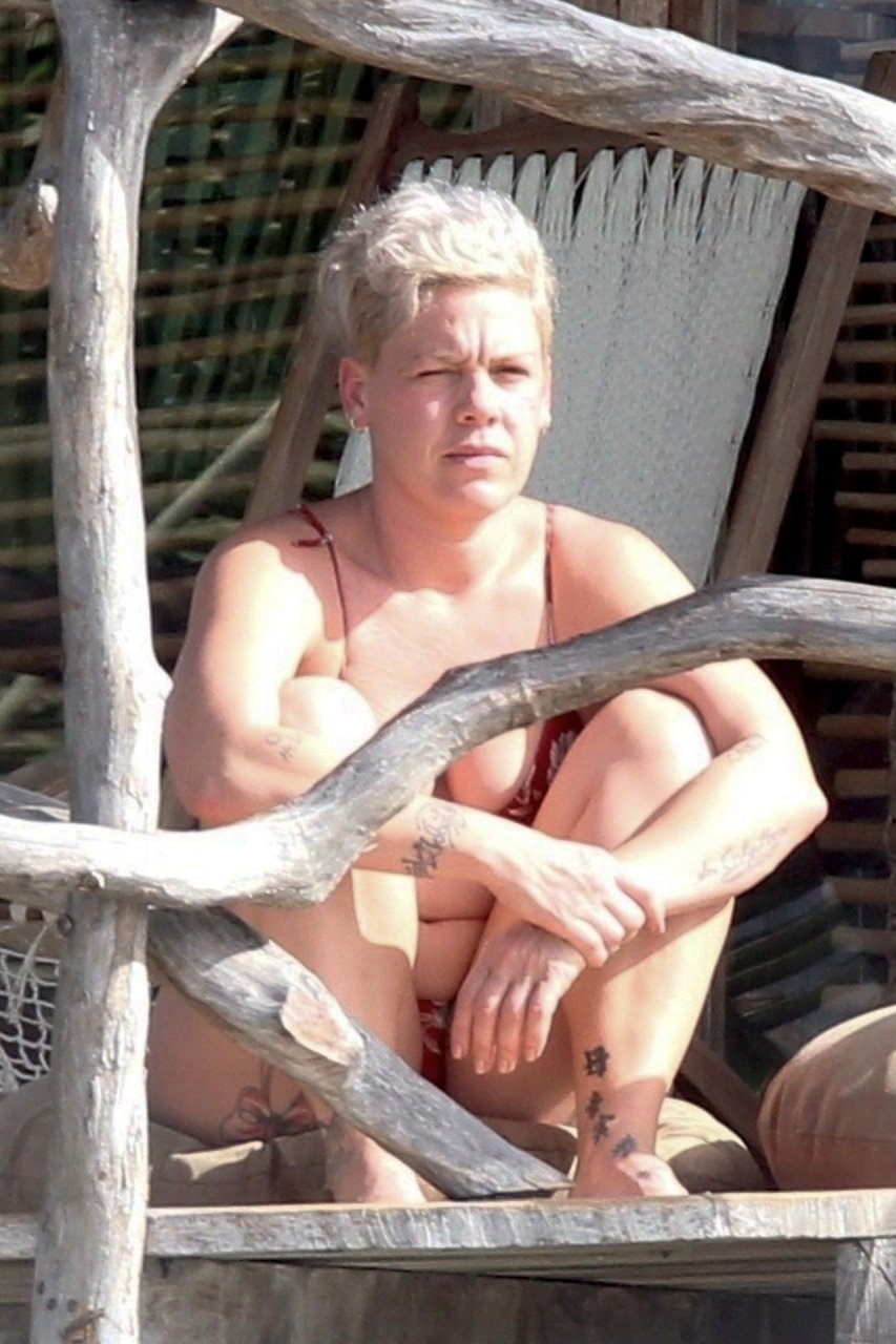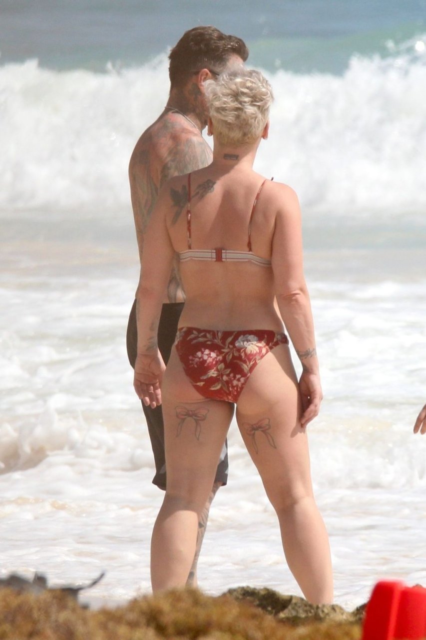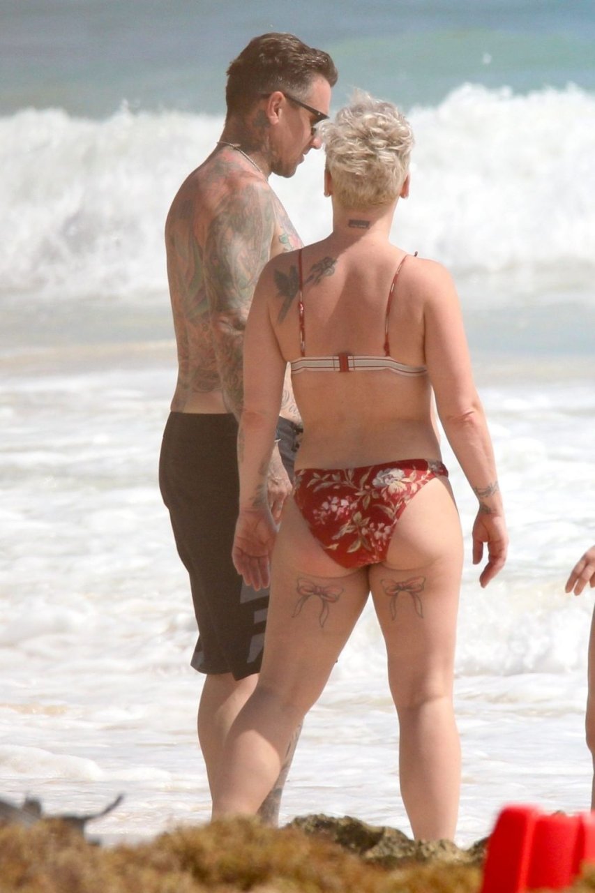 A cantora P!nk e Carey Hart estão aproveitando a boa vida enquanto bebem cerveja e tomam sol em Tulum, México, 25/02/2019.
