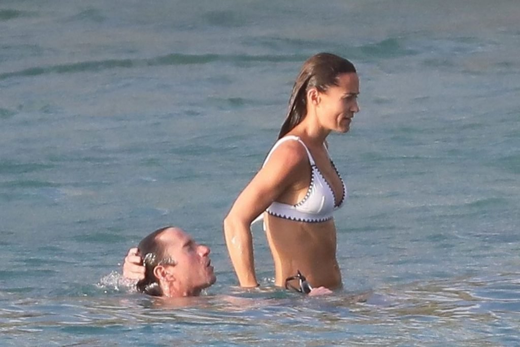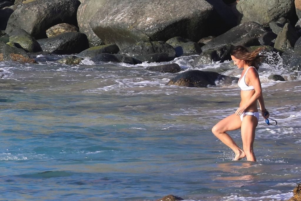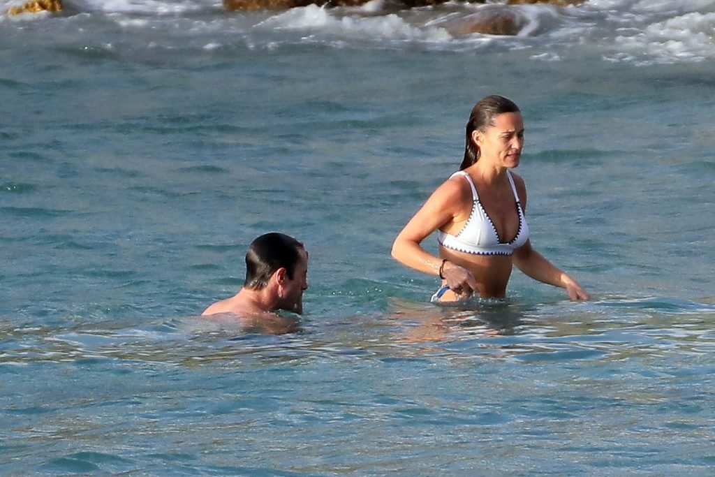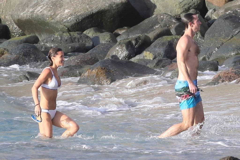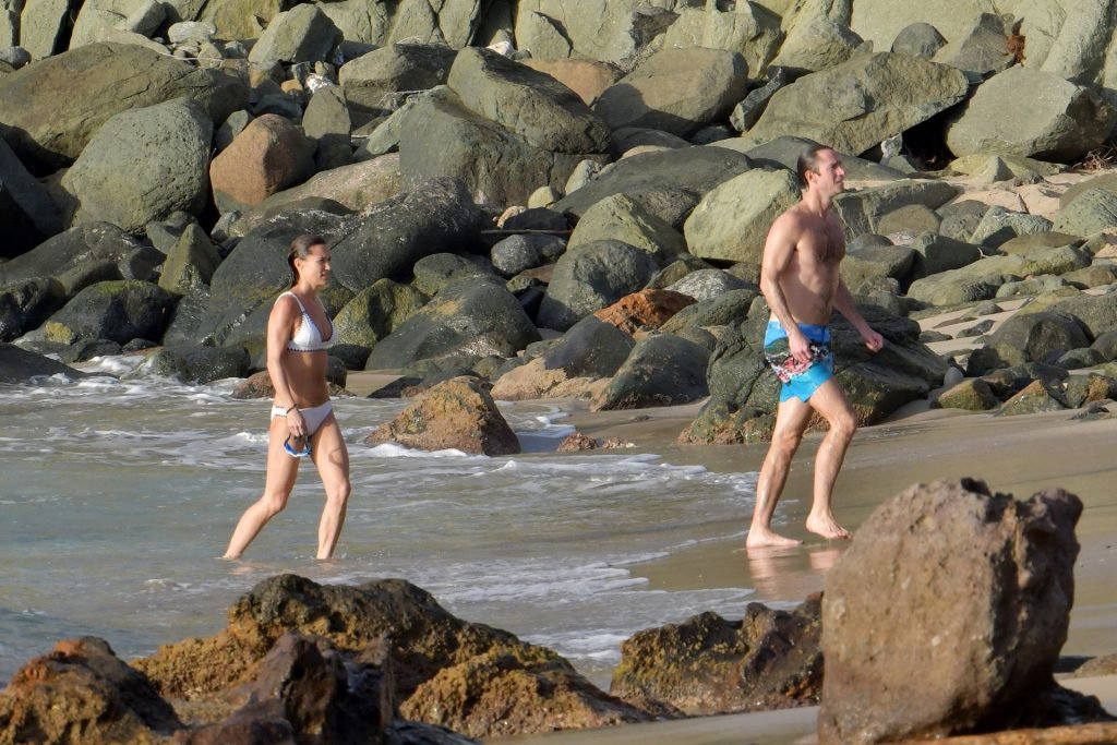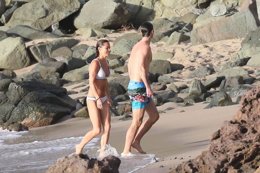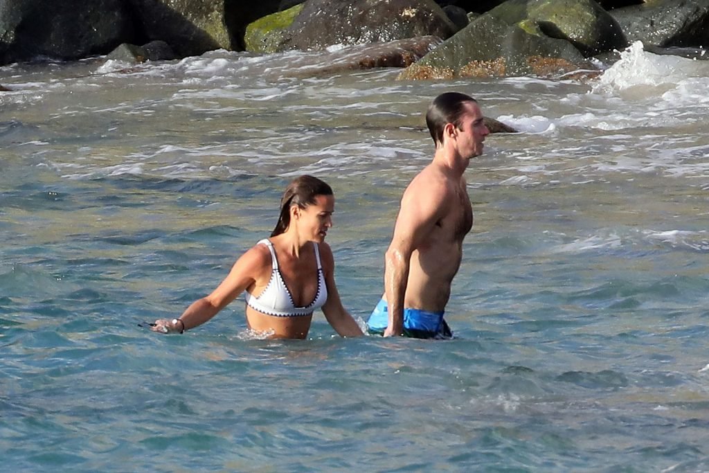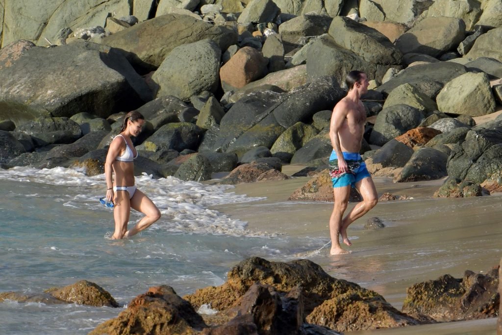 Nova mamãe Pippa Middleton tira um tempo para relaxar com seu marido na ilha do Caribe, 01/02/2019. Na foto, ela exibe seu corpo esguio usando um biquíni branco enquanto nada com seu marido.
