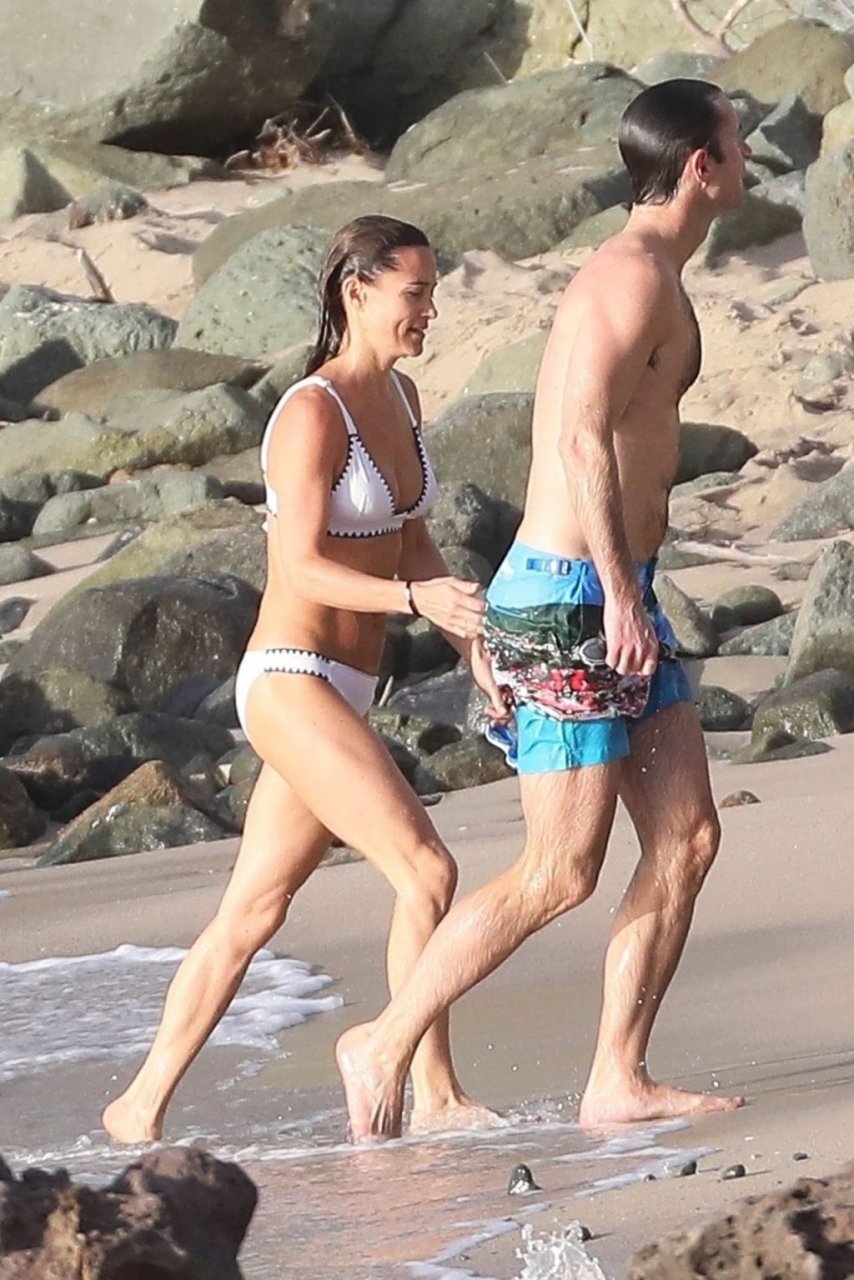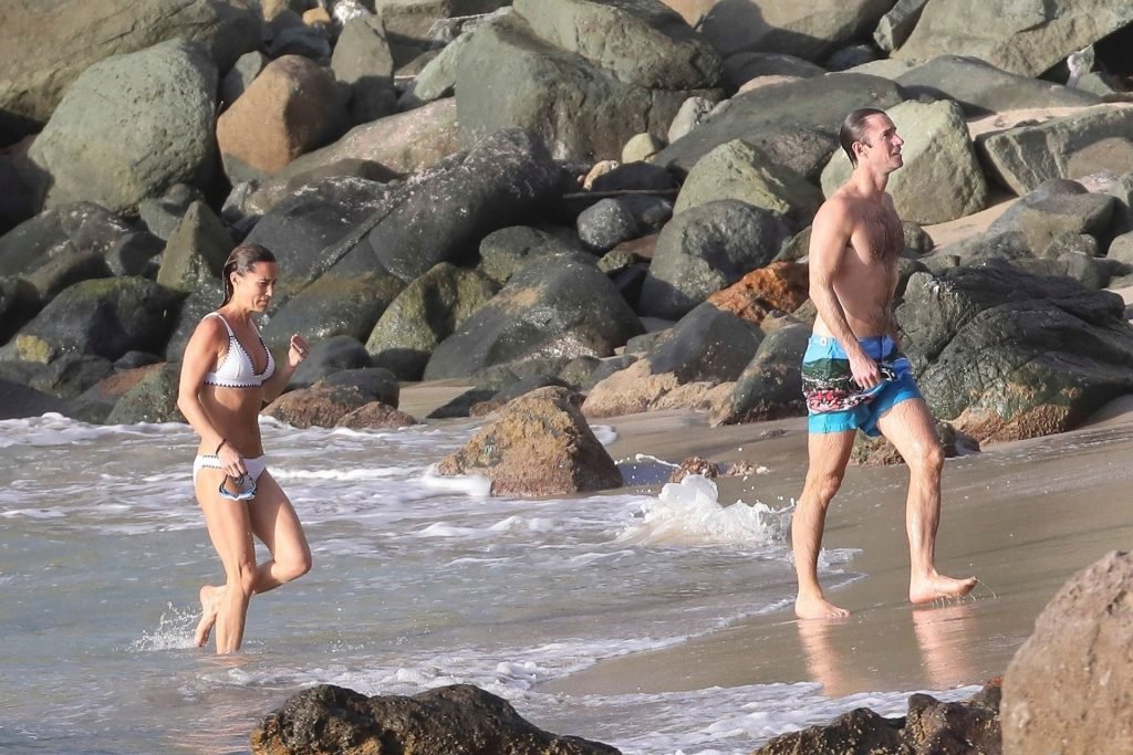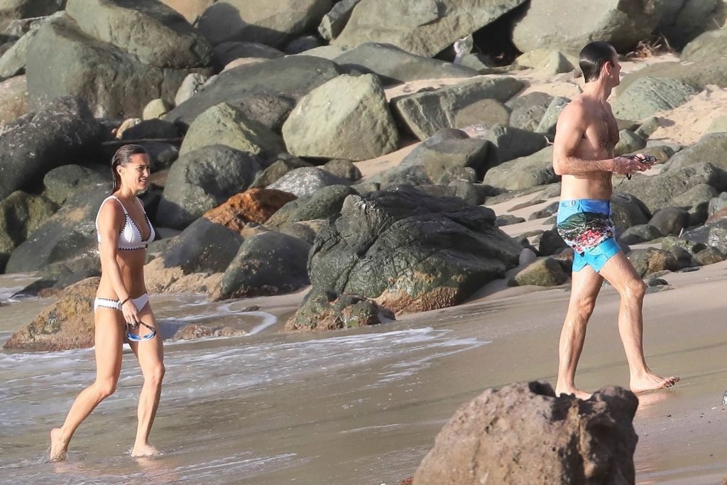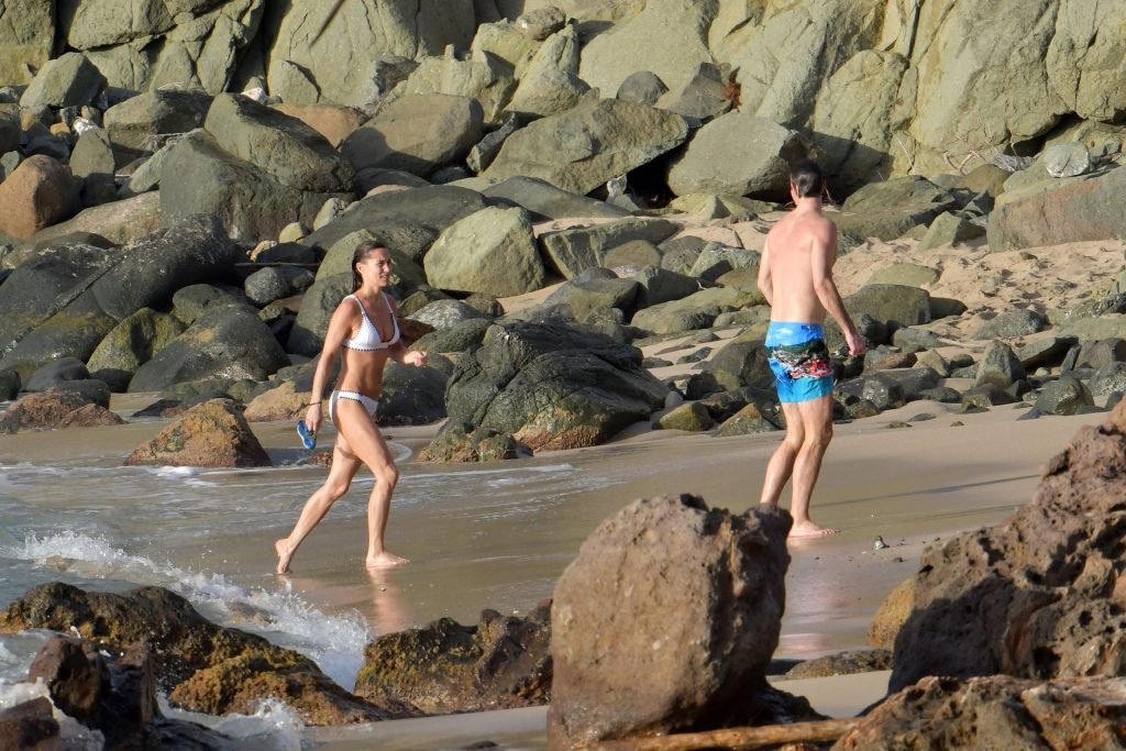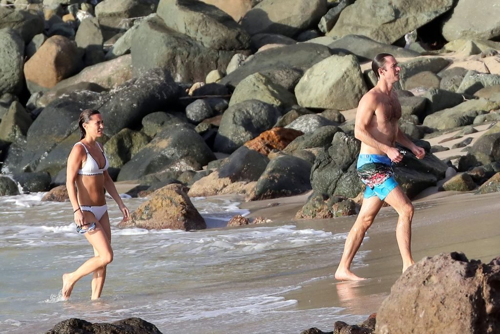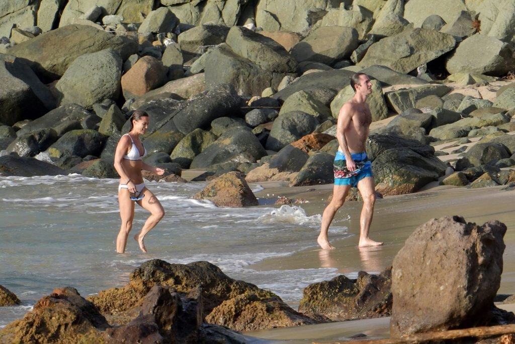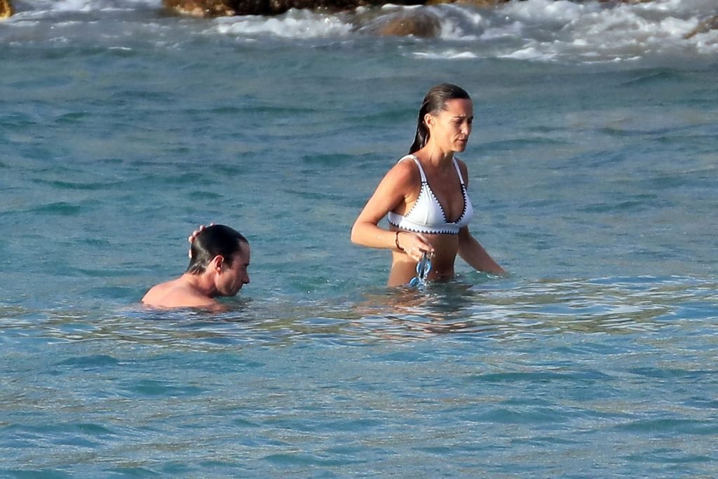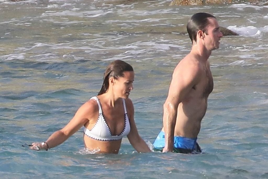 Nova mamãe Pippa Middleton tira um tempo para relaxar com seu marido na ilha do Caribe, 01/02/2019. Na foto, ela exibe seu corpo esguio usando um biquíni branco enquanto nada com seu marido.