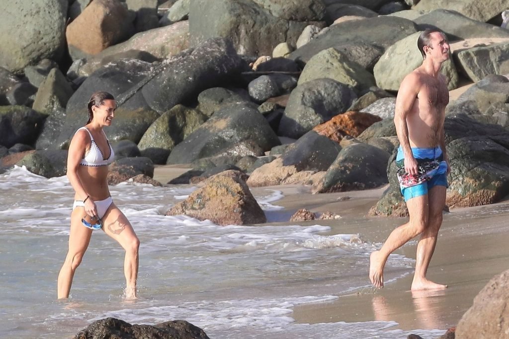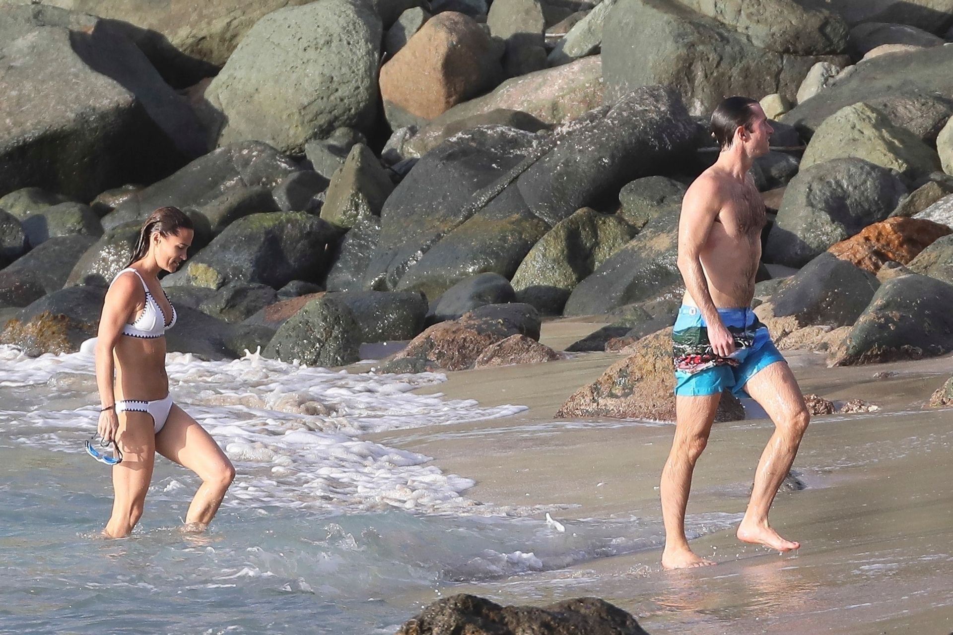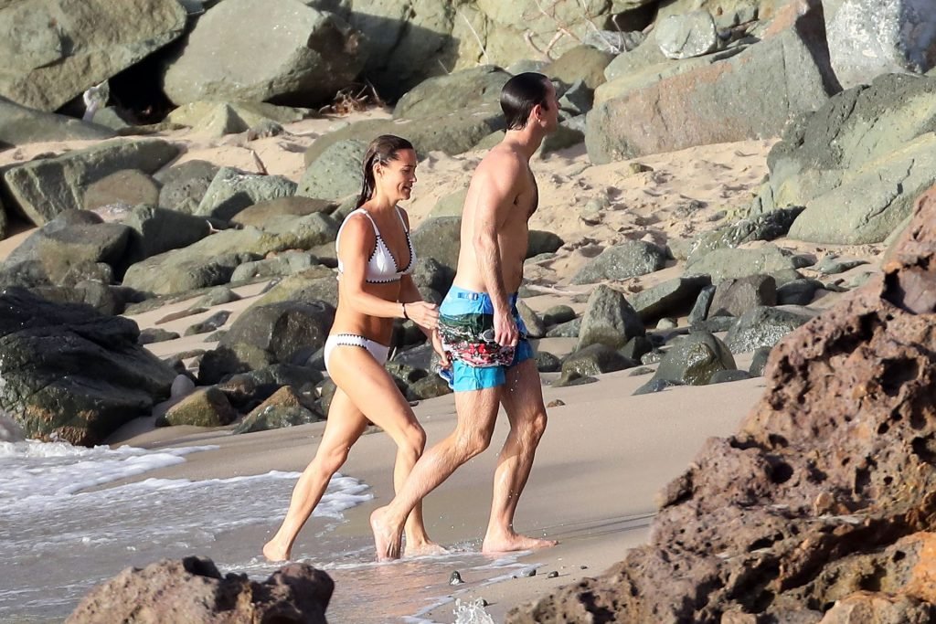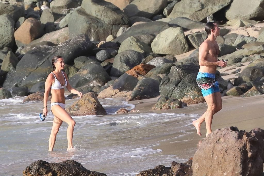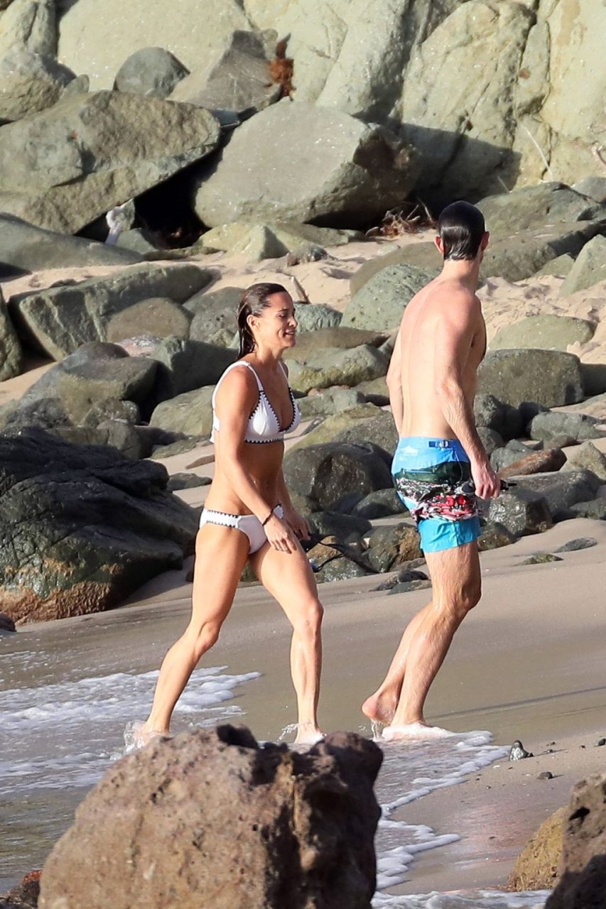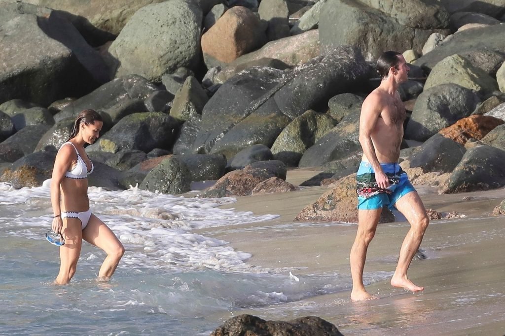 Nova mamãe Pippa Middleton tira um tempo para relaxar com seu marido na ilha do Caribe, 01/02/2019. Na foto, ela exibe seu corpo esguio usando um biquíni branco enquanto nada com seu marido.