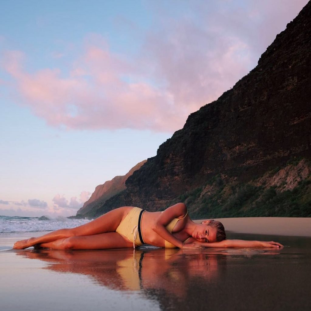 A cantora Pixie Lott foi vista usando um biquíni listrado branco e azul com Oliver Cheshire na praia em Kauai, Havaí, 11/06/2018.