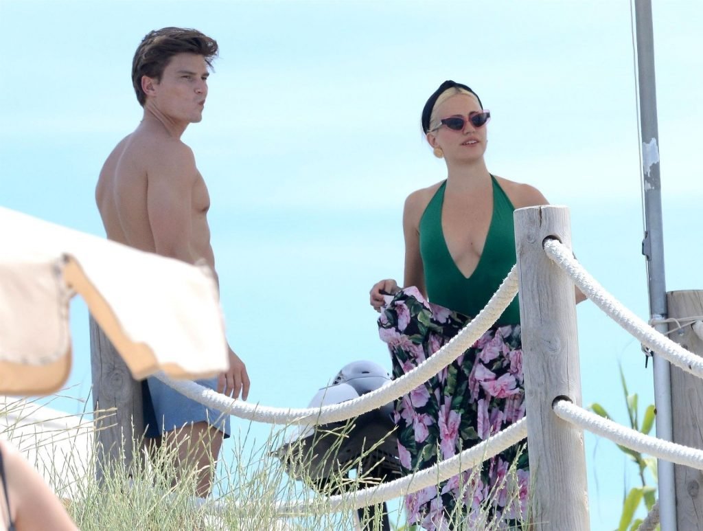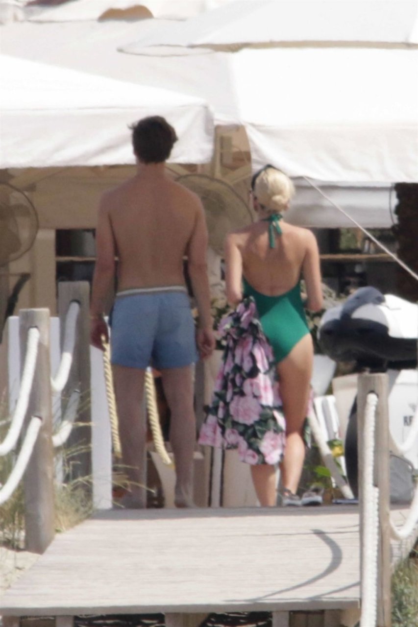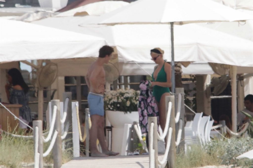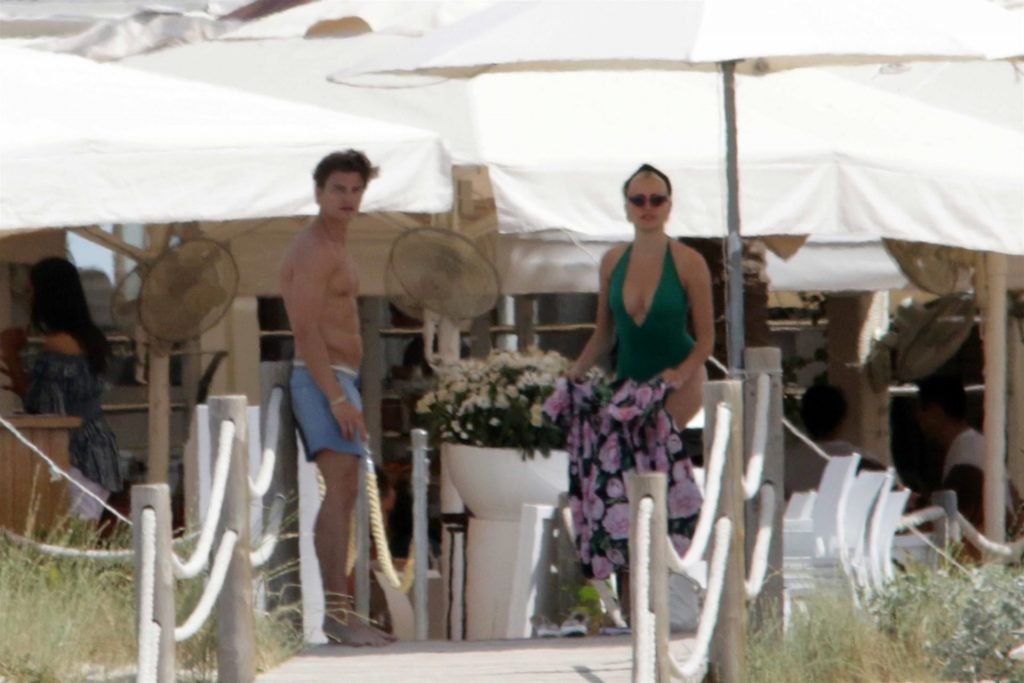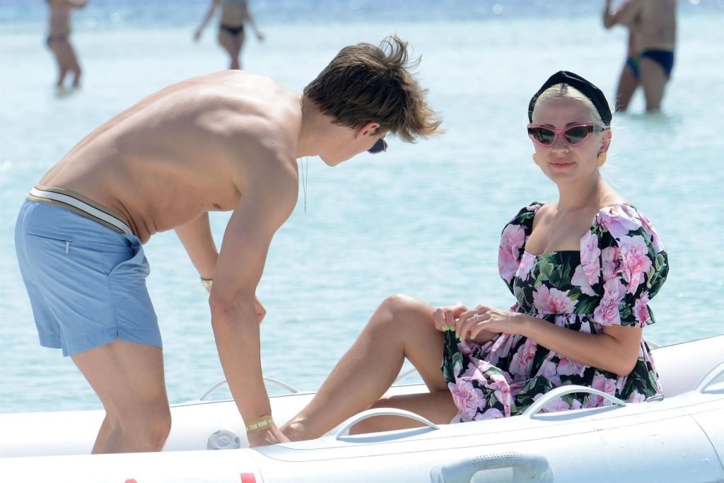Casal Apaixonado Pixie Lott e Oliver Cheshire de férias em Formentera, 03/06/2019. O casal vai para as águas após um dia na praia com Pixie vestindo um vestido floral atraente enquanto Oliver fica sem camisa sob o sol escaldante.