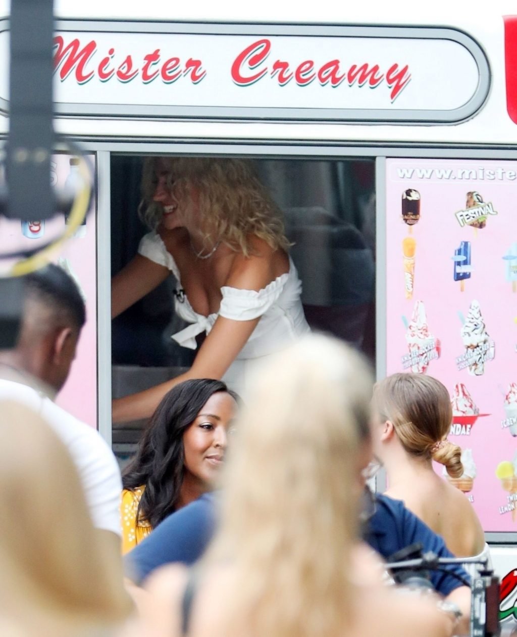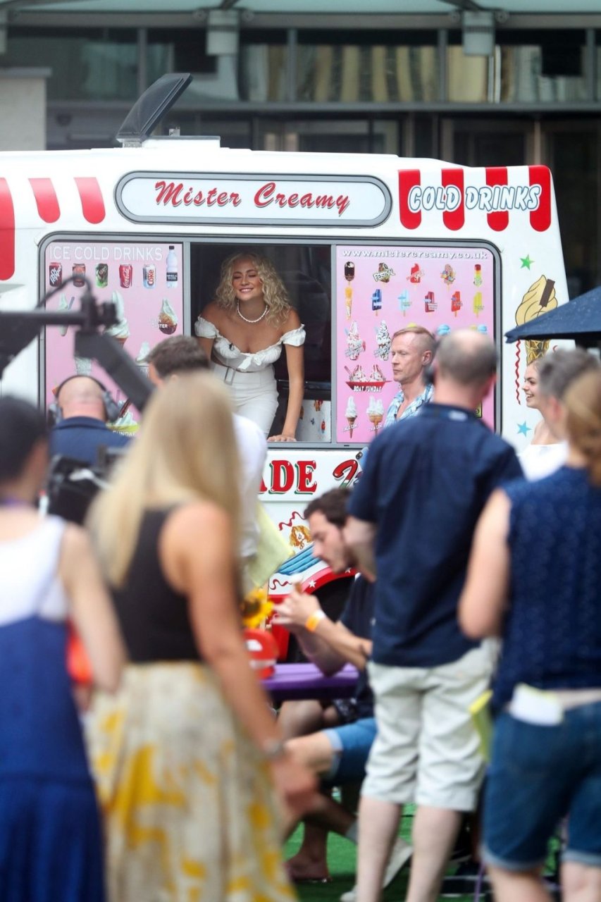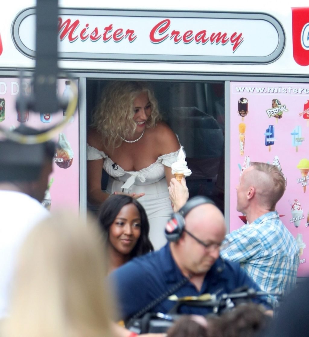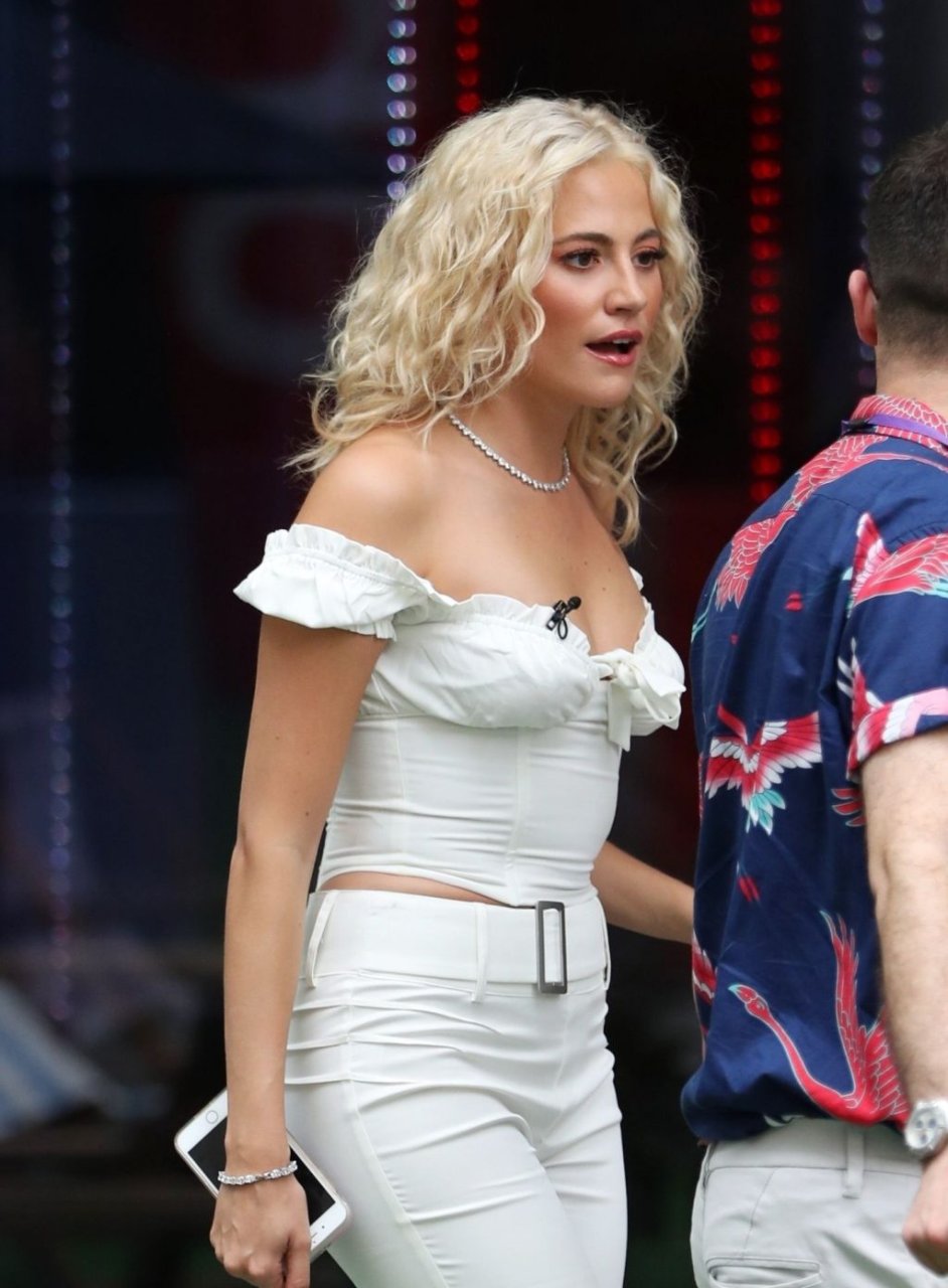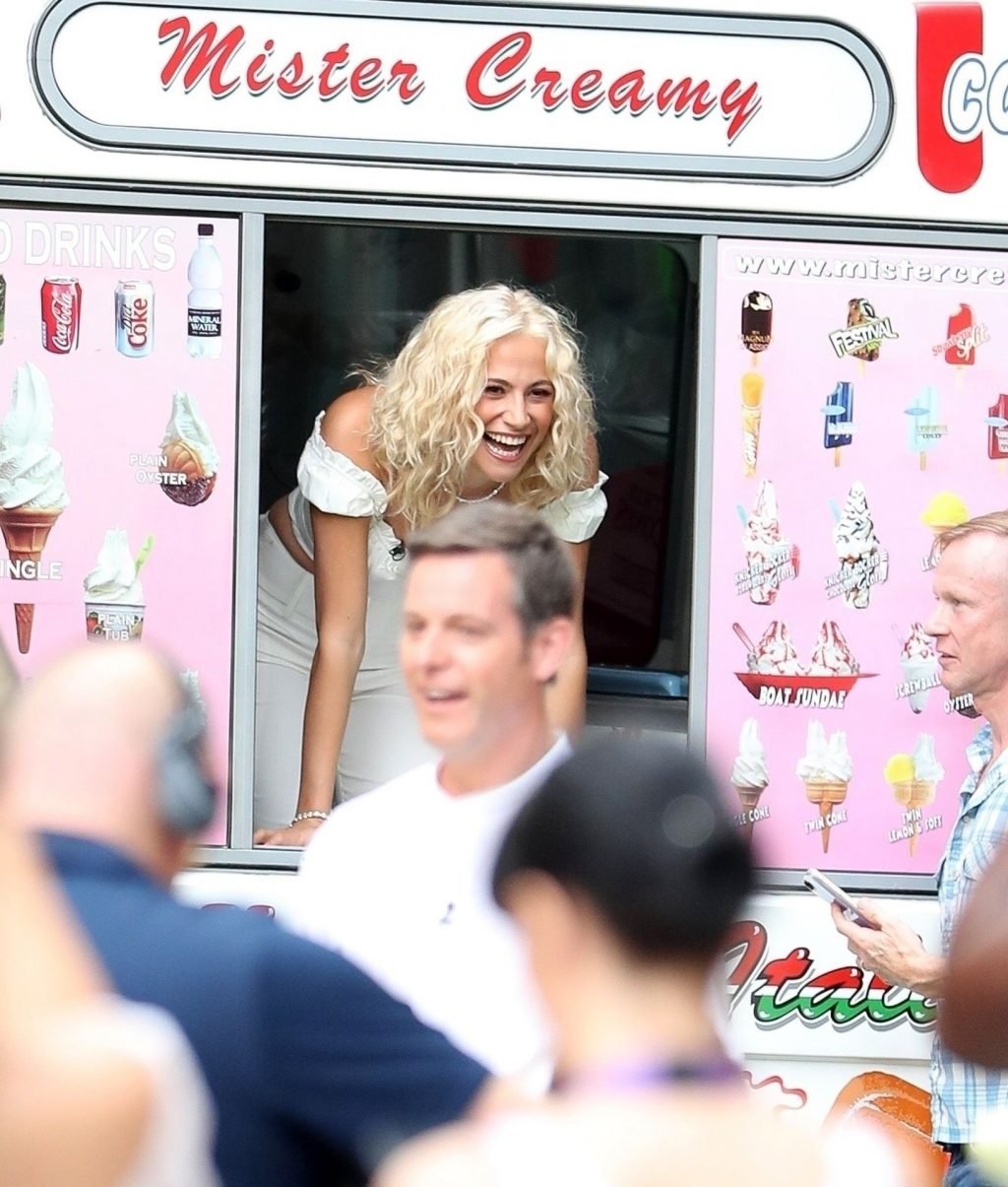 Pixie Lott faz uma aparição muito ousada arriscando um desastre no guarda-roupa enquanto serve sorvete ao vivo no The One Show durante o horário de pico de audiência – Londres, 25/07/2019.