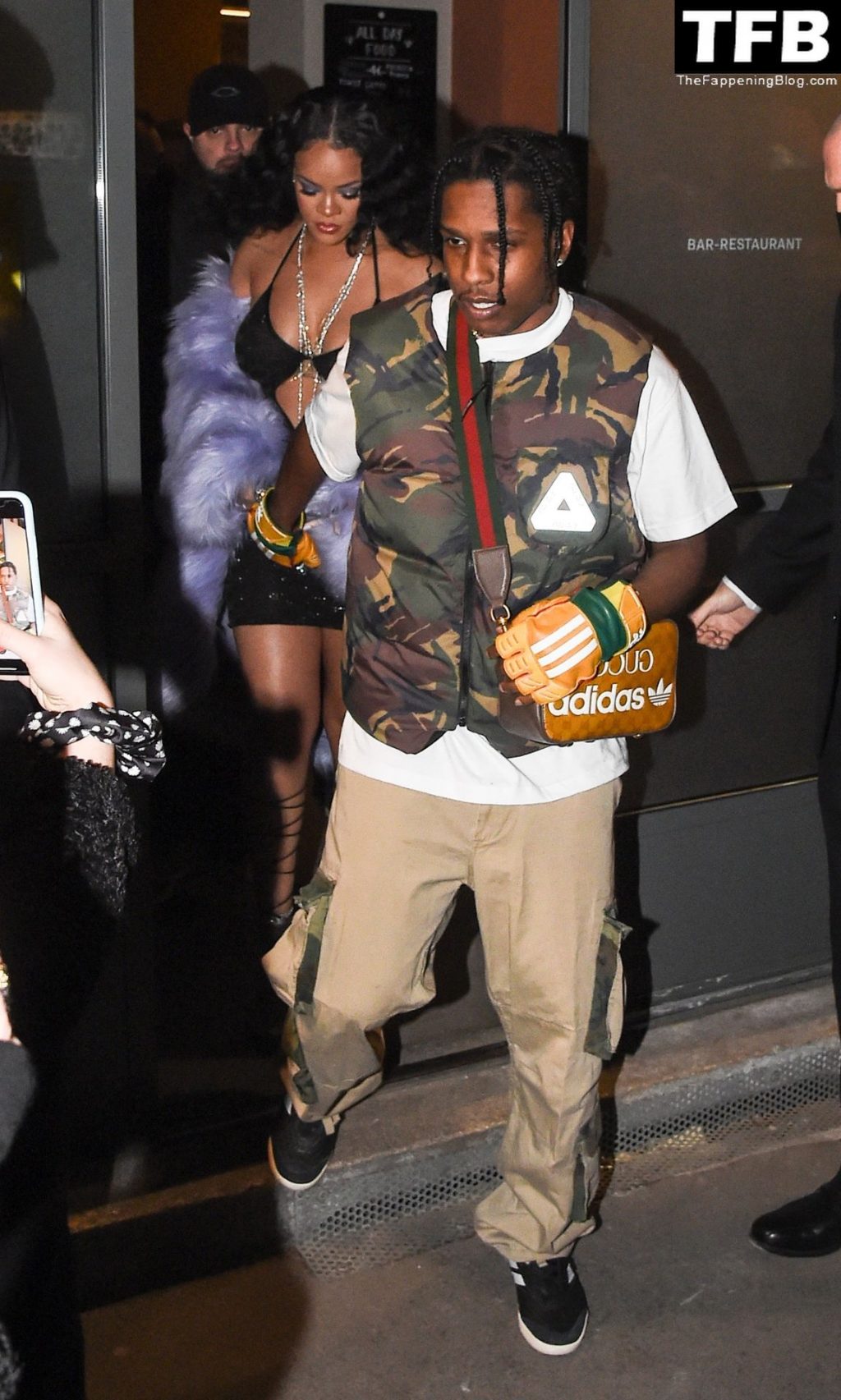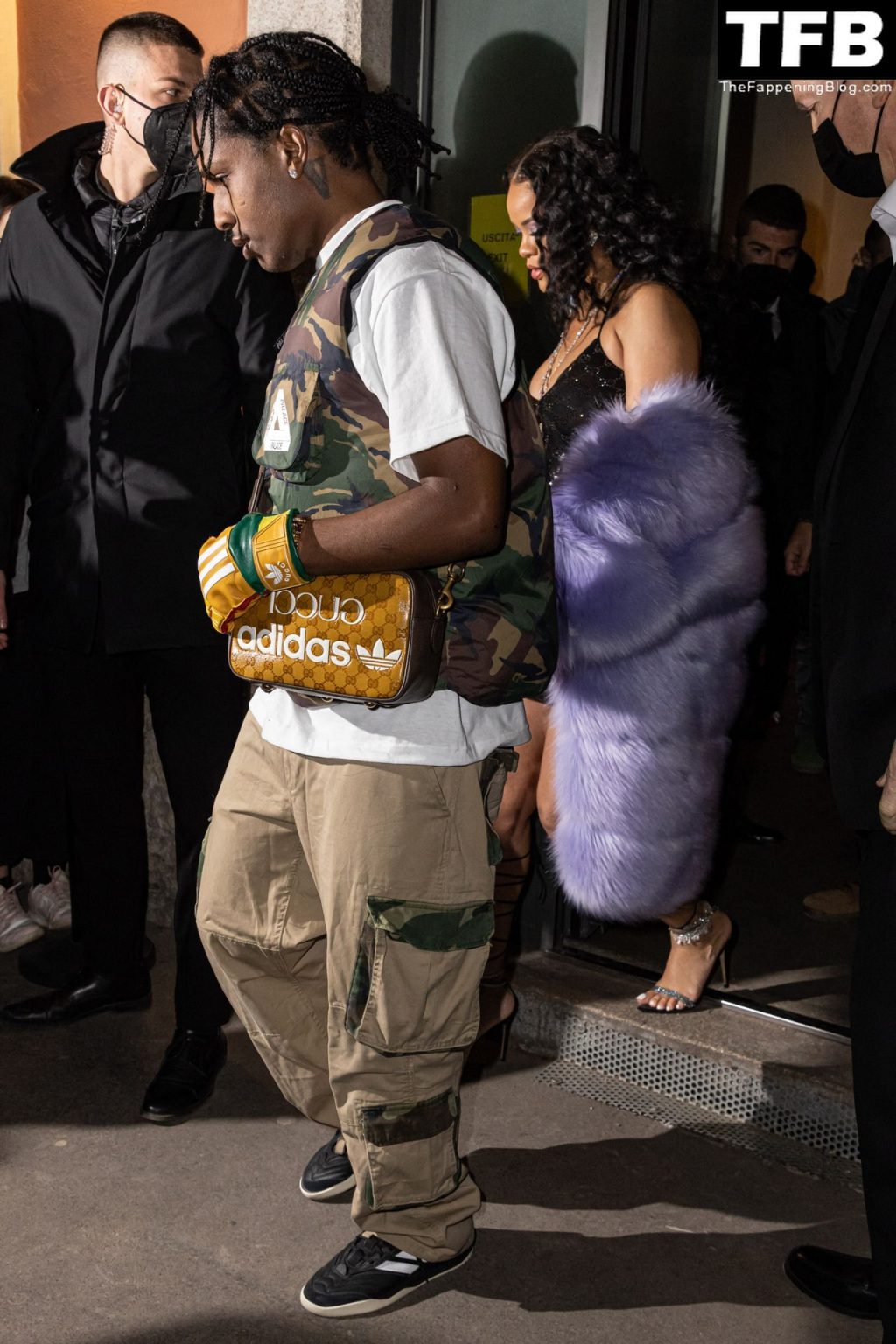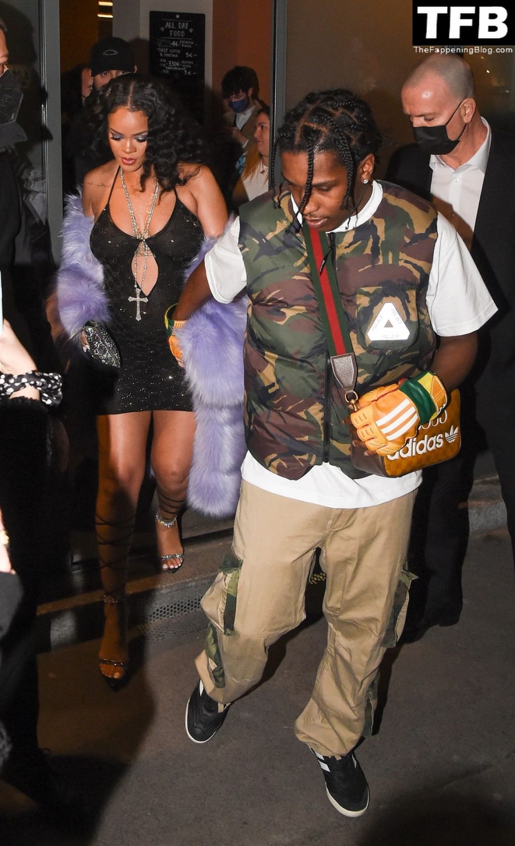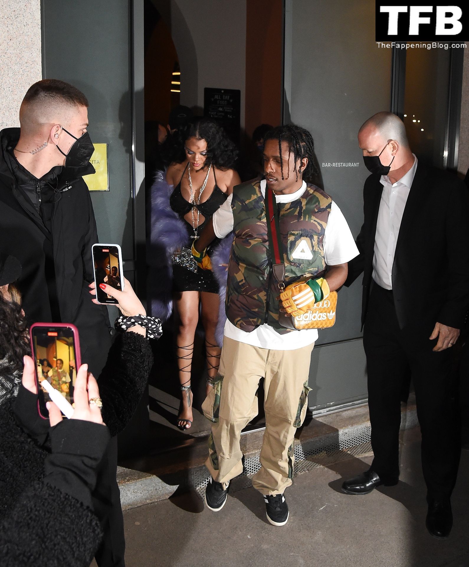 Rihanna grávida e o rapper A$AP Rocky deixam seu hotel e participam da After Party do Desfile de Moda Gucci em Milão, 25/02/2022.