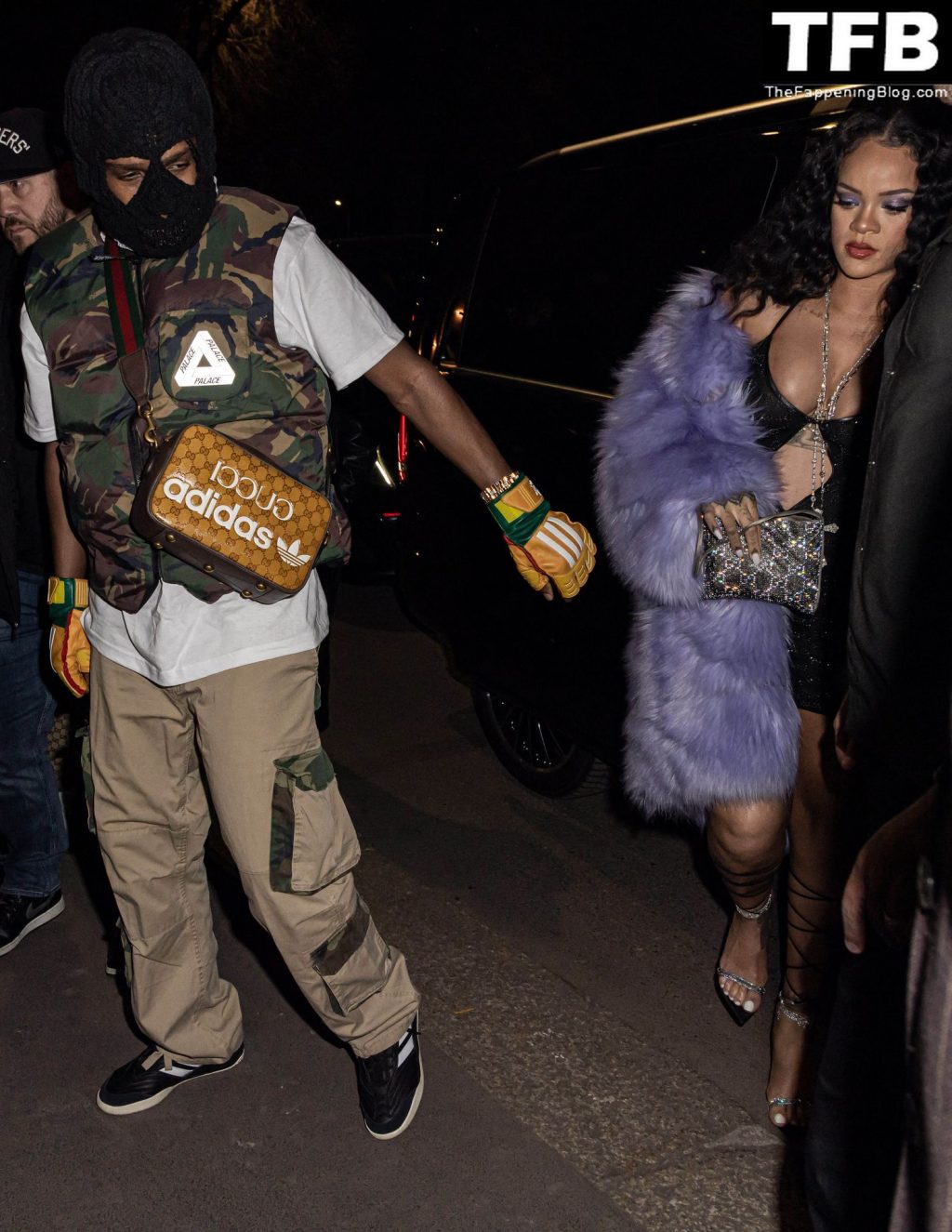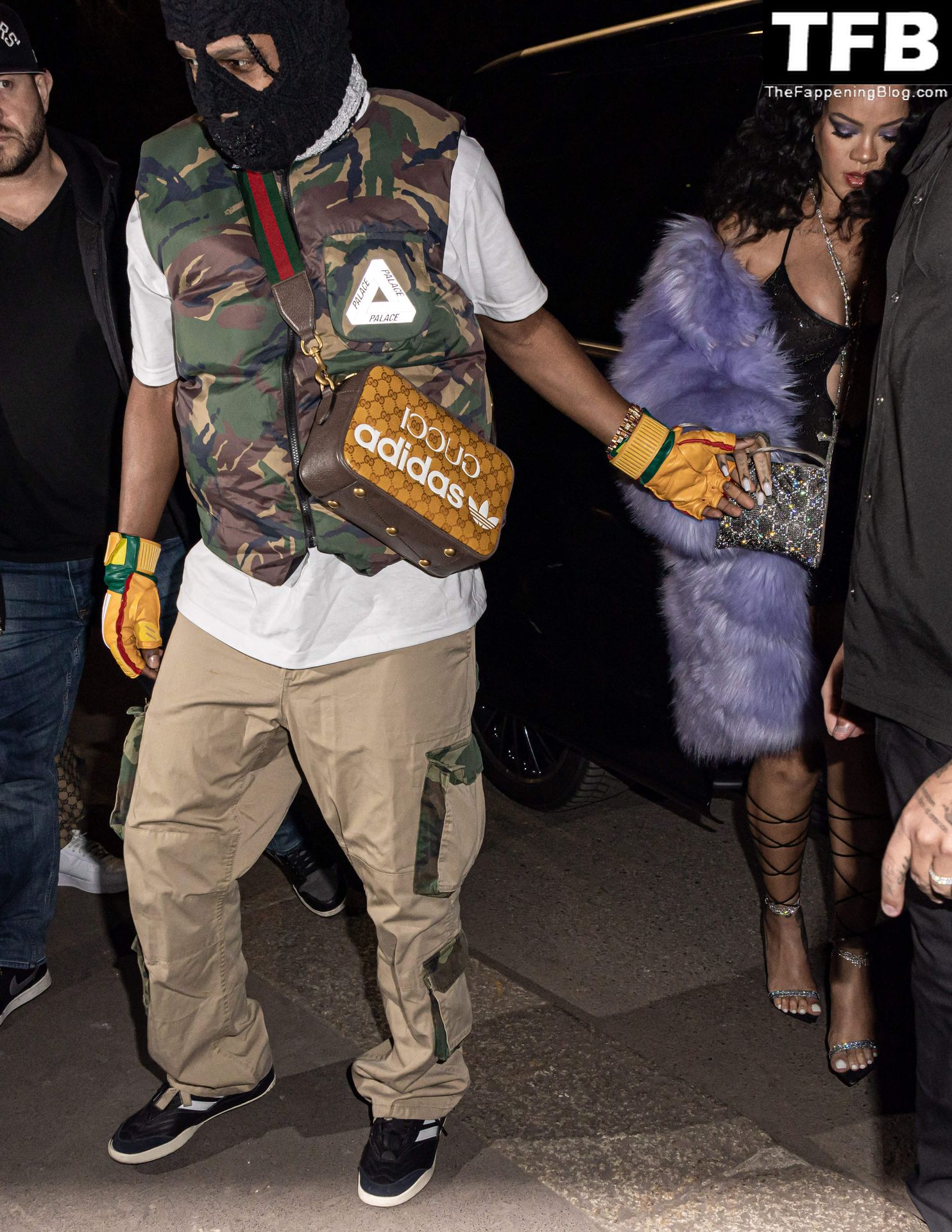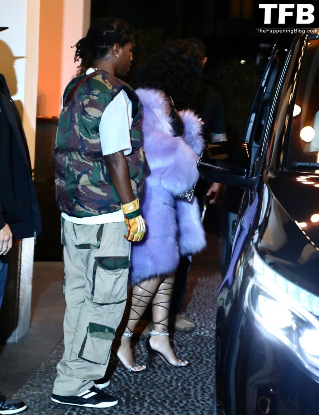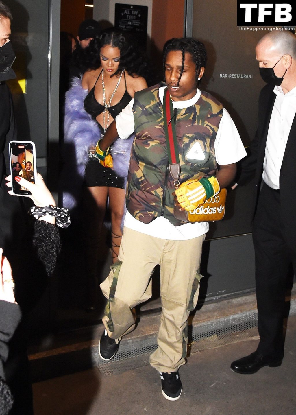 Rihanna grávida e o rapper A$AP Rocky deixam seu hotel e participam da After Party do Desfile de Moda Gucci em Milão, 25/02/2022.