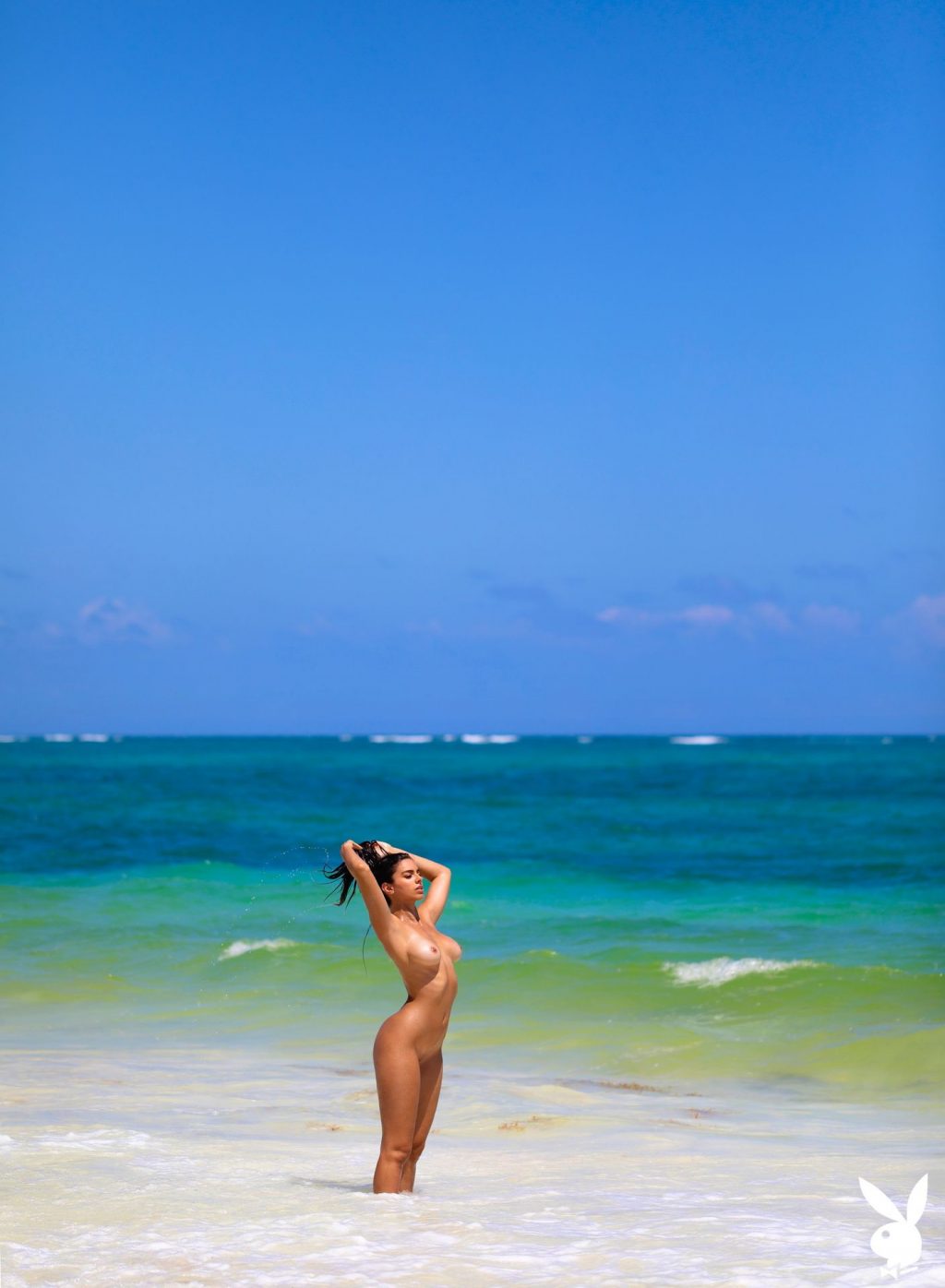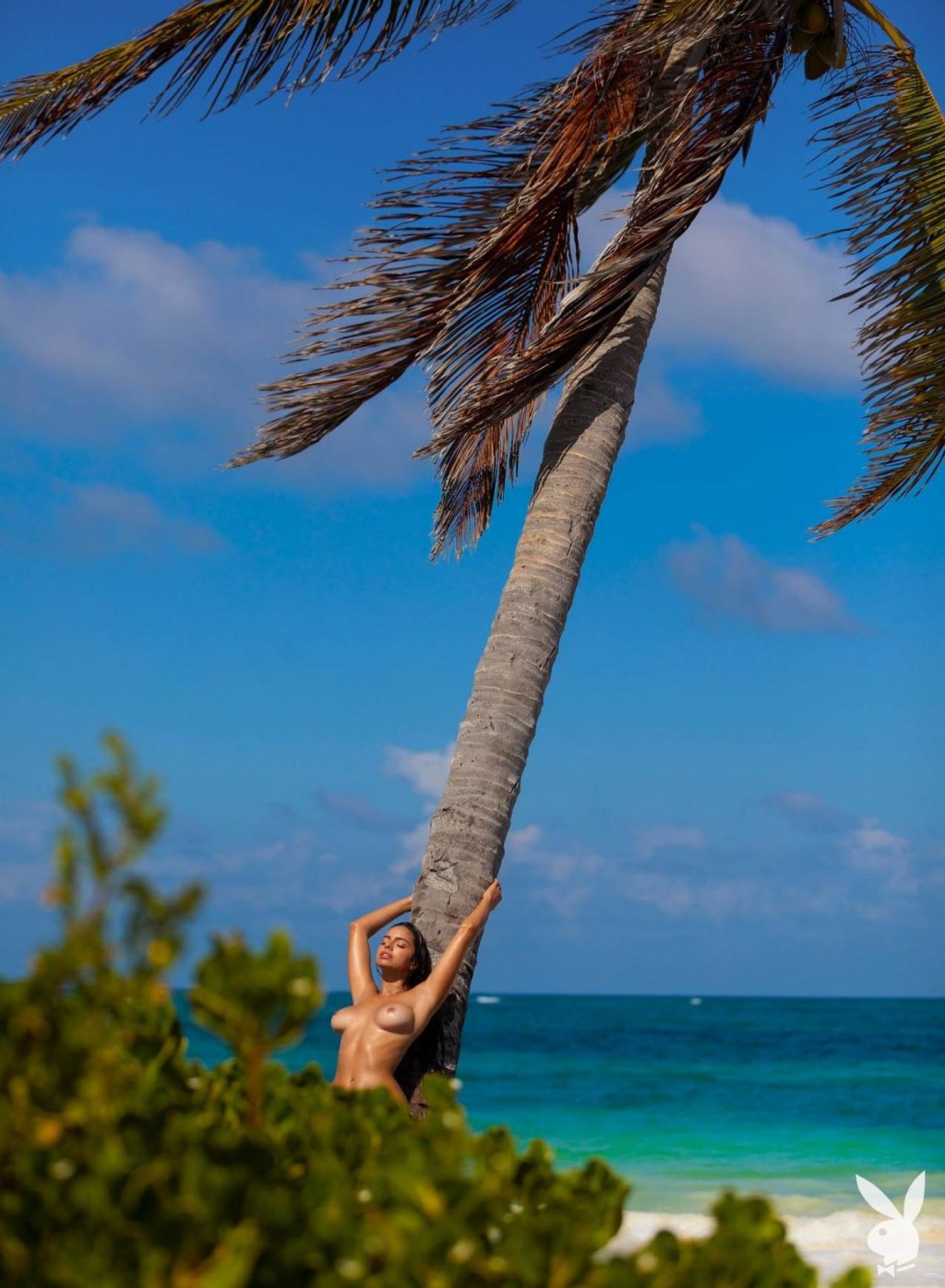 Priscilla Huggins Ortiz exibe seu corpo quente e nu na praia em Tulum, México, em um ensaio fotográfico de Ana Dias para a Playboy (2020).