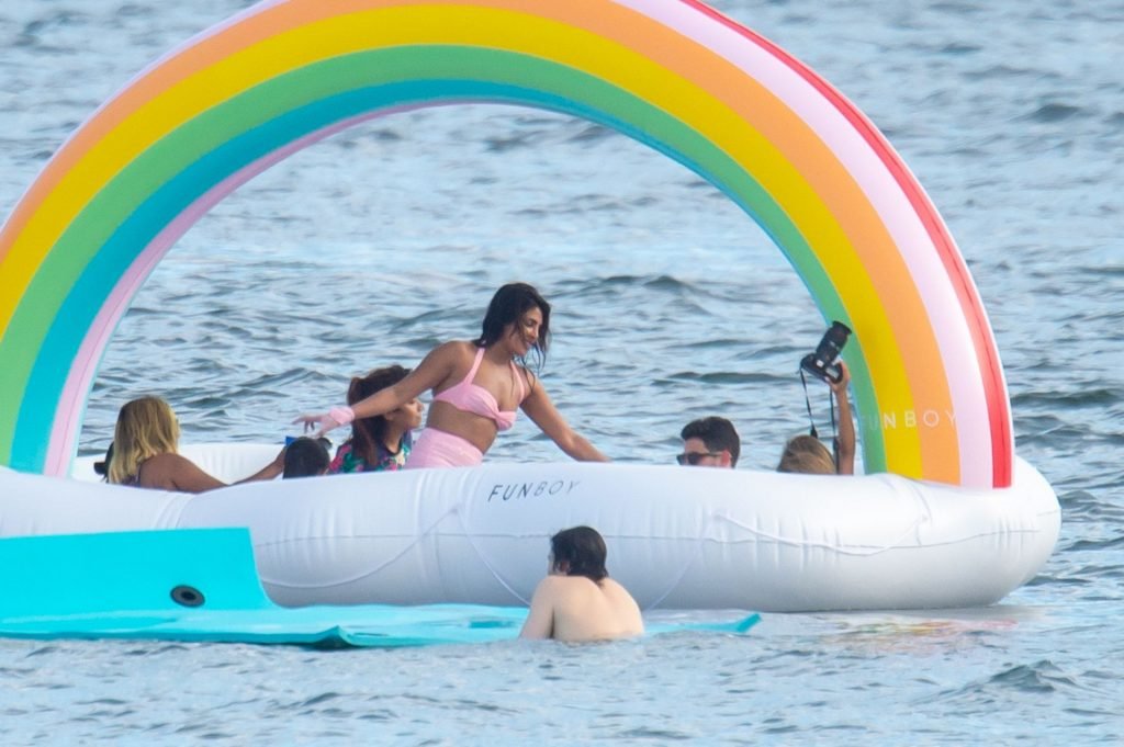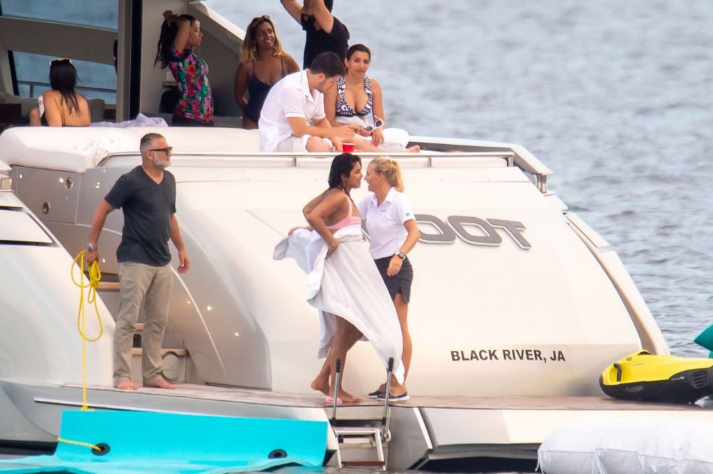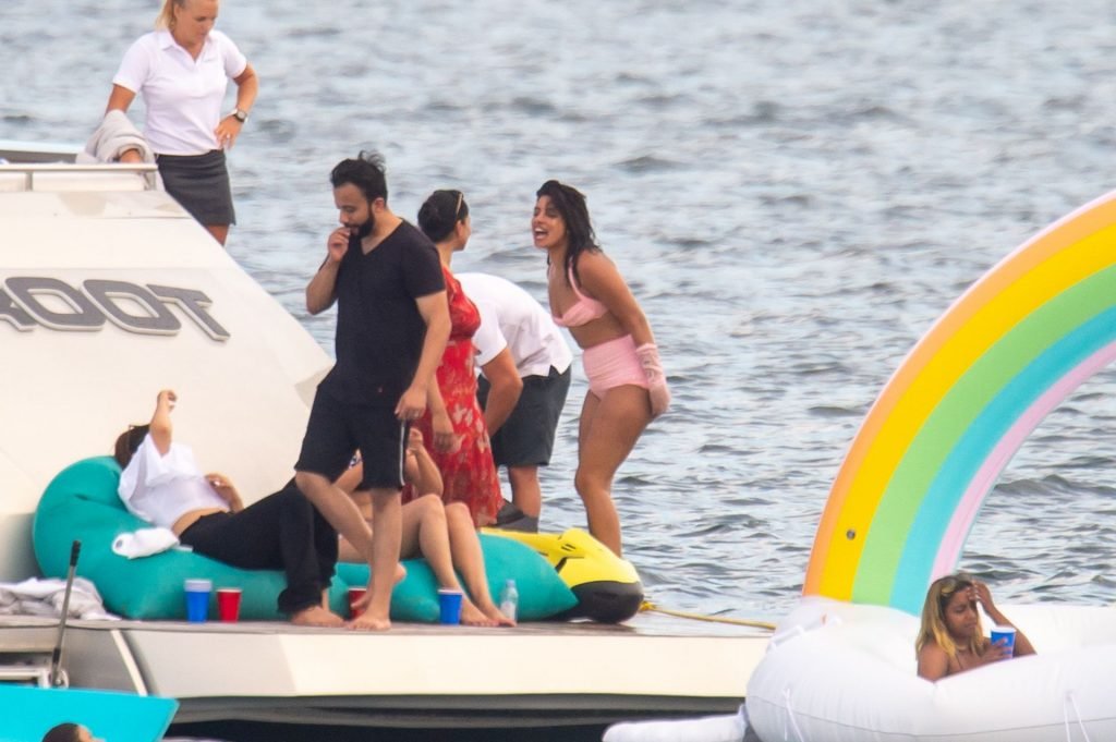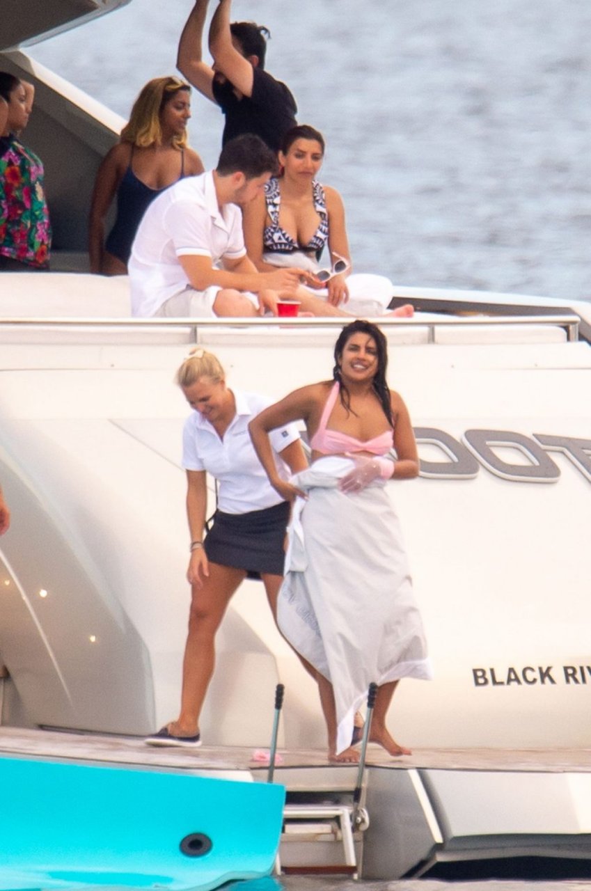 Priyanka trocou para uma combinação incomum de biquíni rosa de cintura alta com luvas combinando antes de acelerar pela baía no jet ski. Houve muitas risadas quando ela caiu na água, lutou para se arrastar de volta ao flutuador e em um momento pareceu puxar um desconforto na roupa íntima. O casal parecia tão apaixonado como sempre, conversando, abraçando, beijando e revezando-se no colo um do outro. Mais tarde, ao saírem para o dia, ambos foram vistos fumando e conversando com seus amigos no convés.