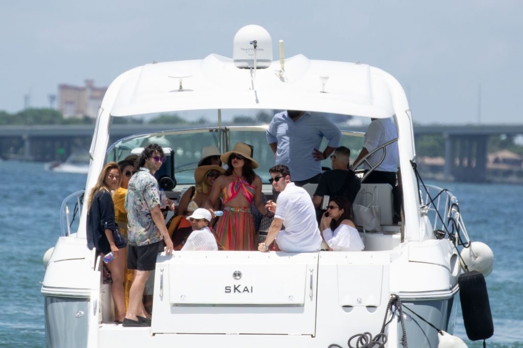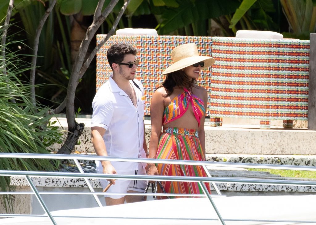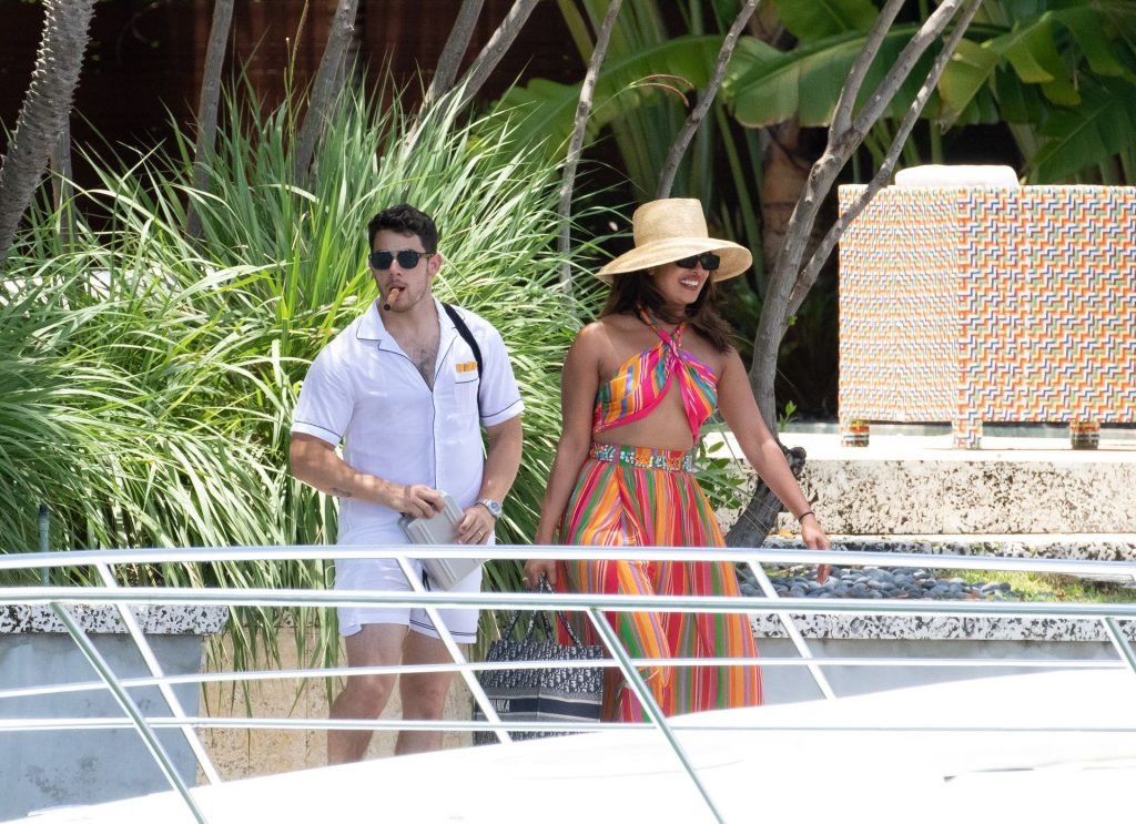 Após uma festa até tarde no clube Liv, Nick e Priyanka embarcaram em um iate deslumbrante na tarde de sexta-feira. A atriz foi fotografada usando um conjunto colorido listrado composto por uma saia longa e um top revelador estilo biquíni combinado com um grande chapéu.