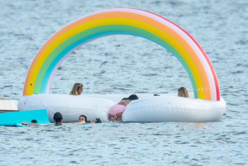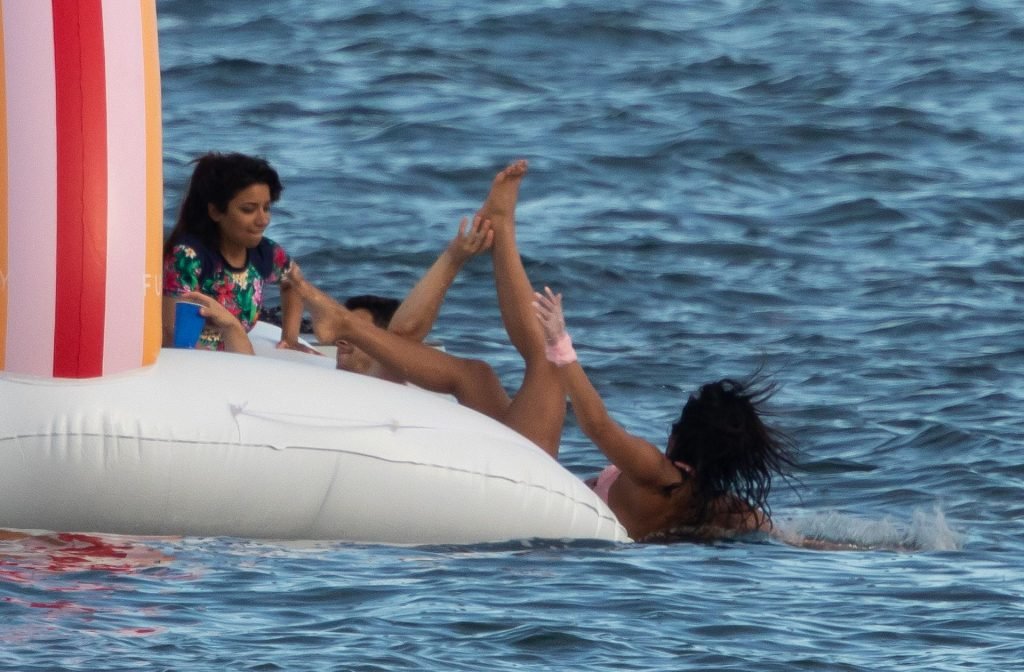 Depois, juntou-se a eles um barco ainda maior, o Groot, propriedade do rei da vida noturna de Miami, David Grutman, e seguiram juntos para as águas próximas a Key Biscayne, onde ancoraram e tiraram alguns brinquedos aquáticos, incluindo um grande flutuador inflável com um arco-íris e um jet ski.