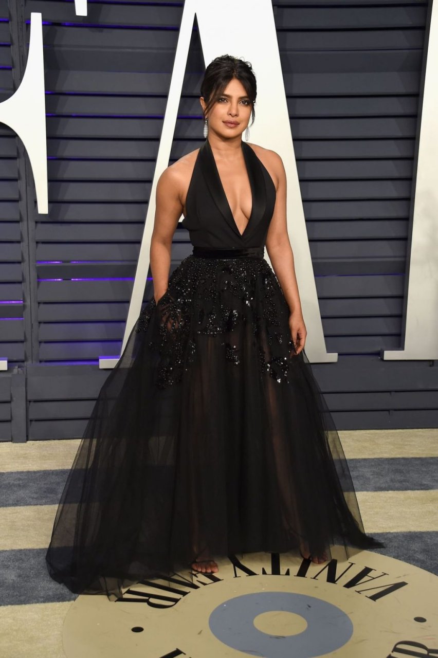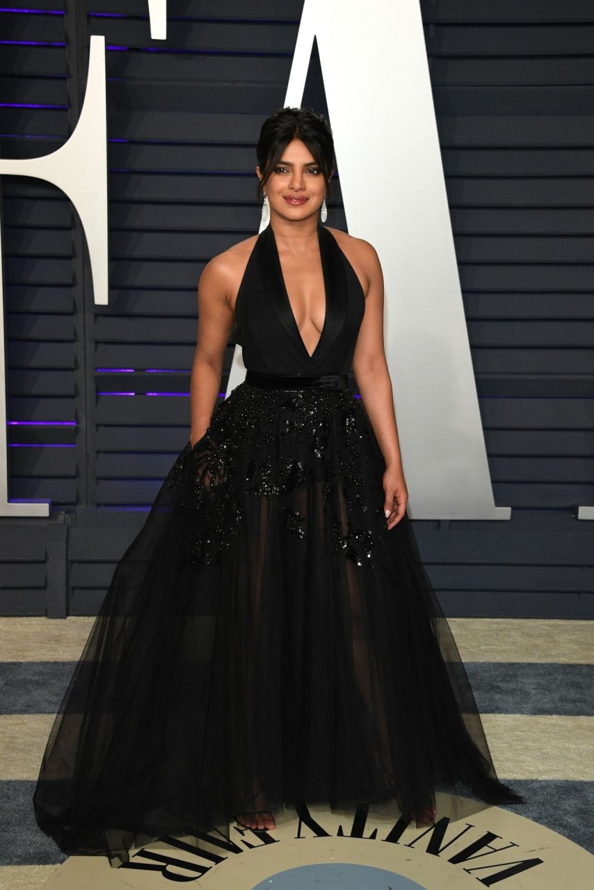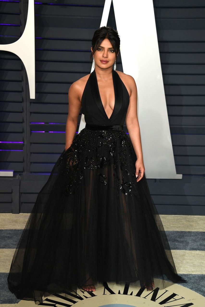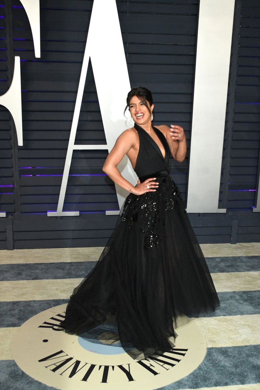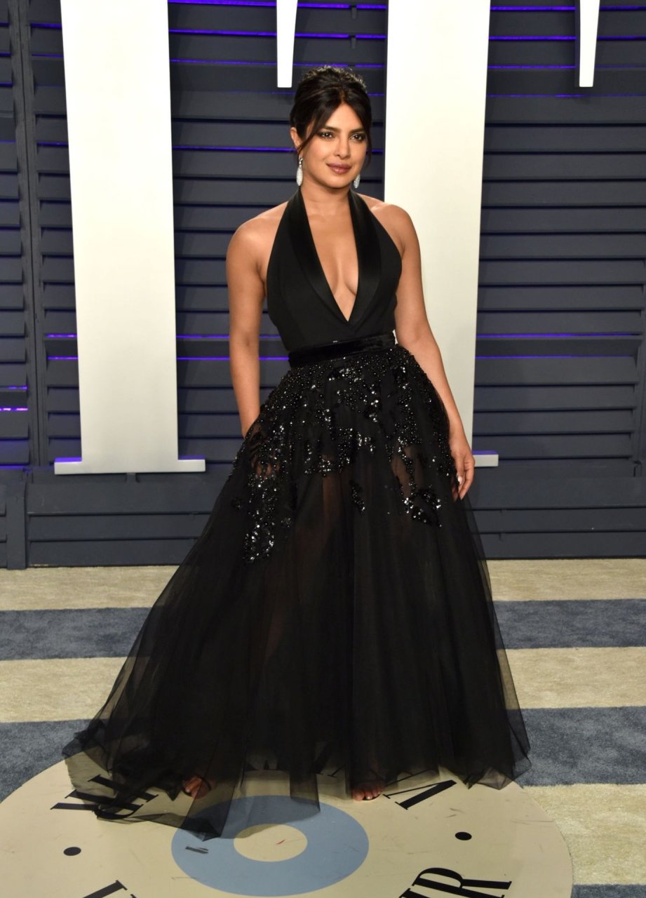 A atriz Priyanka Chopra mostra seu decote usando um vestido preto na Festa do Oscar Vanity Fair 2019 em Beverly Hills, 24/02/2019.