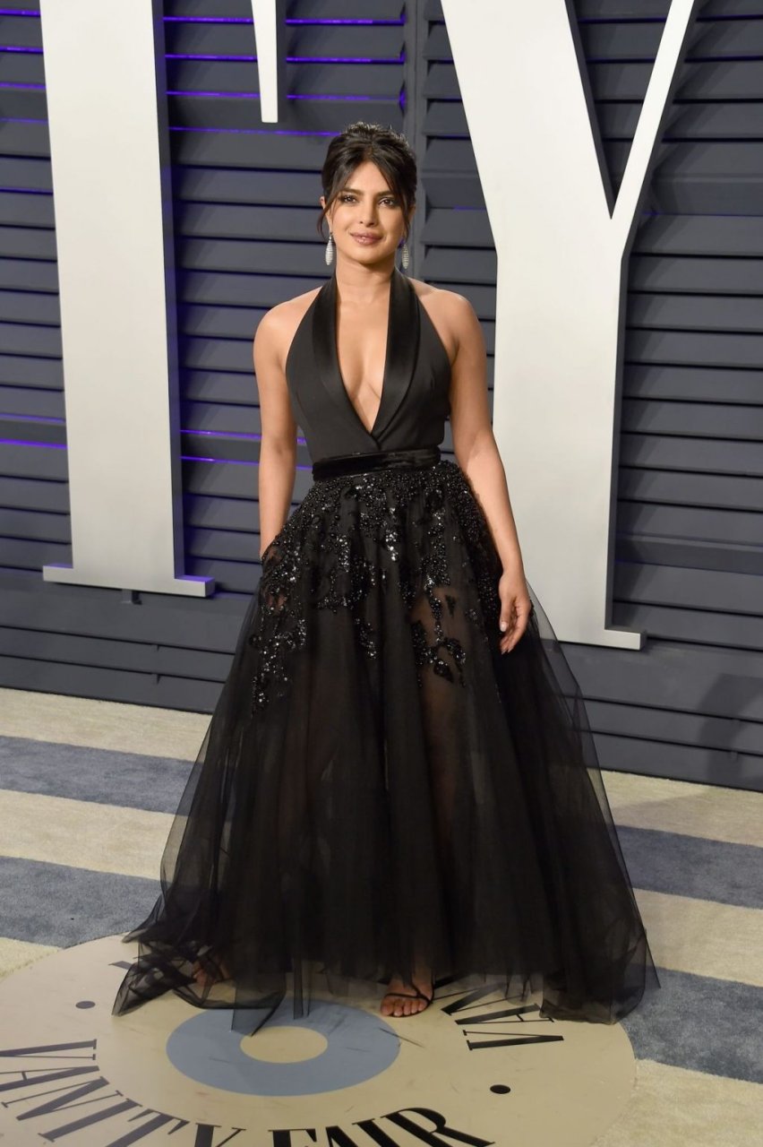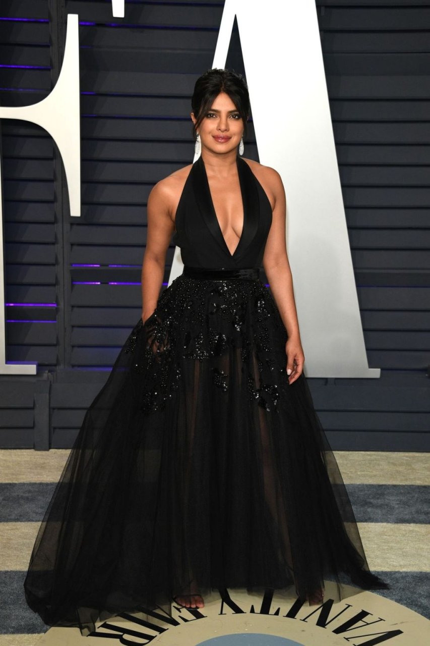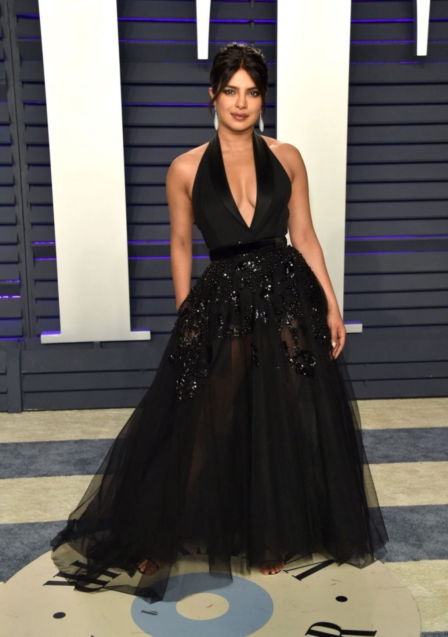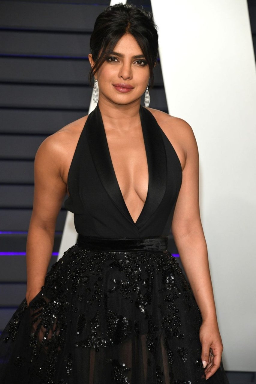 A atriz Priyanka Chopra mostra seu decote usando um vestido preto na Festa do Oscar Vanity Fair 2019 em Beverly Hills, 24/02/2019.