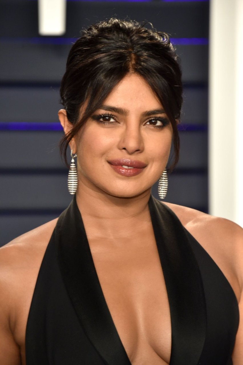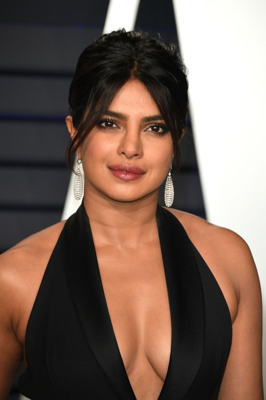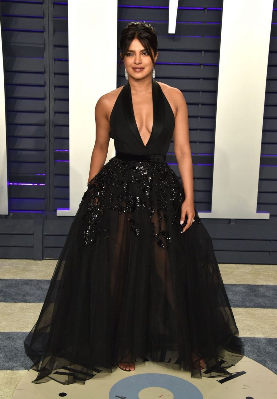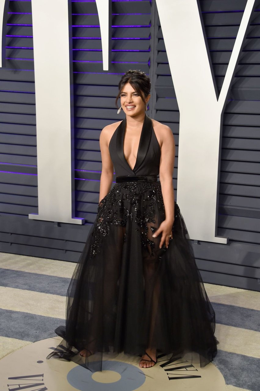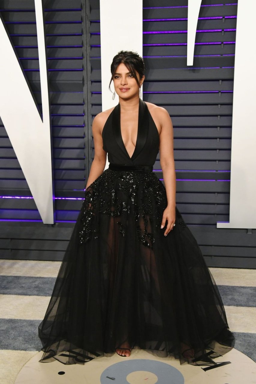 A atriz Priyanka Chopra mostra seu decote usando um vestido preto na Festa do Oscar Vanity Fair 2019 em Beverly Hills, 24/02/2019.