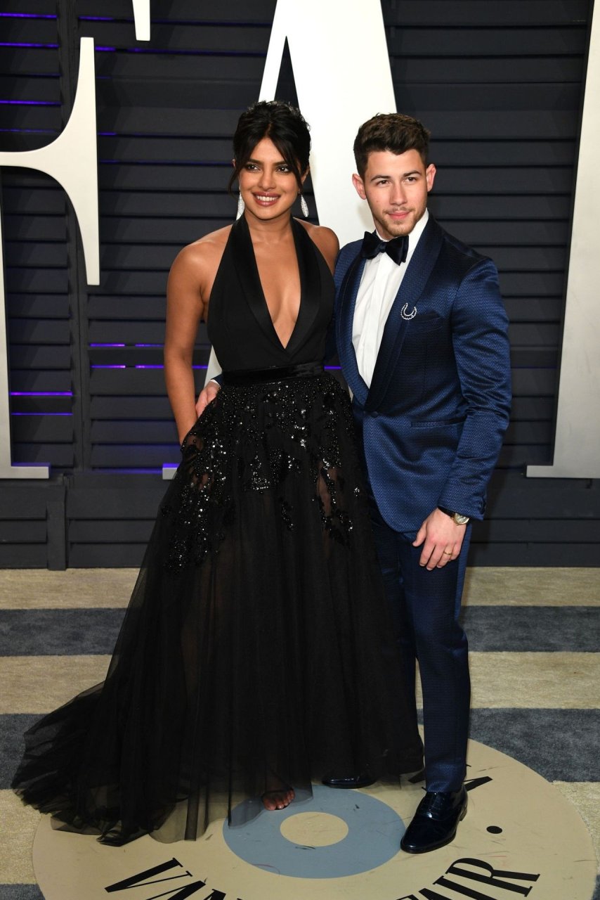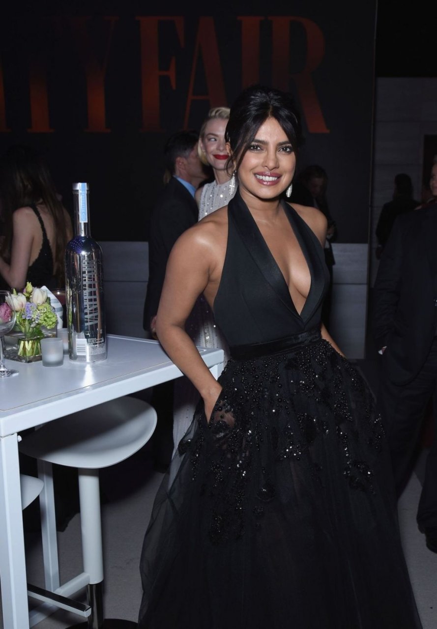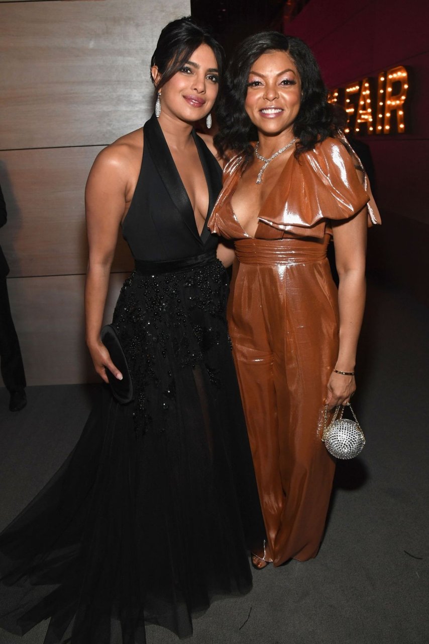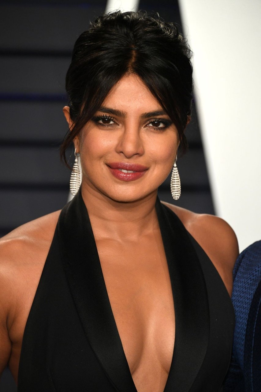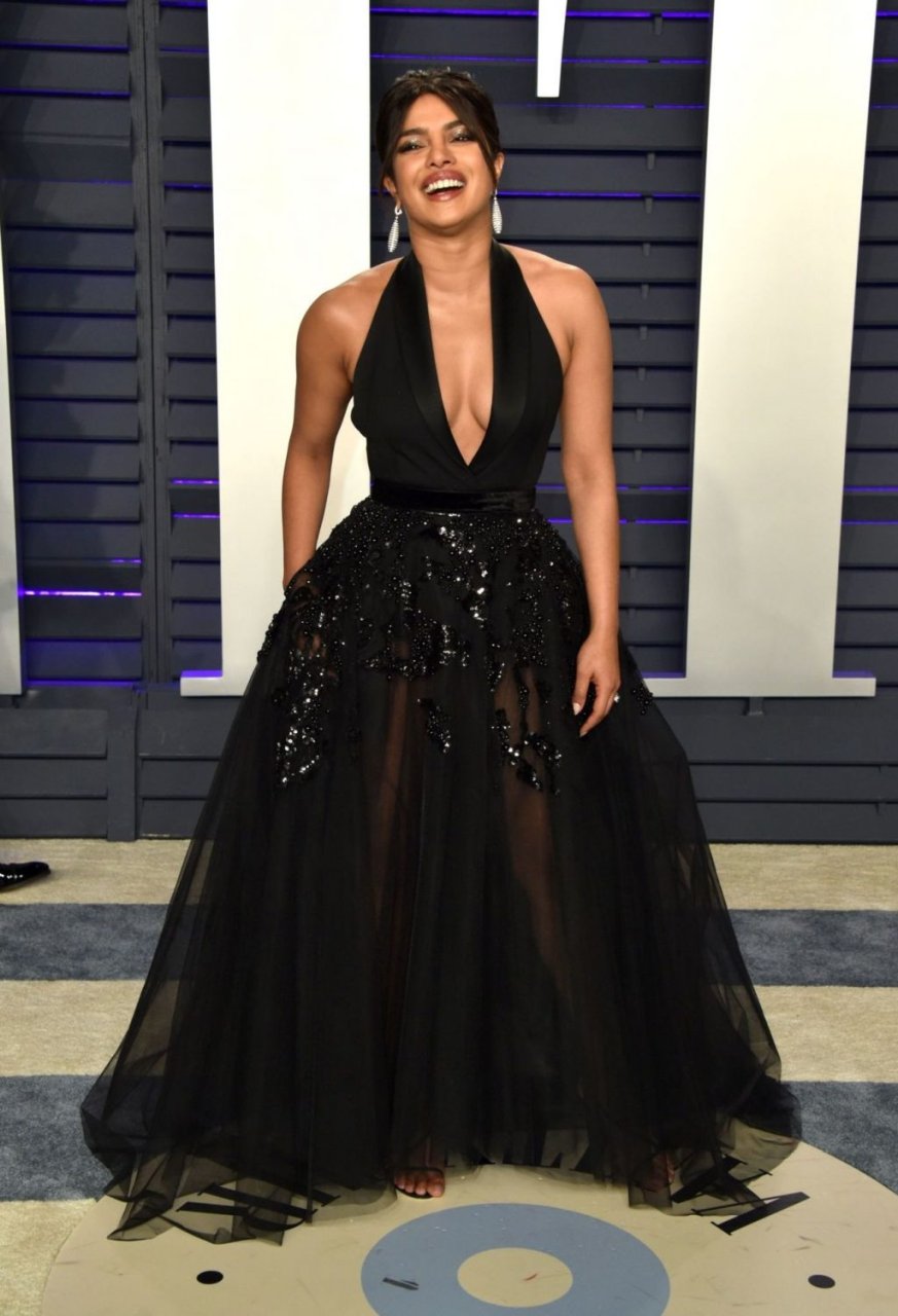 A atriz Priyanka Chopra mostra seu decote usando um vestido preto na Festa do Oscar Vanity Fair 2019 em Beverly Hills, 24/02/2019.