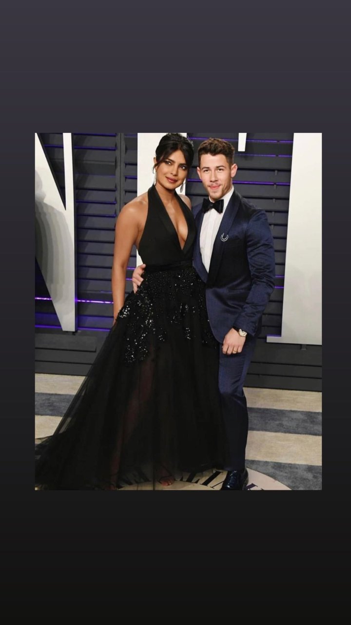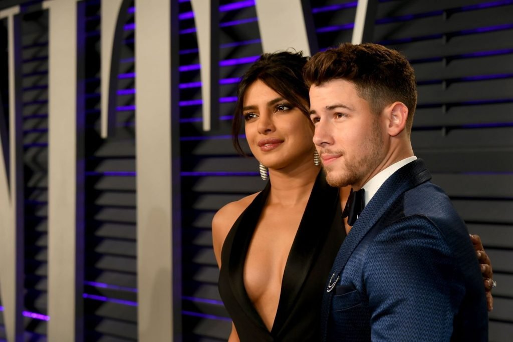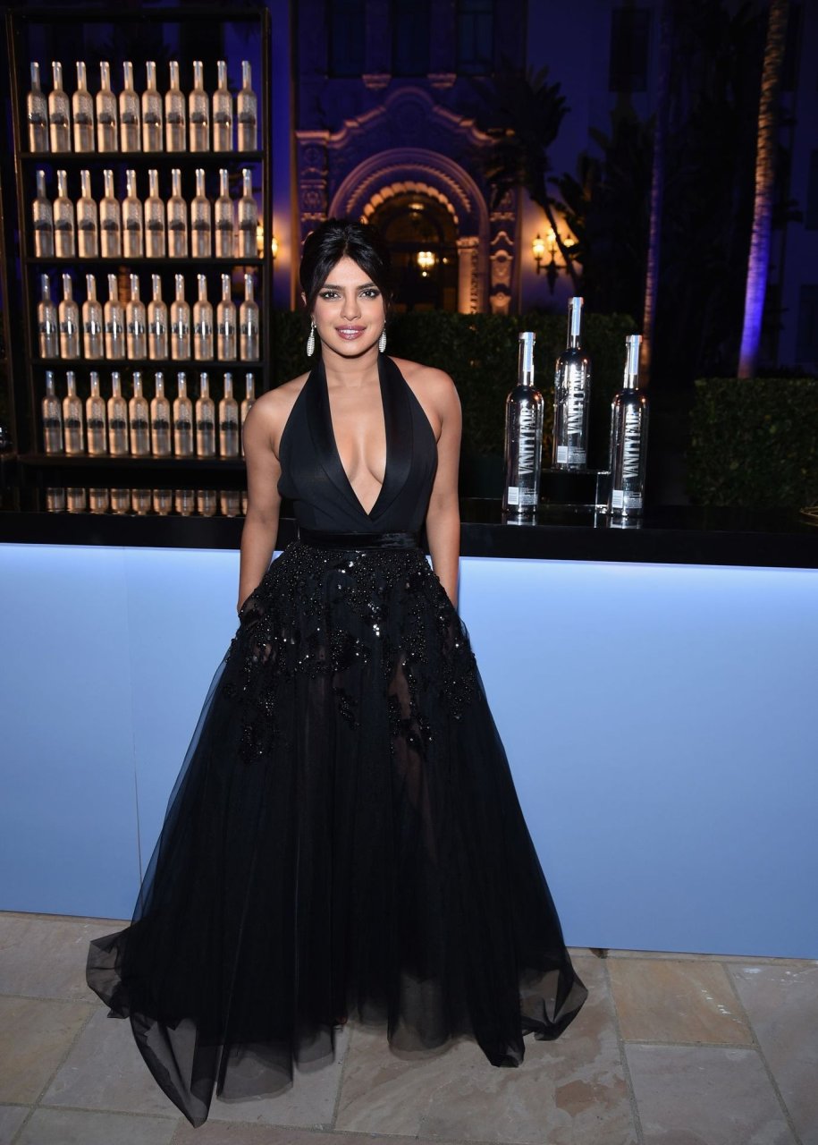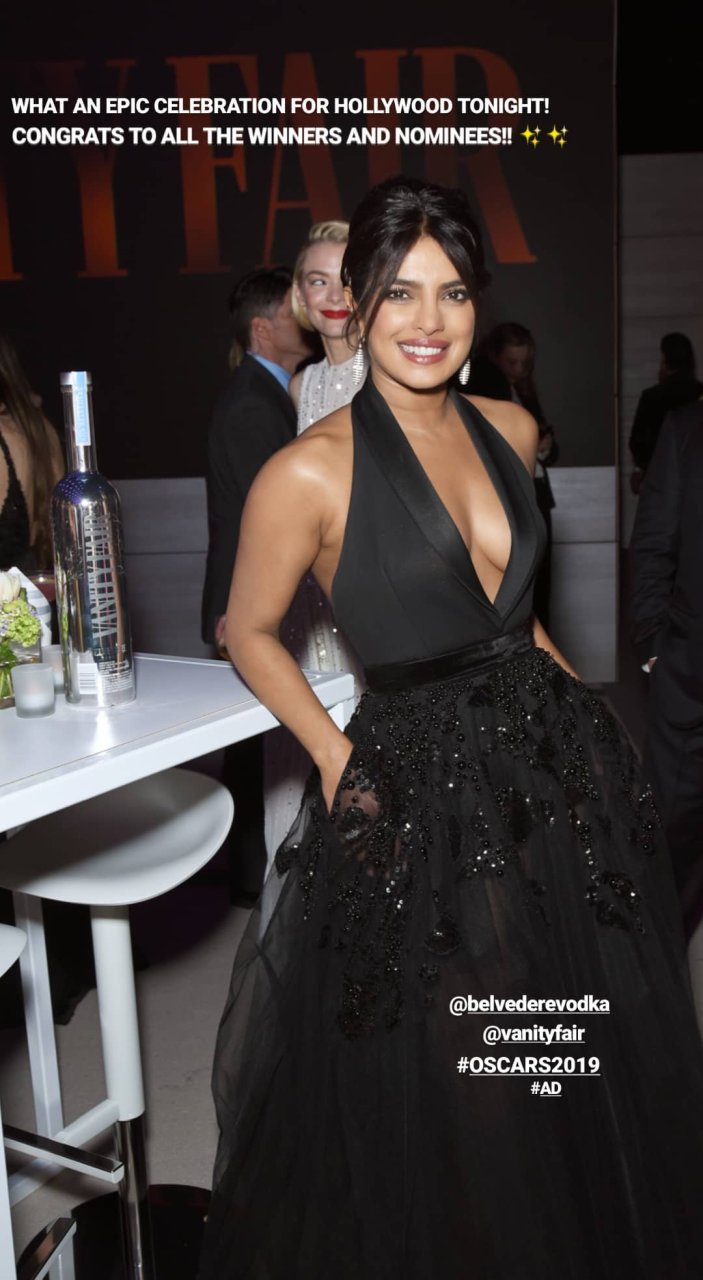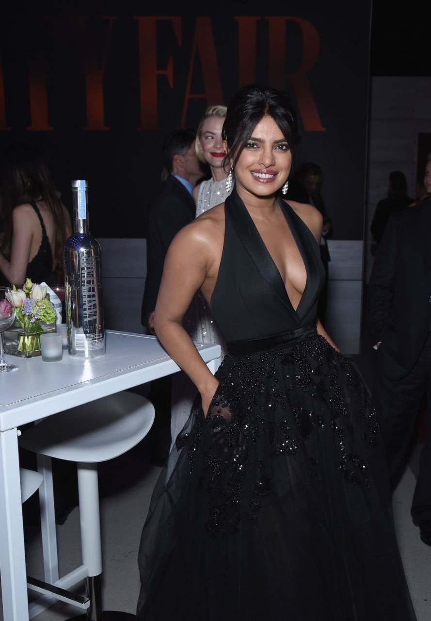 A atriz Priyanka Chopra mostra seu decote usando um vestido preto na Festa do Oscar Vanity Fair 2019 em Beverly Hills, 24/02/2019.