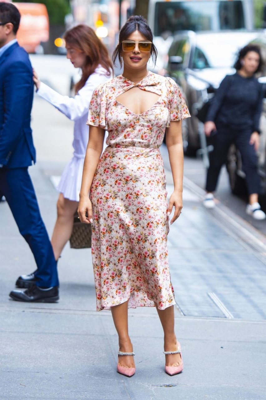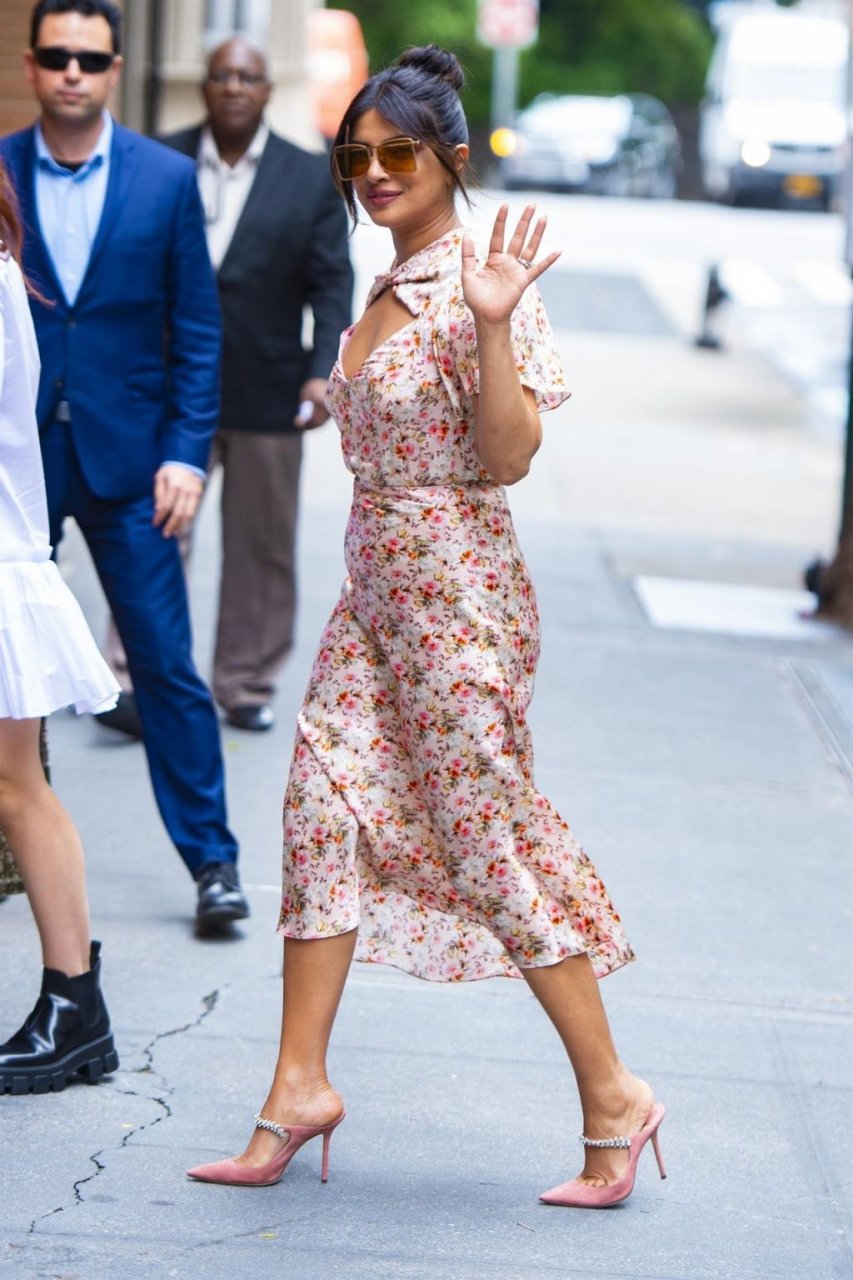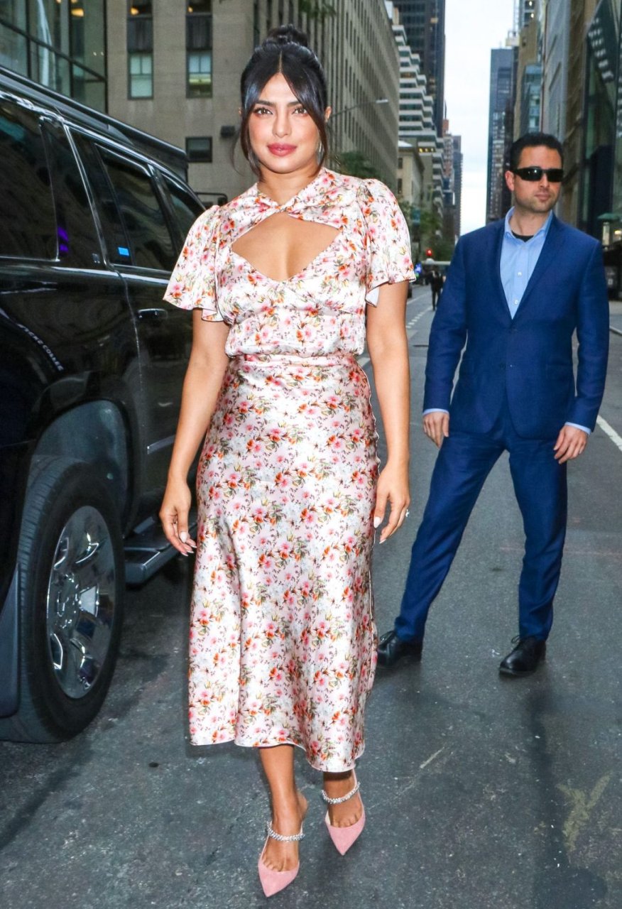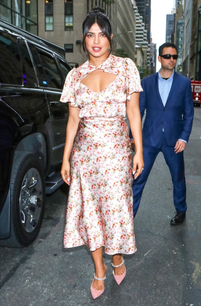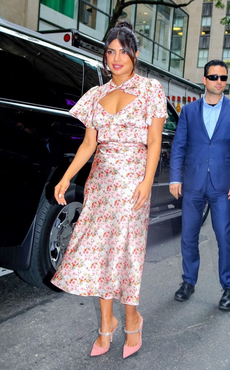 A atriz Priyanka Chopra está deslumbrante em um vestido rosa floral enquanto é vista após visitar The View em Nova York, 08/10/2019.