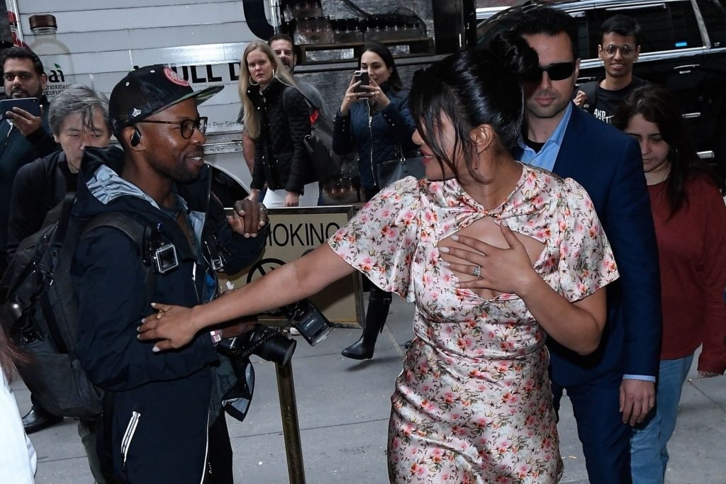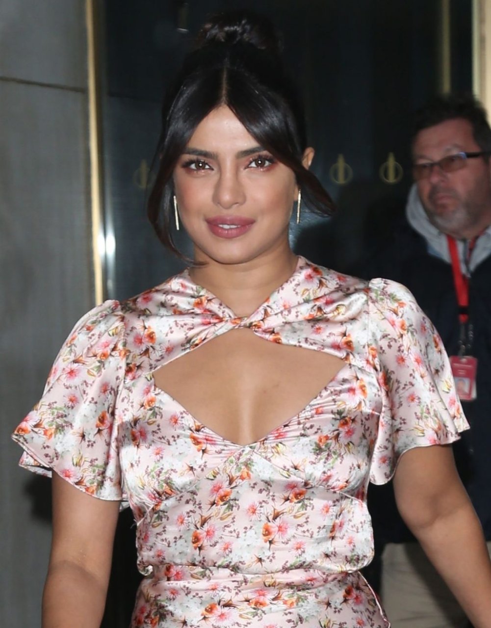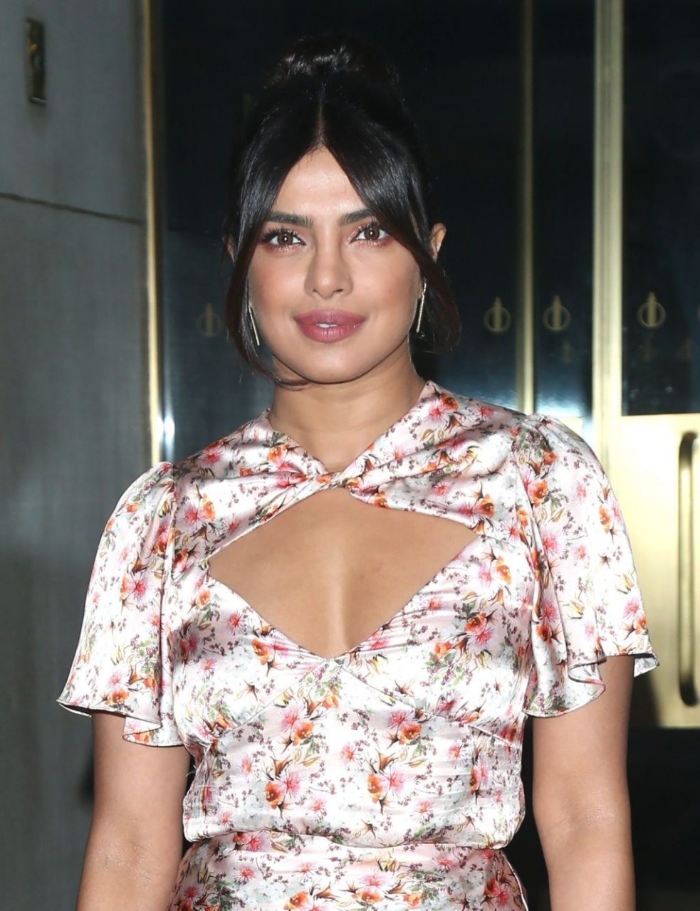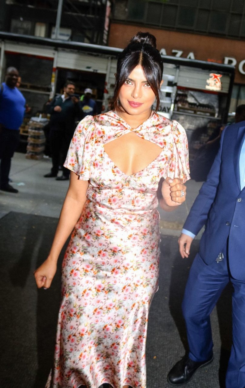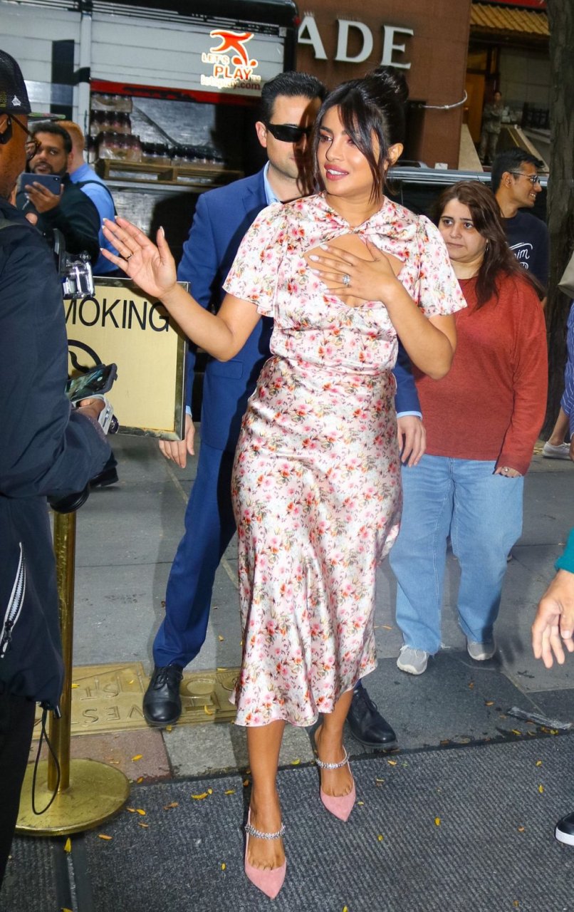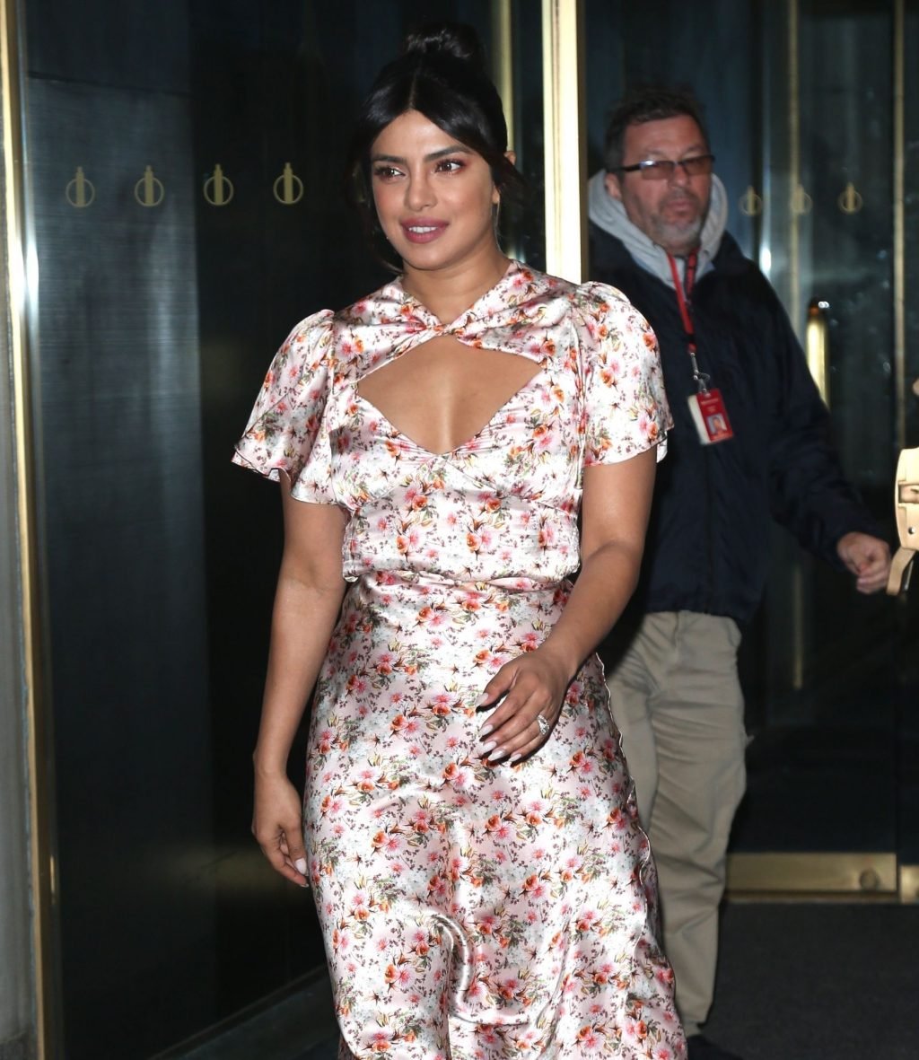 A atriz Priyanka Chopra está deslumbrante em um vestido rosa floral enquanto é vista após visitar The View em Nova York, 08/10/2019.