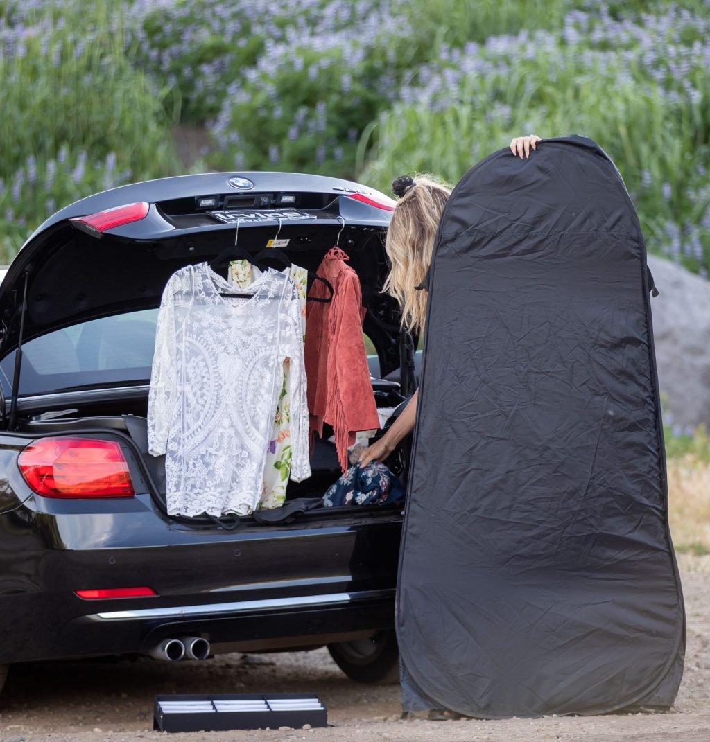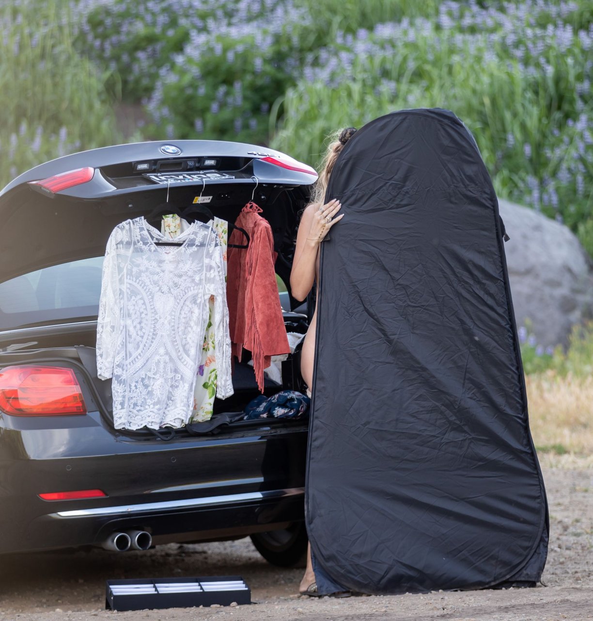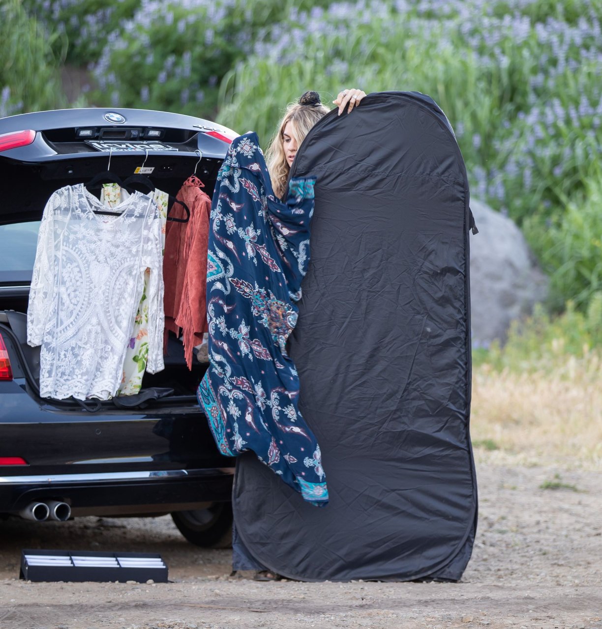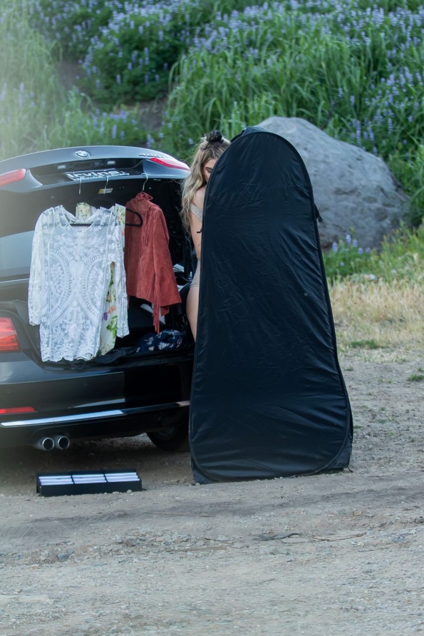 Rachel McCord foi vista em um ensaio fotográfico da Voir Eyewear em Malibu, 09/04/2019. ela cobriu seu corpo nu enquanto trocava de roupa…