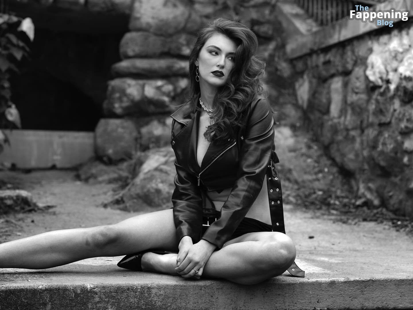 Rachel Pizzolato posa com uma jaqueta de couro e minissaia, exibindo suas curvas deslumbrantes, decote impecável e pernas incríveis em um ensaio fotográfico de Coveney Inc.