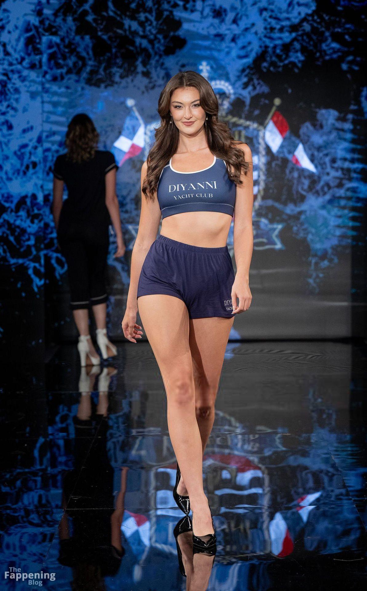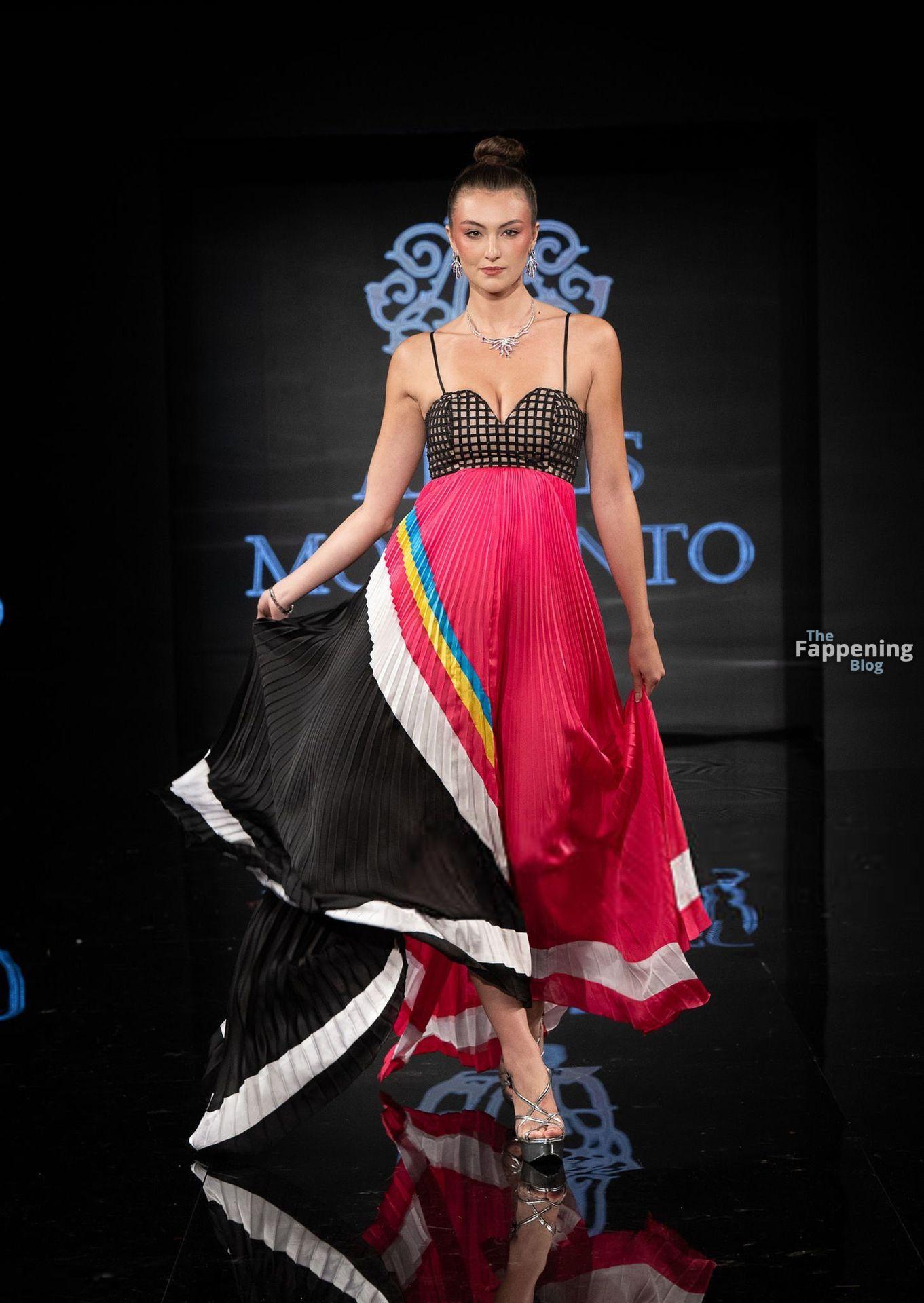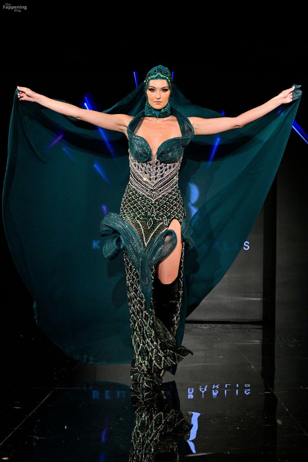Rachel Pizzolato é fotografada na NYFW em seus vestidos transparentes, looks de lingerie e um vestido dourado totalmente chamativo e sem sutiã que mostrava seus seios sensuais na passarela.