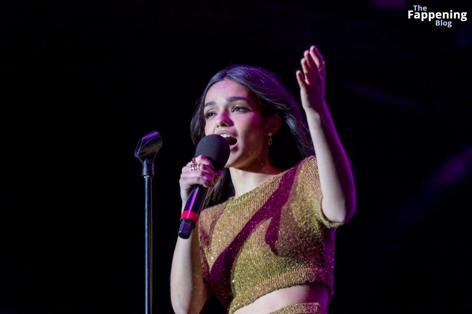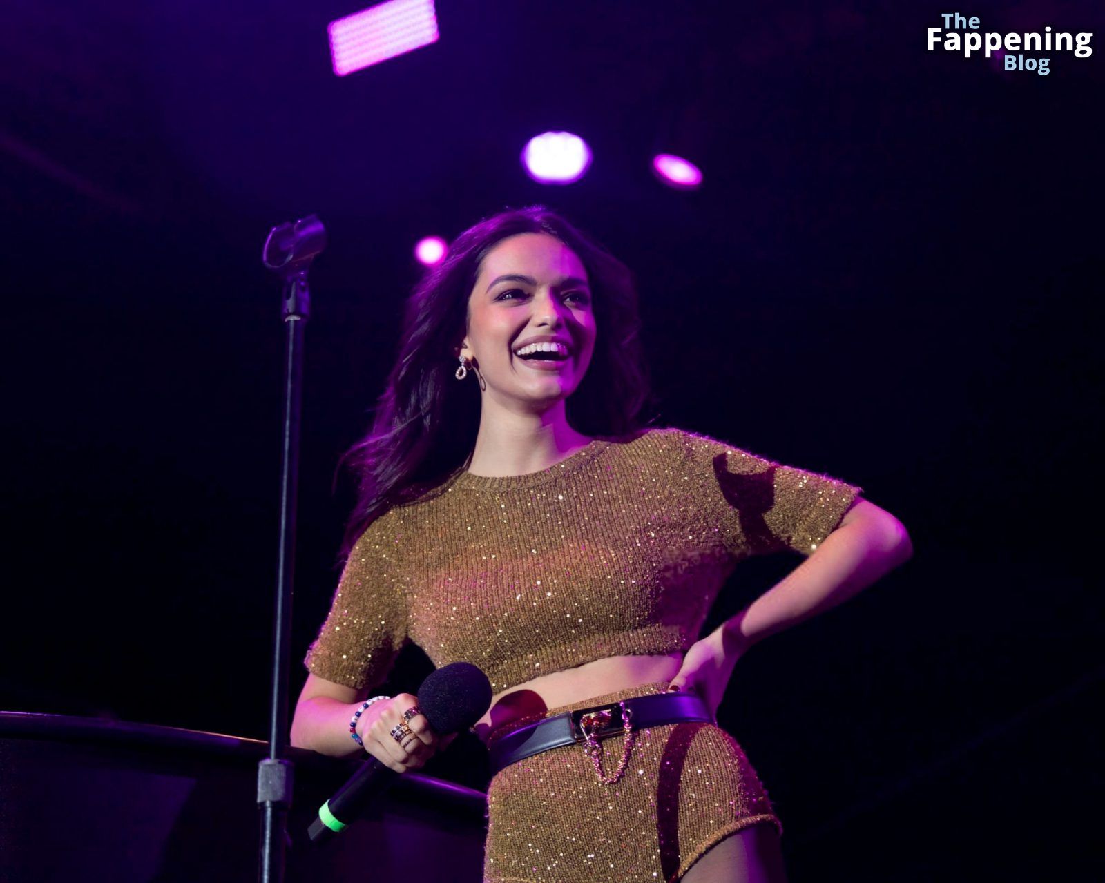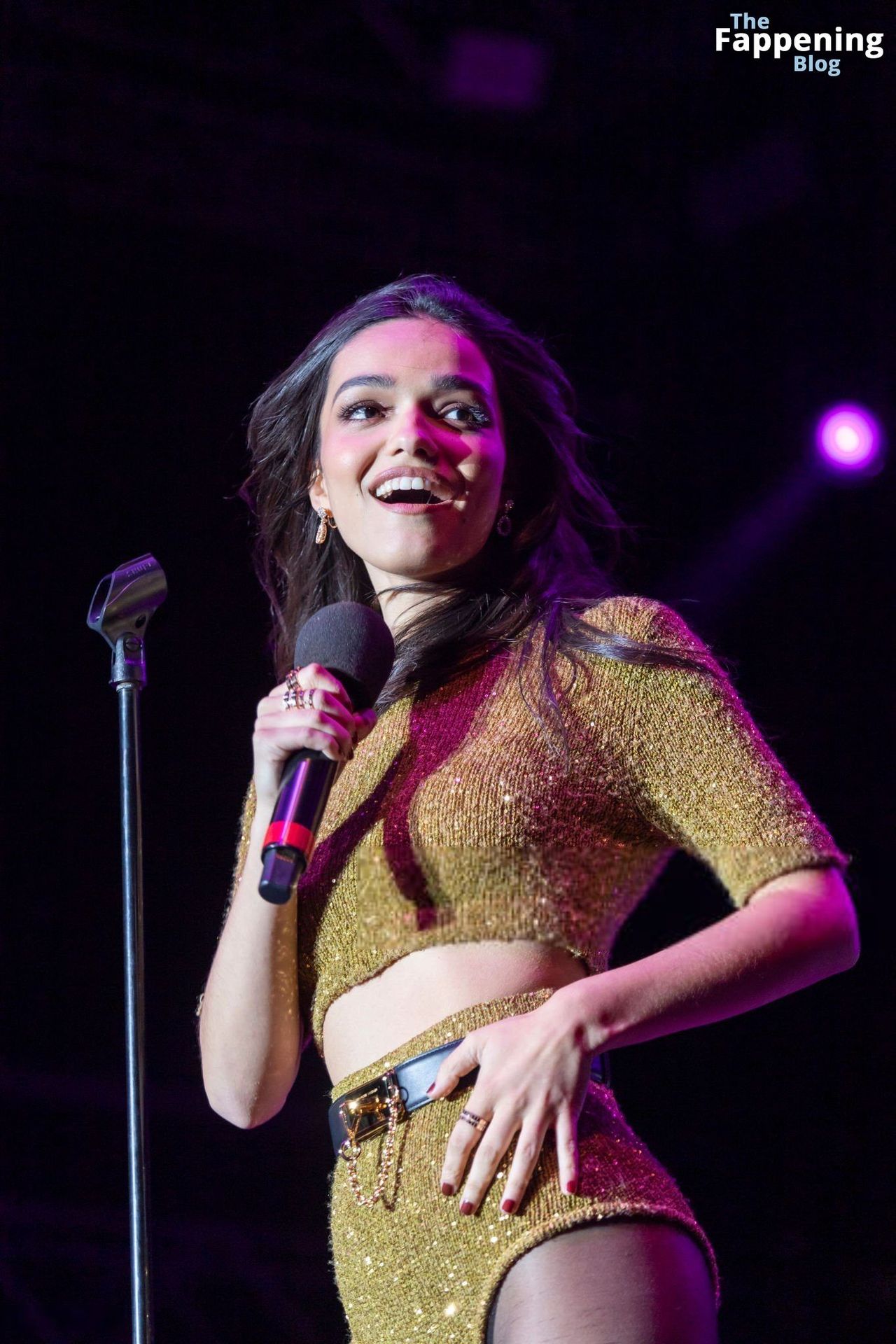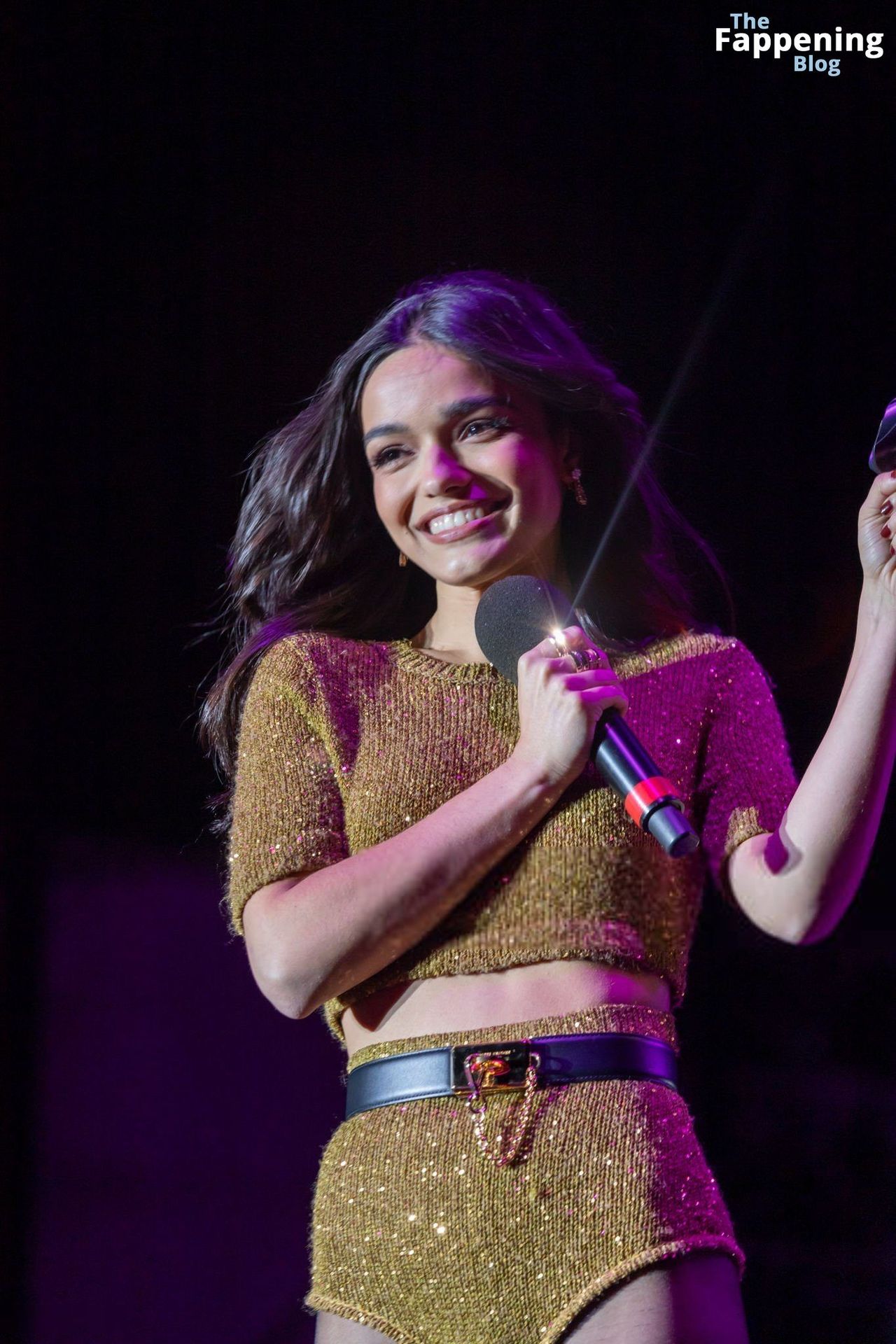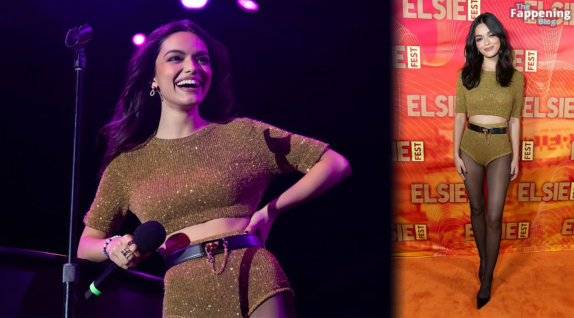 A atriz e cantora americana Rachel Zegler foi fotografada com shorts curtos e meia-calça preta no Elsie Fest em NYC.