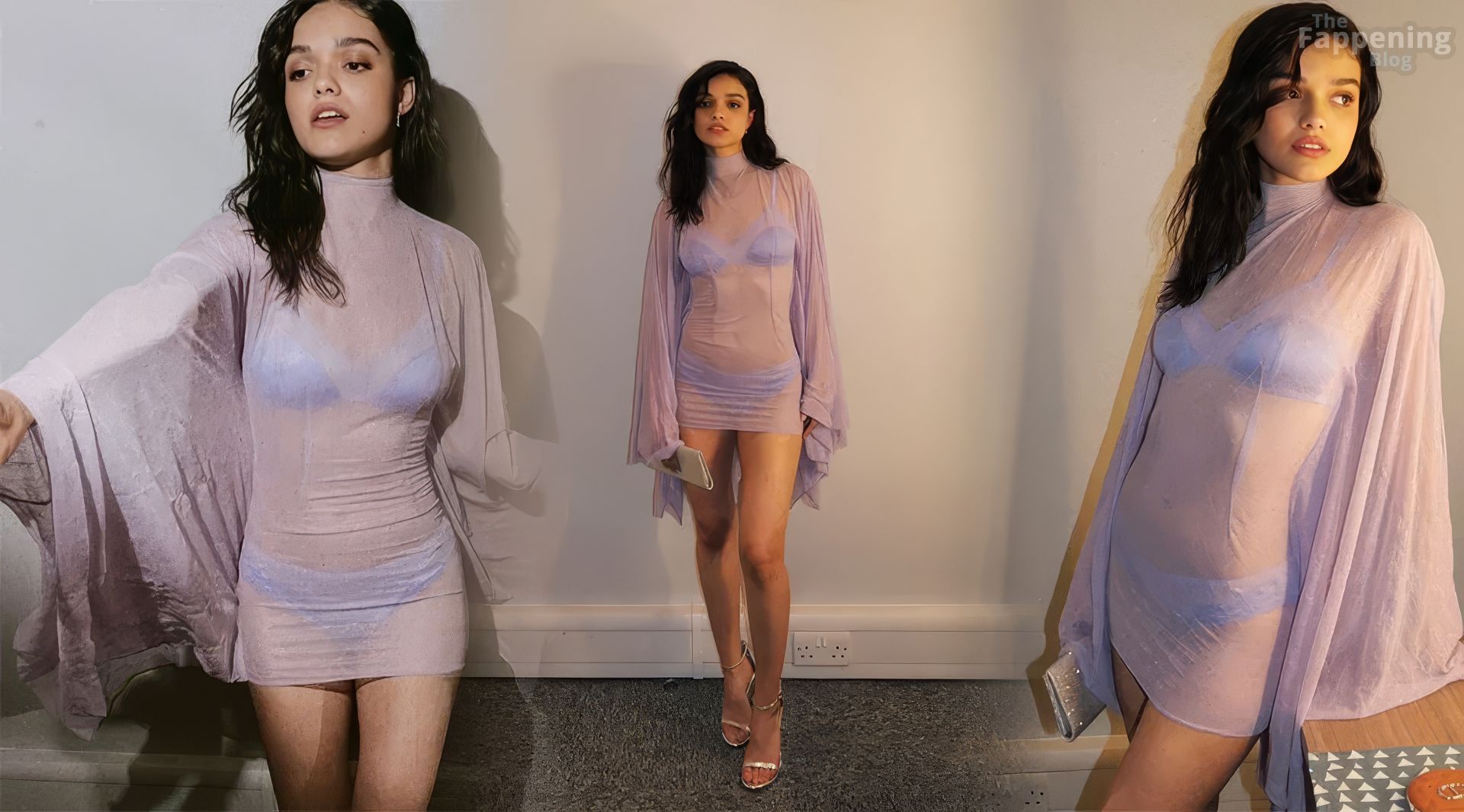 Atriz e cantora Rachel Zegler está absolutamente arrasando na edição de julho de 2025 da Elle UK, desfilando com um mini vestido lilás transparente.