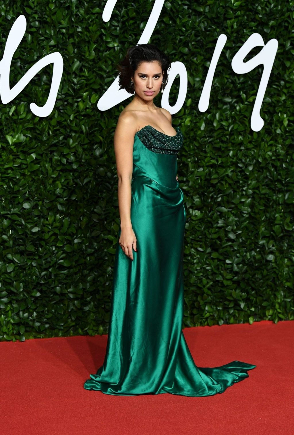 A cantora/compositora britânica Rachel Agatha Keen (também conhecida como RAYE) posa no tapete vermelho com um vestido verde ao chegar no The Fashion Awards 2019 em Londres, no dia 2 de dezembro de 2019.