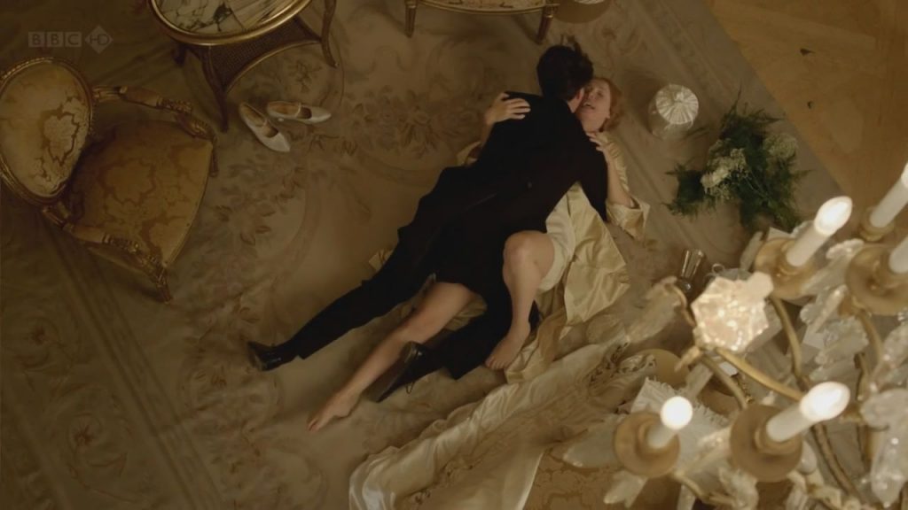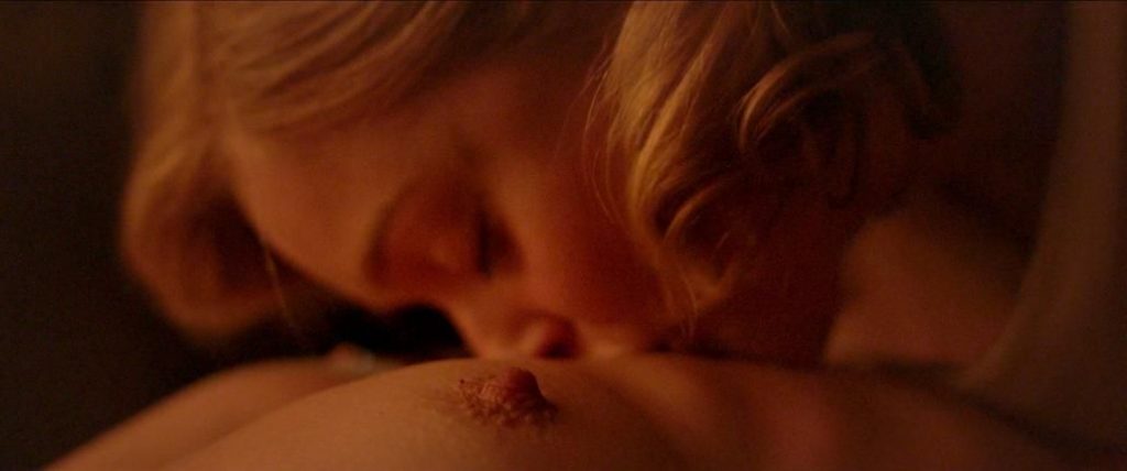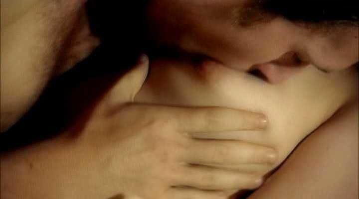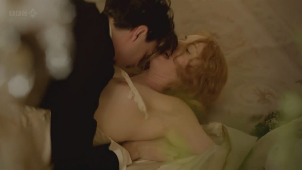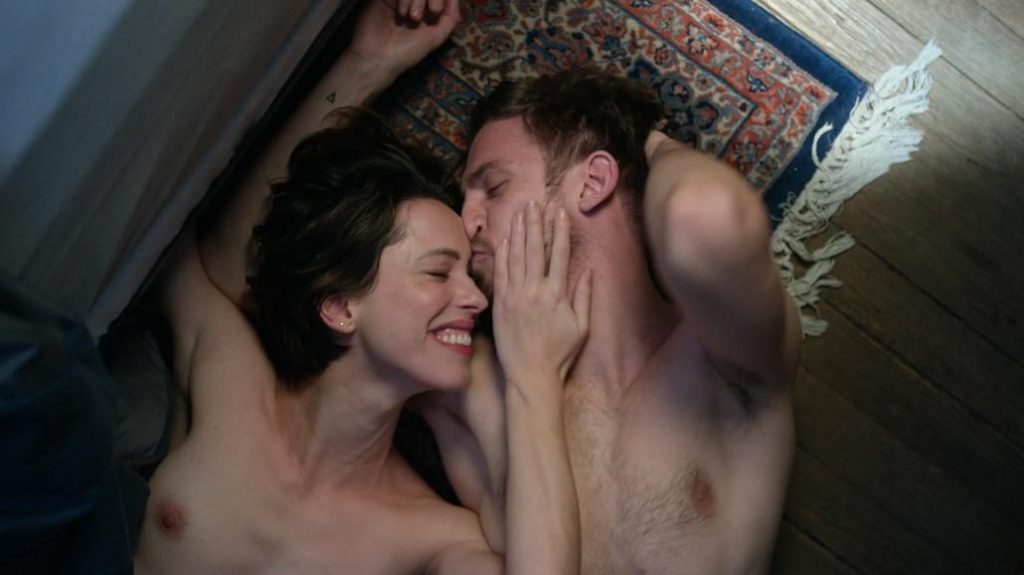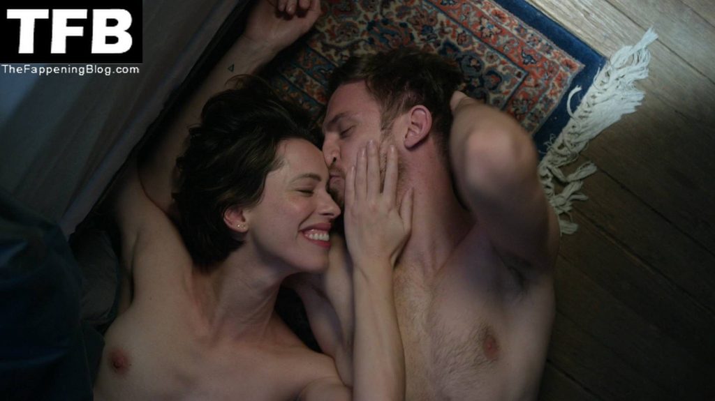 Bella Heathcote is nude underneath a see-through white dress. Showing her nipples through before she and Rebecca Hall roll around on the floor together and lesbian kiss. Bella then opens Rebecca’s coat and bares her breasts, kissing Rebecca on the chest. A guy then gets involved for a threesome, Bella having sex on top of him as Rebecca leans over to kiss Bella at the same time.