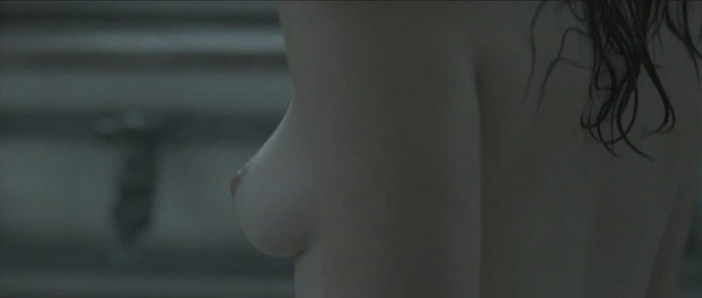 Rebecca Hall pulls herself up out of a bathtub and briefly shows her left breast when she drops her towel. She then walks toward a hole in the wall and kneels to peek in, showing her bareback.