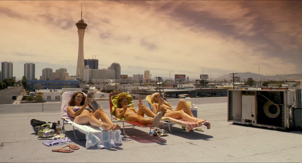 Laura Prepon is sunbathing topless on a rooftop beside Jo Newman, who also shows her breasts, and Rebecca Hall, who is wearing a bikini. Laura is on the right in a pair of sunglasses, Jo is in the middle, and Rebecca is on the left.