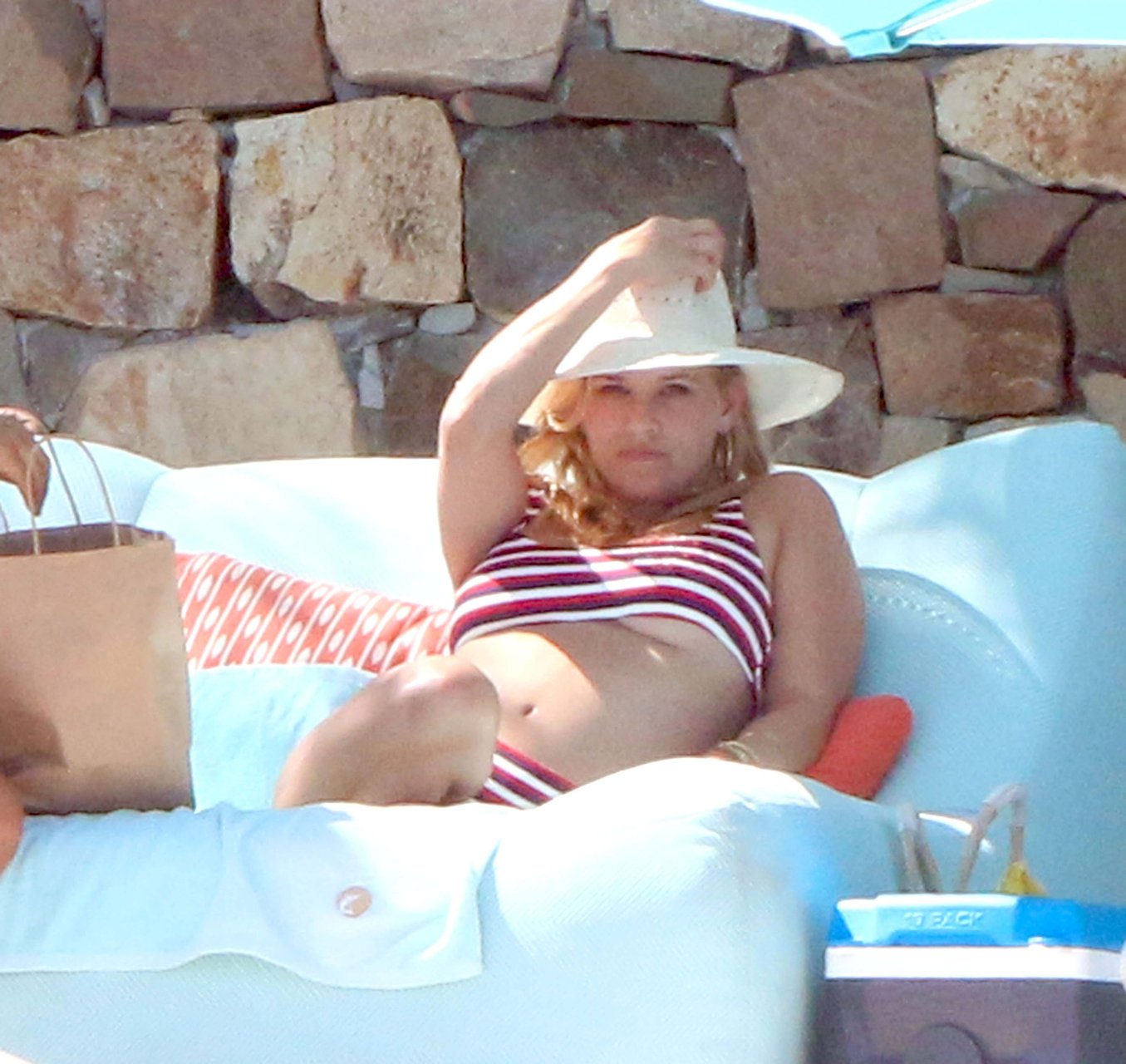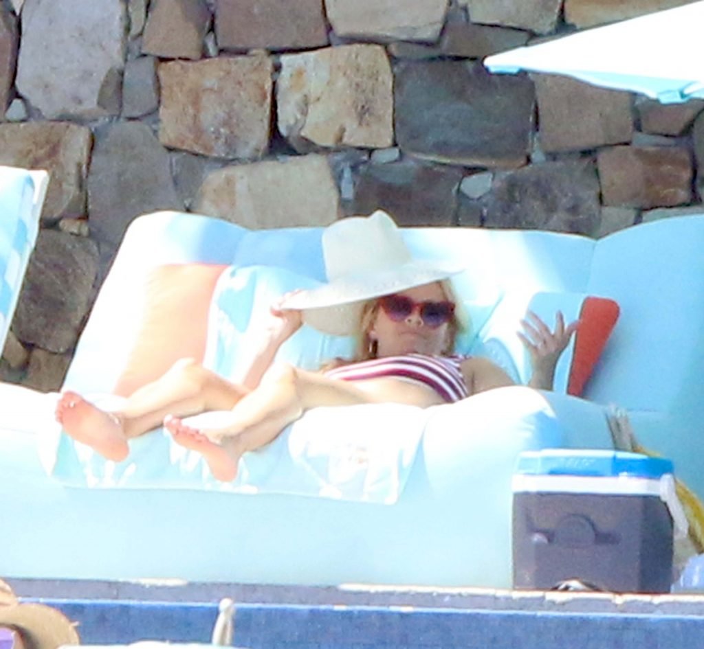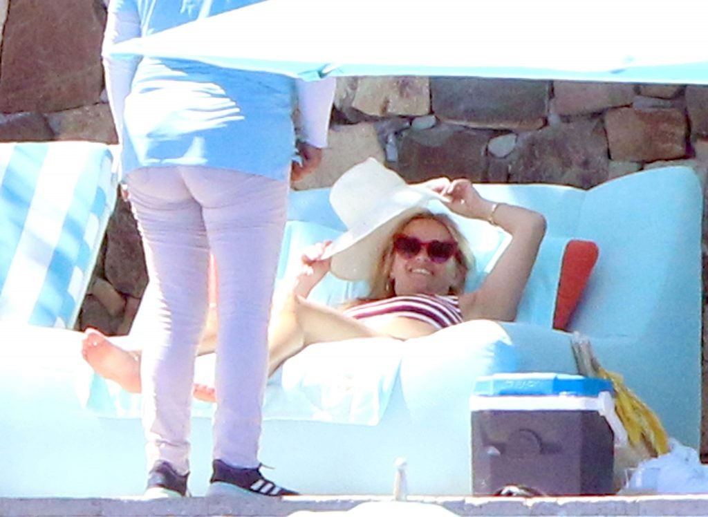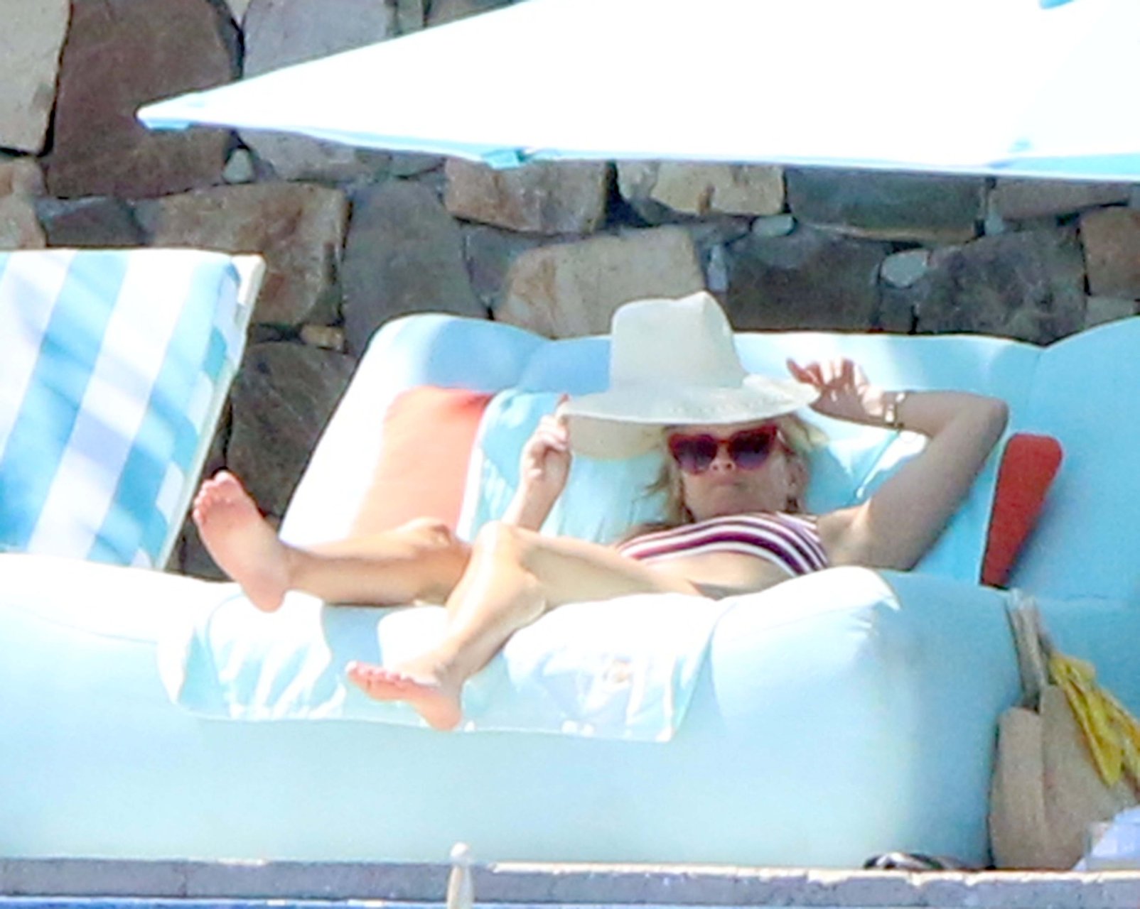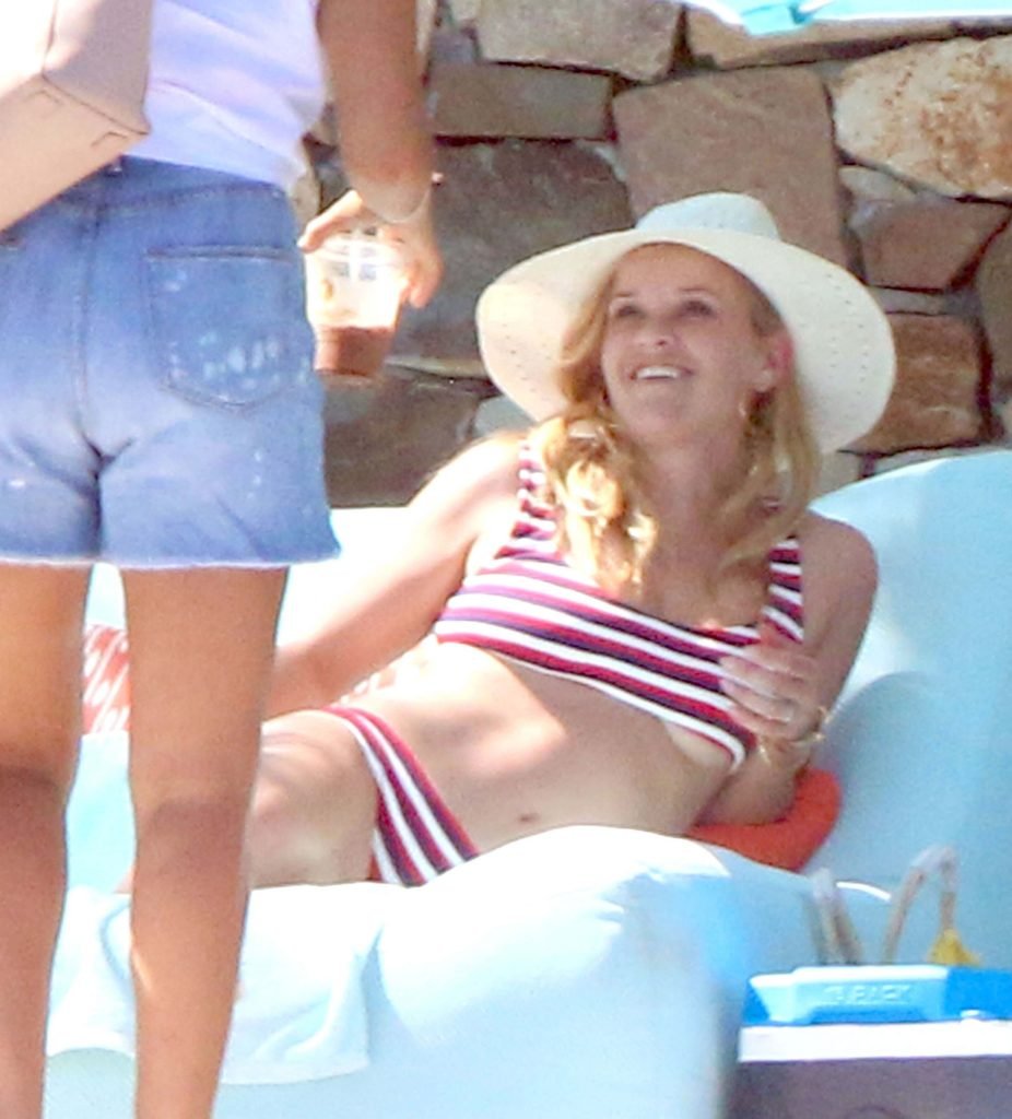 Reese Witherspoon sorri enquanto exibe suas curvas em um biquíni listrado vermelho e branco durante as férias com sua família em Cabo, México, 25/05/2018.