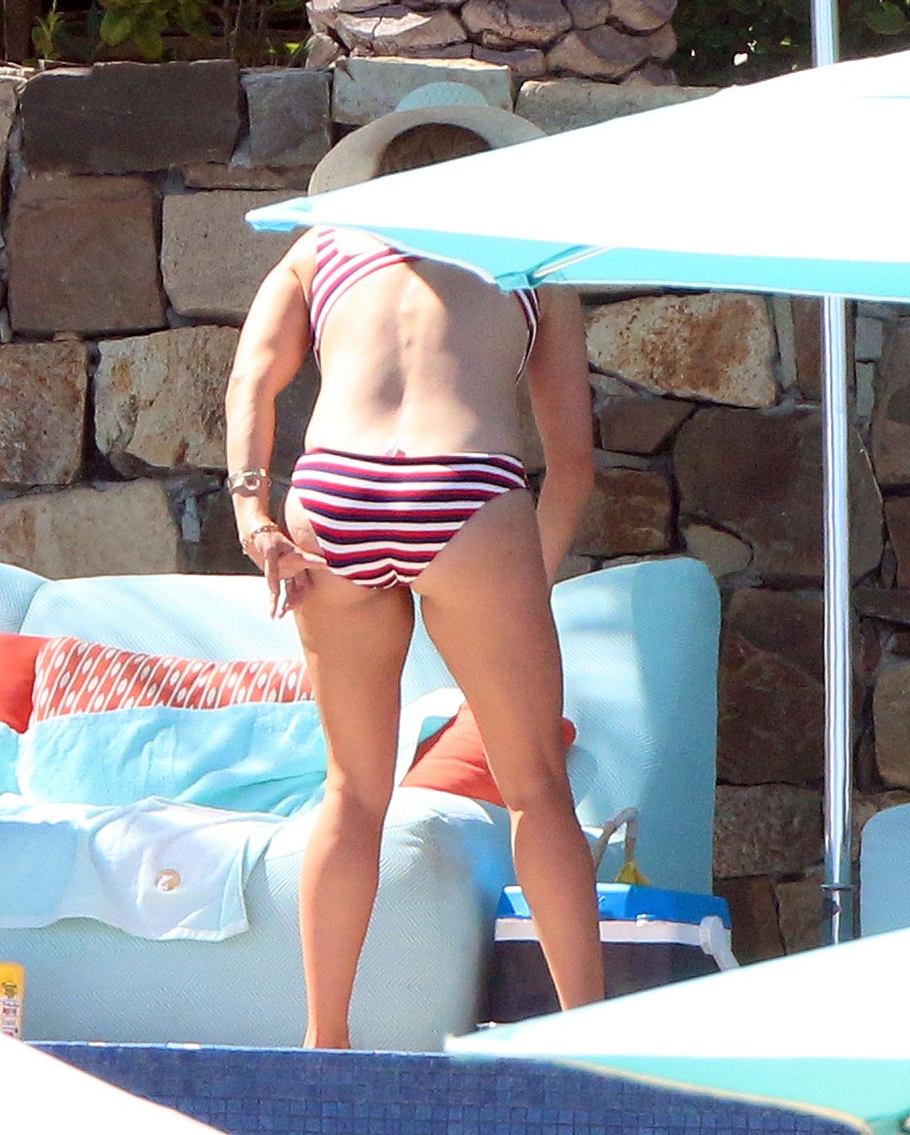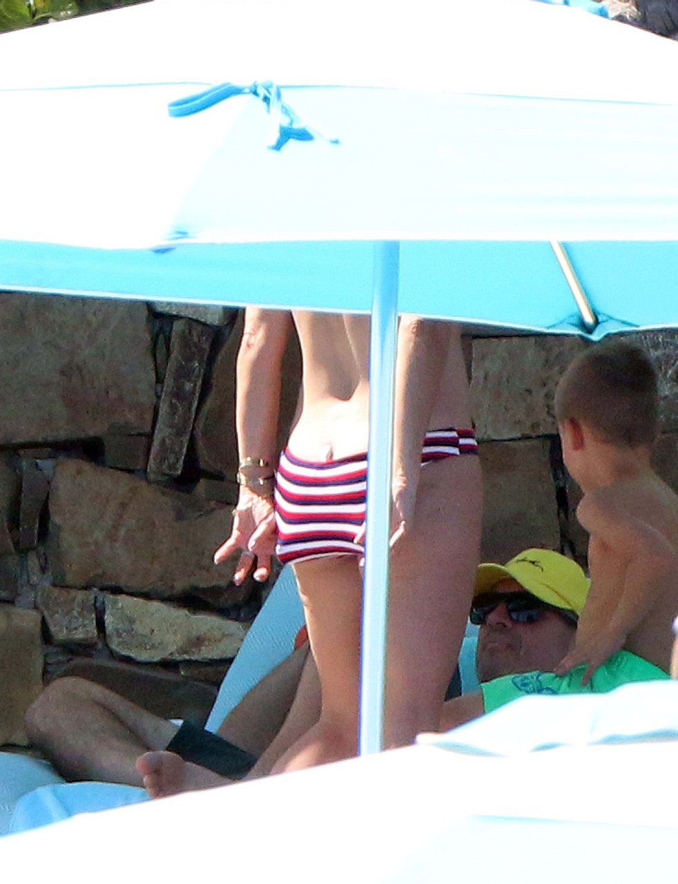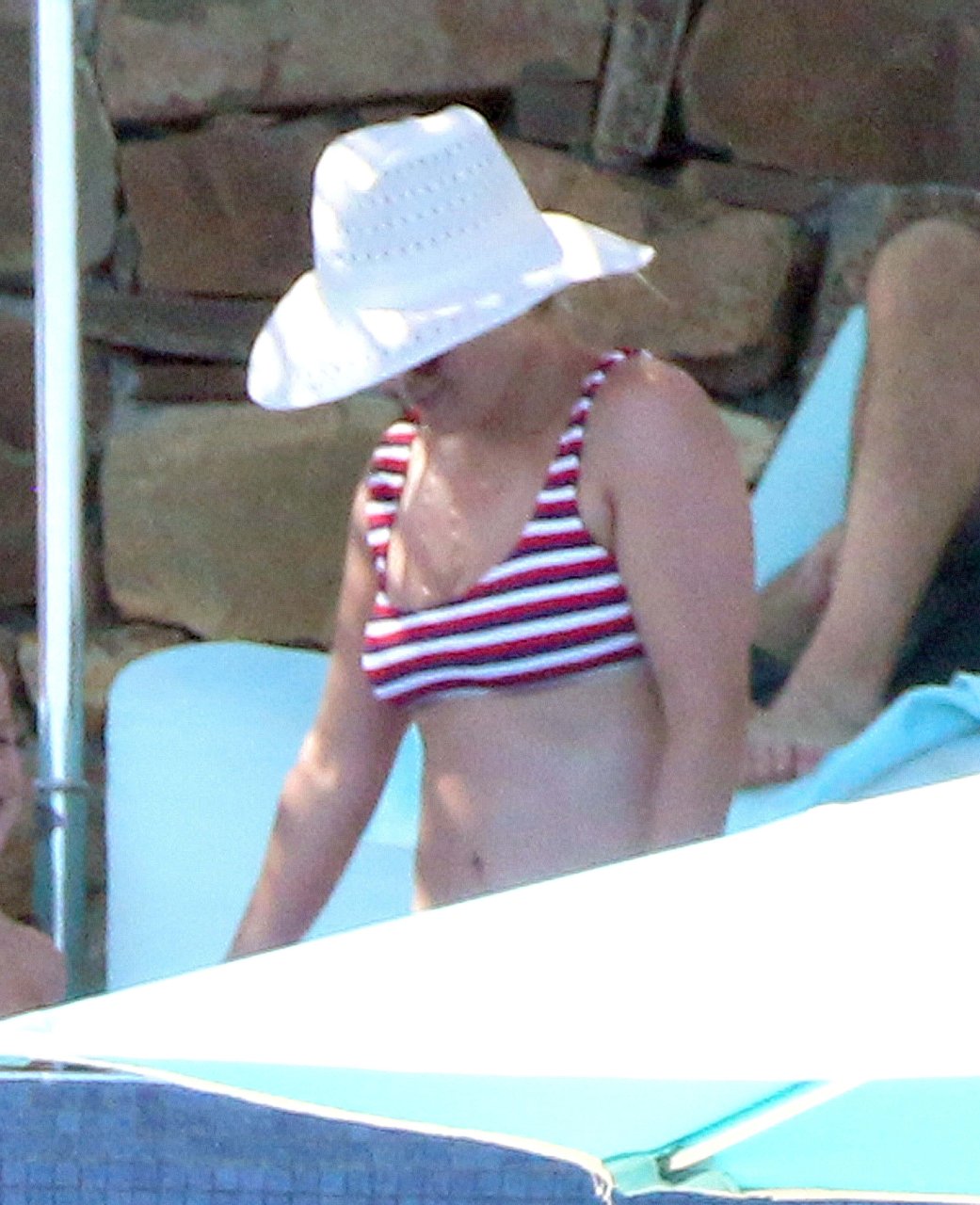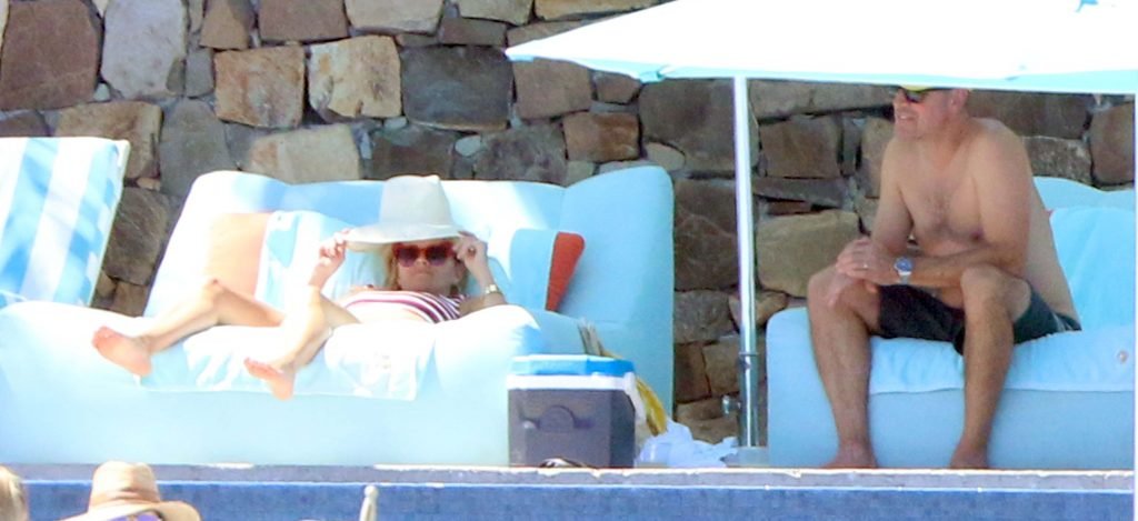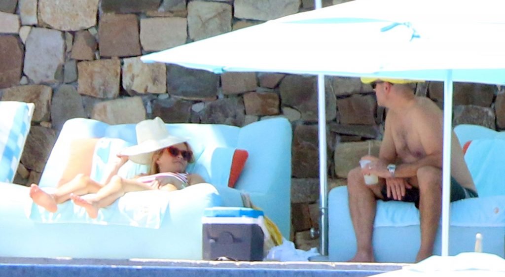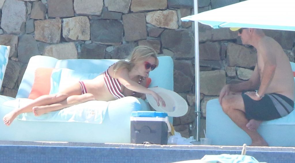 Reese Witherspoon sorri enquanto exibe suas curvas em um biquíni listrado vermelho e branco durante as férias com sua família em Cabo, México, 25/05/2018.