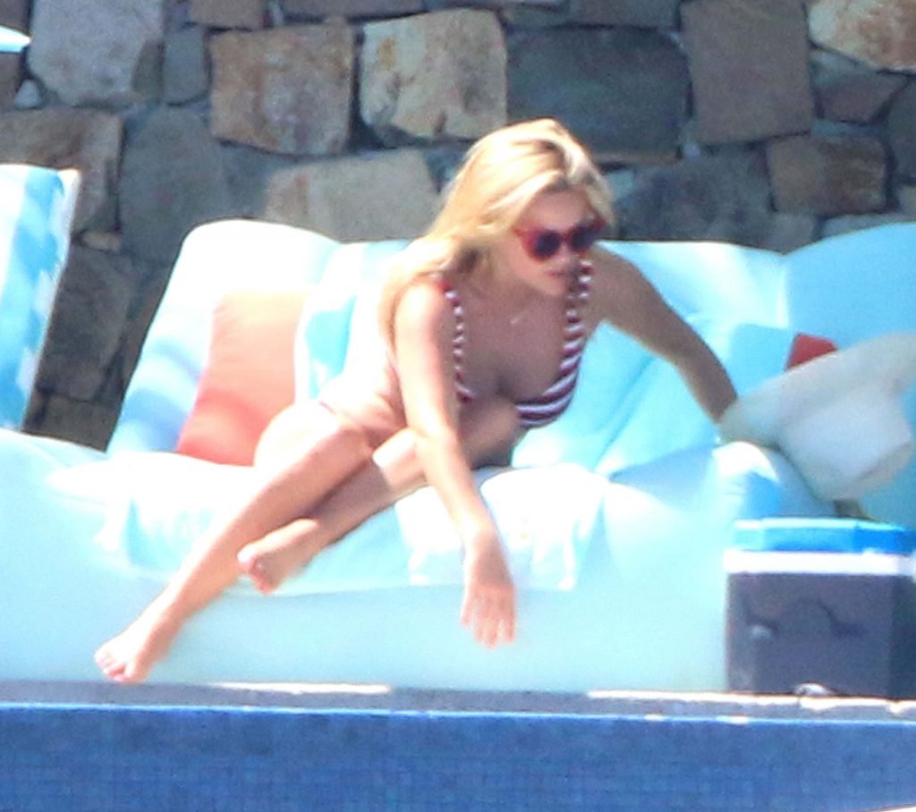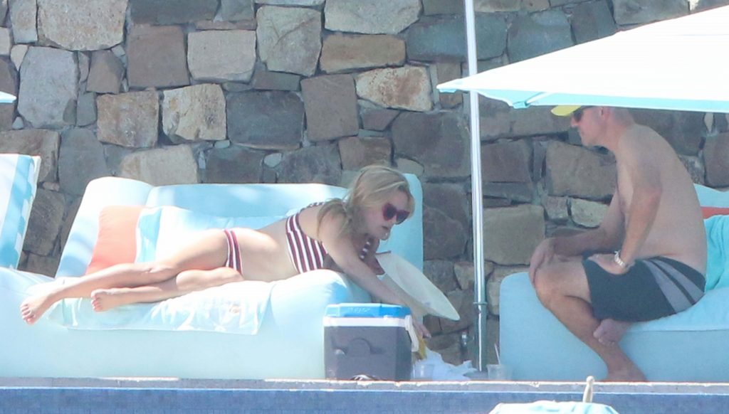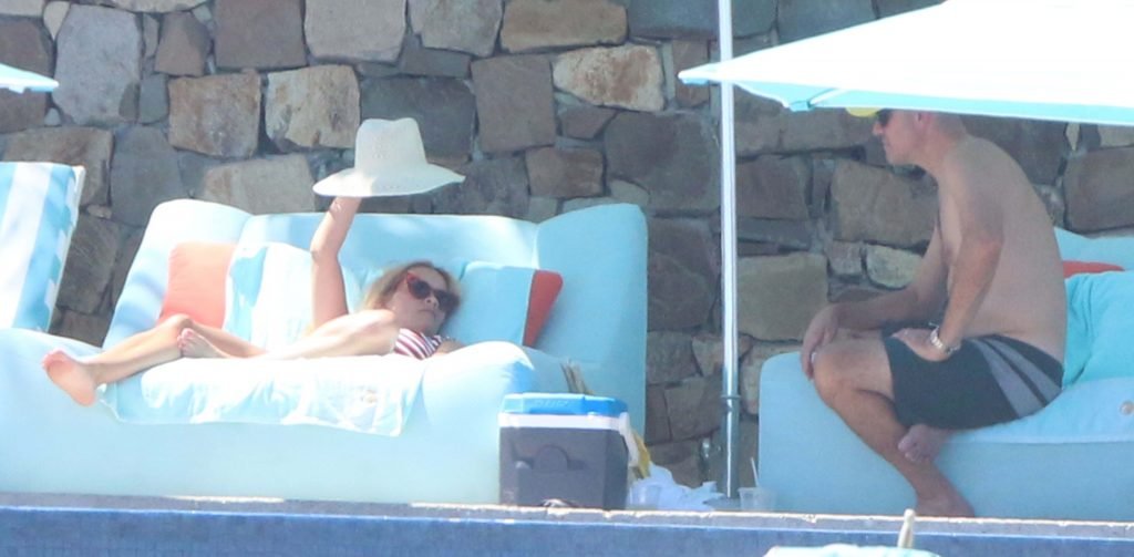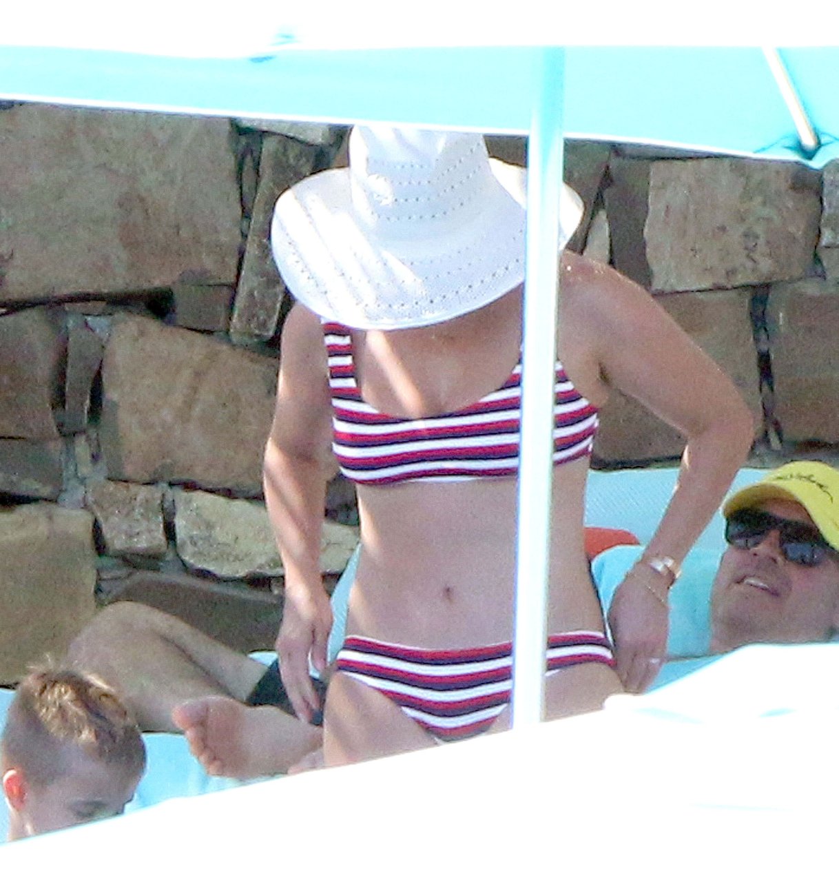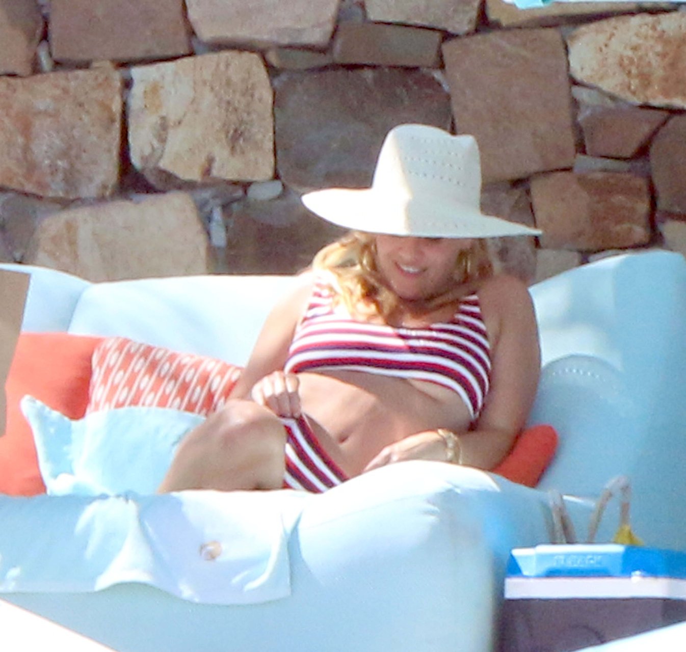 Reese Witherspoon sorri enquanto exibe suas curvas em um biquíni listrado vermelho e branco durante as férias com sua família em Cabo, México, 25/05/2018.