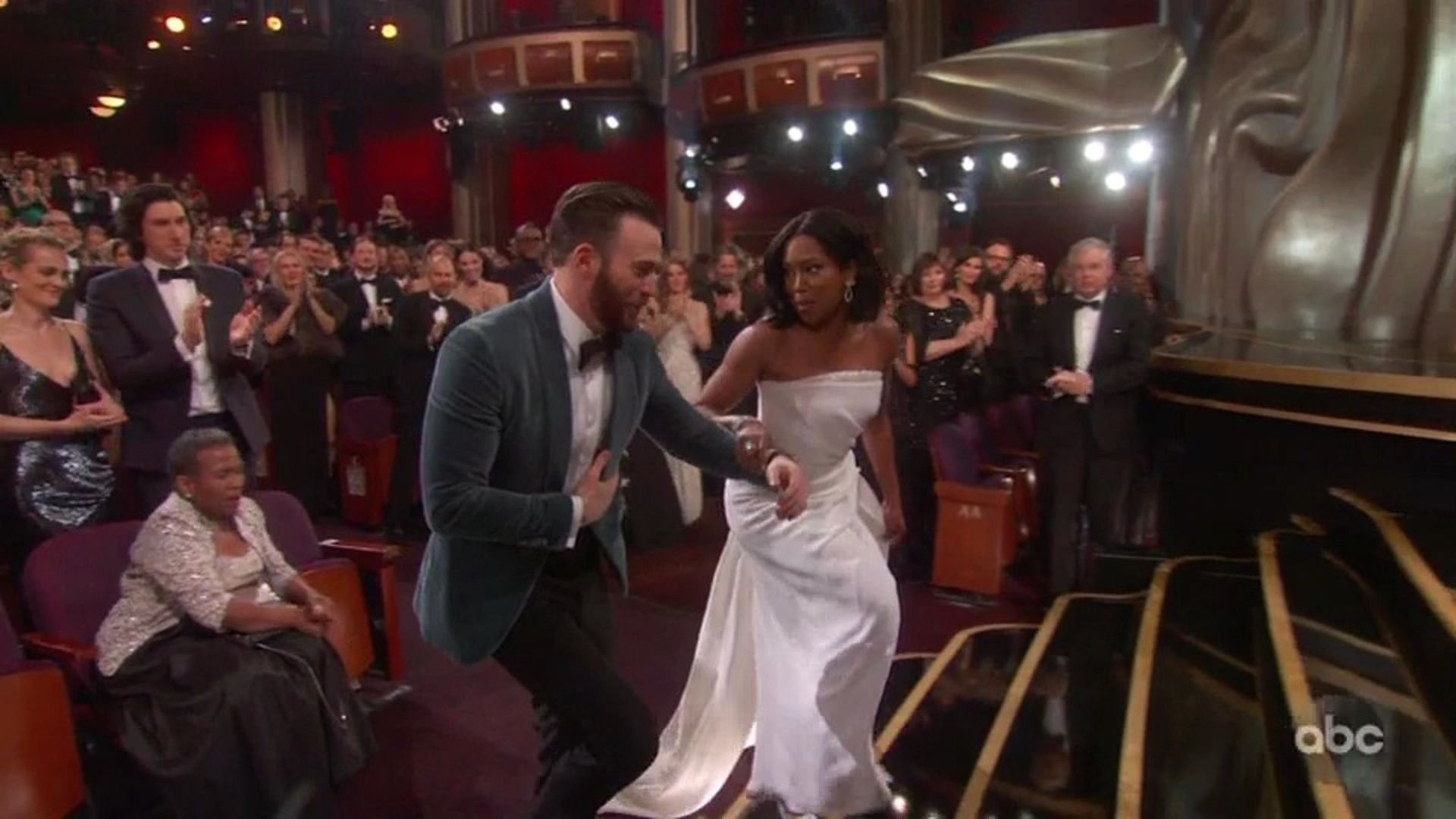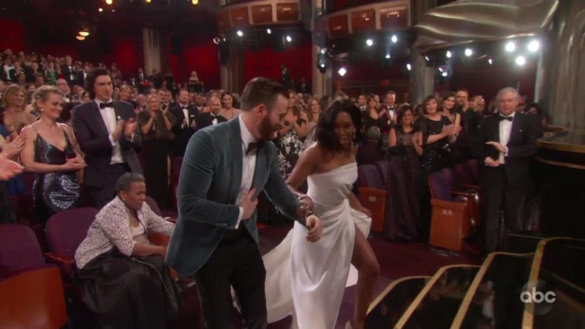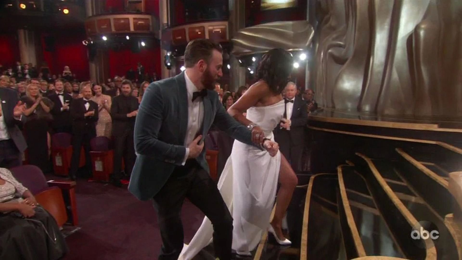 Gentleman Chris Evans ajuda a vencedora do Oscar Regina King (48) a evitar um contratempo com o figurino enquanto ela sobe ao palco para aceitar seu prêmio de Melhor Atriz, 24/02/2019.