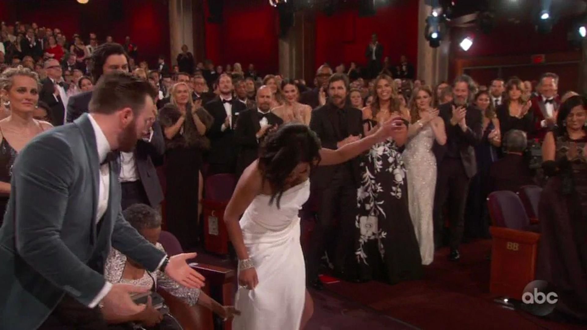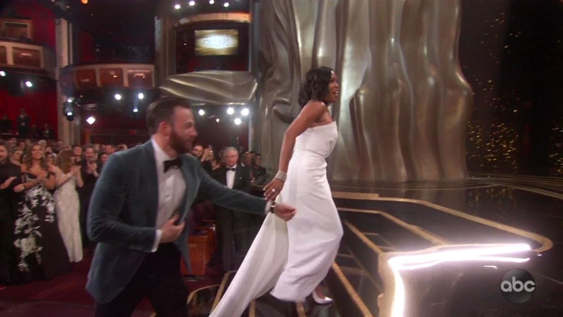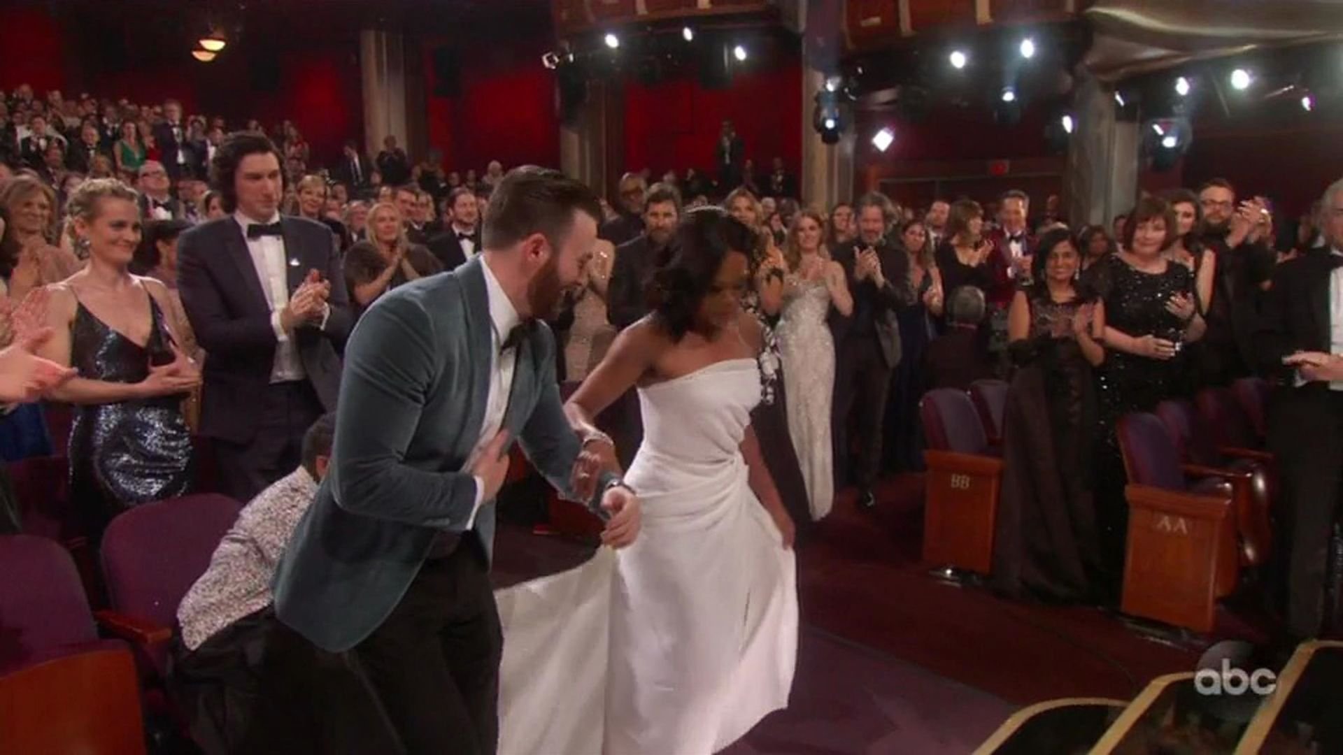 Gentleman Chris Evans ajuda a vencedora do Oscar Regina King (48) a evitar um contratempo com o figurino enquanto ela sobe ao palco para aceitar seu prêmio de Melhor Atriz, 24/02/2019.