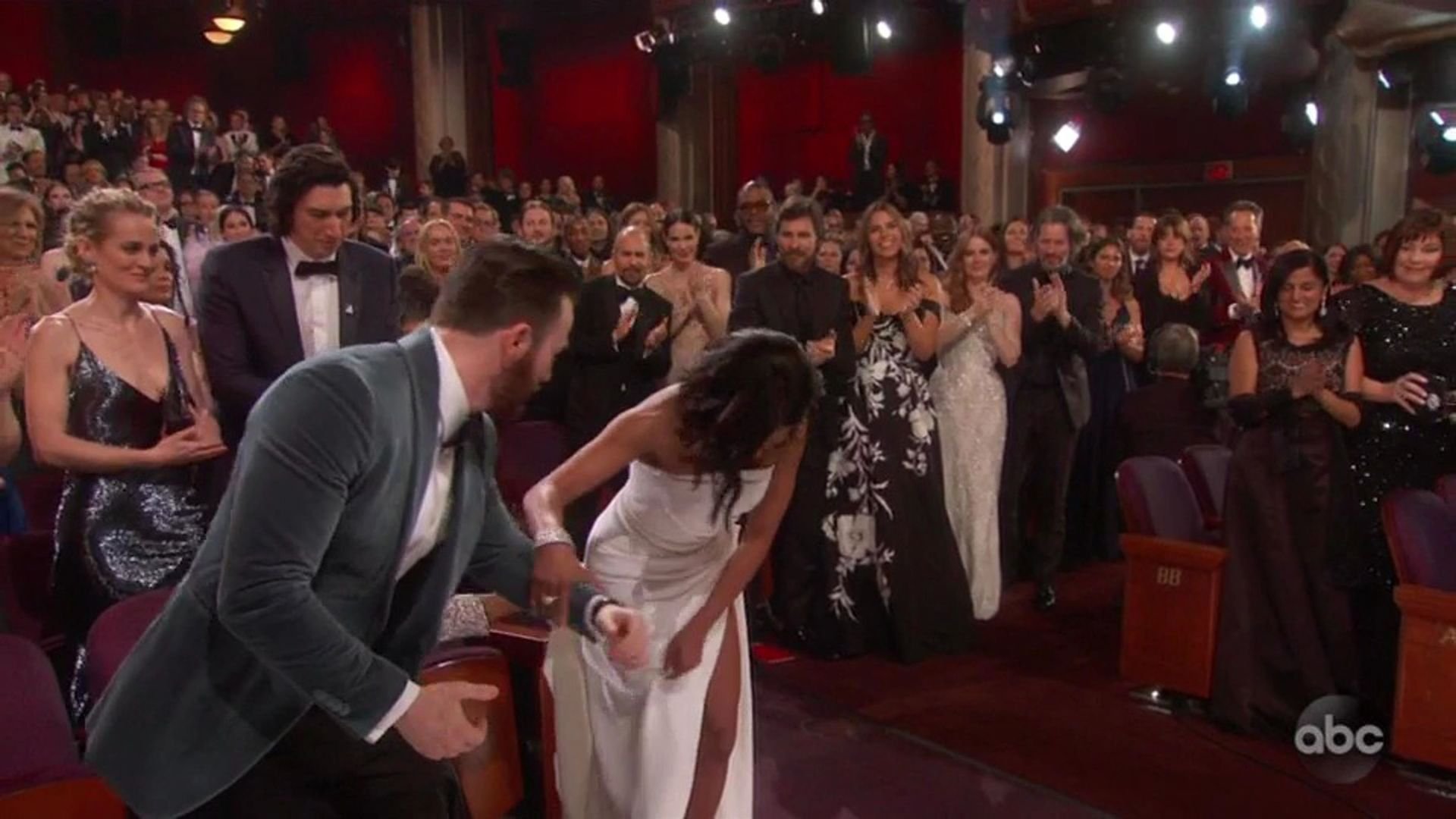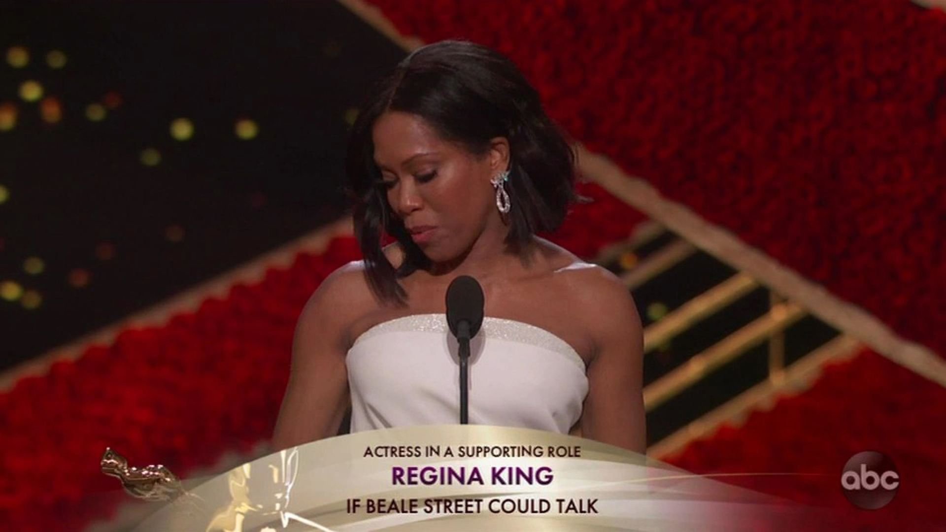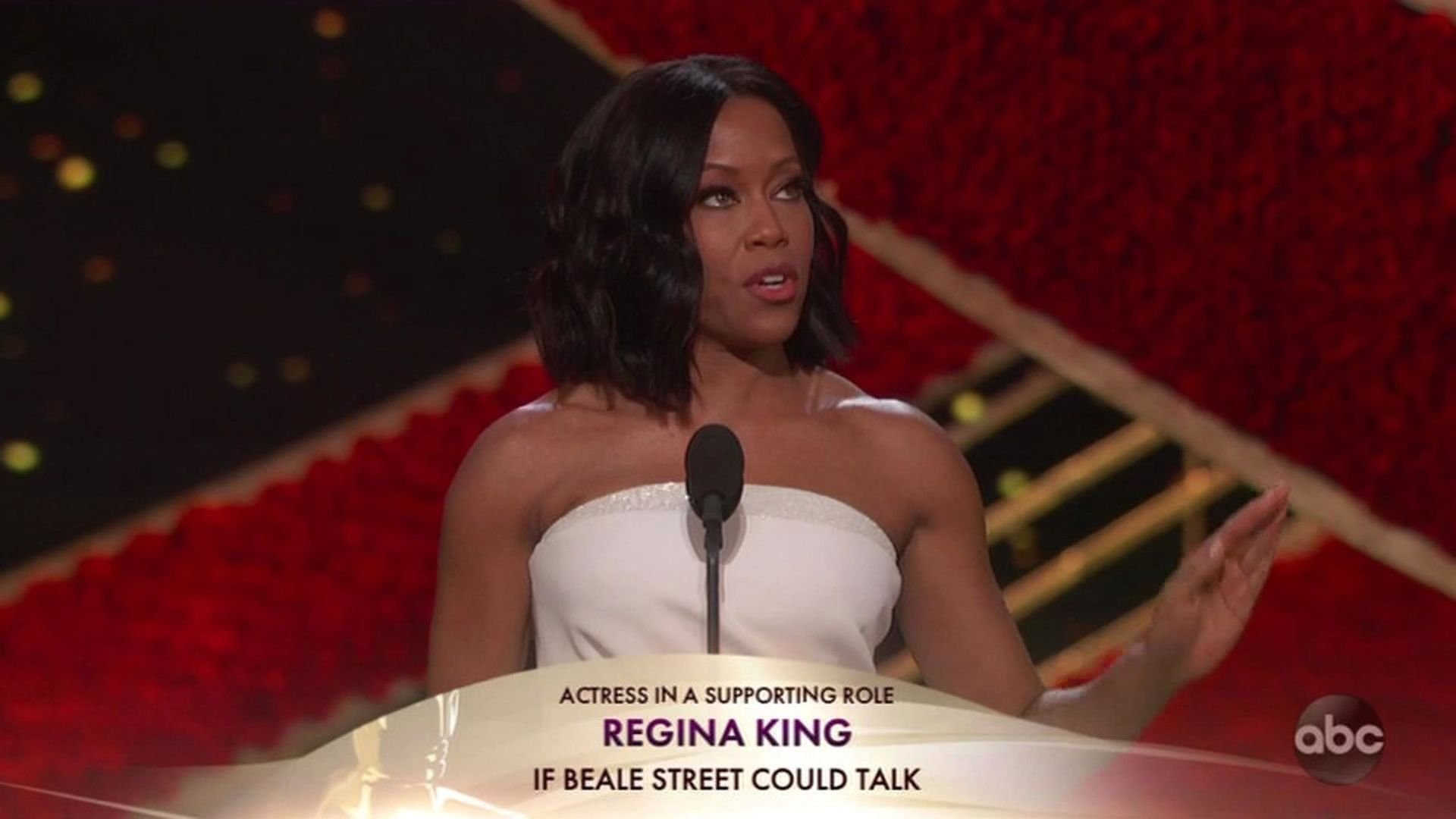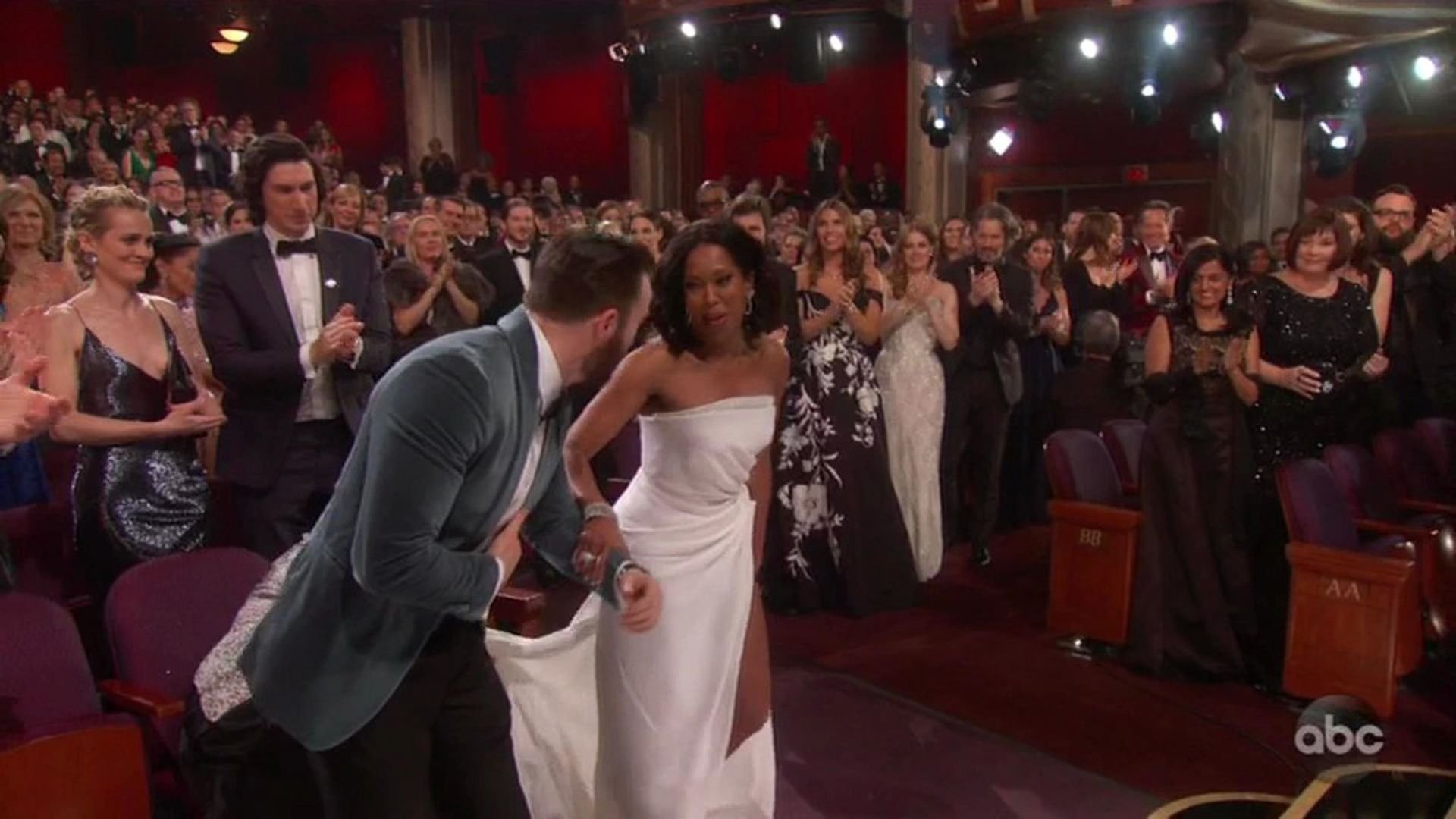 King foi anunciada como vencedora por seu papel no filme “Se a Rua Beale Falasse” e, após abraçar sua mãe Gloria, levantou-se para seguir até o palco. Mas seu deslumbrante vestido branco de alguma forma ficou enroscado, e ela quase teve um acidente – até que Evans, que estava sentado ao lado de Gloria, se levantou e ofereceu seu braço para King enquanto ela ajeitava o vestido.
