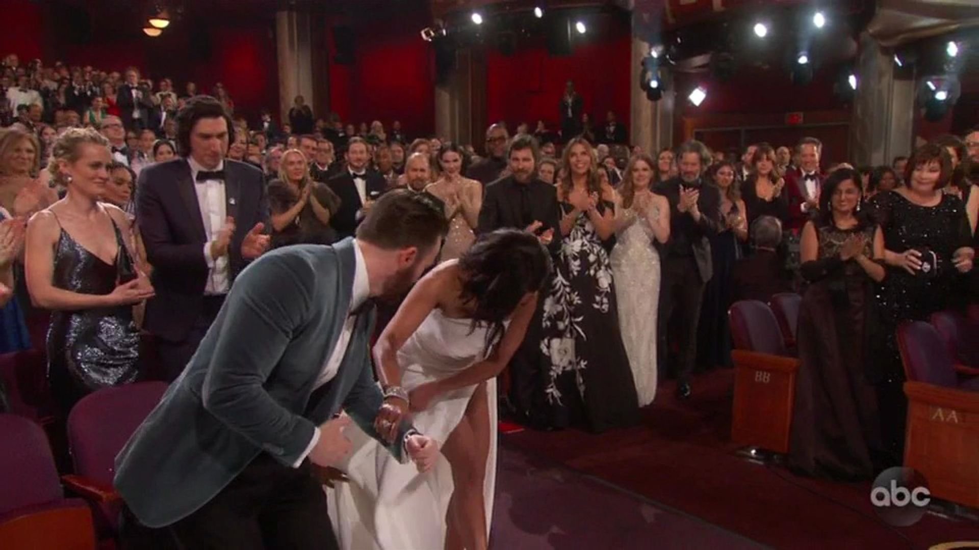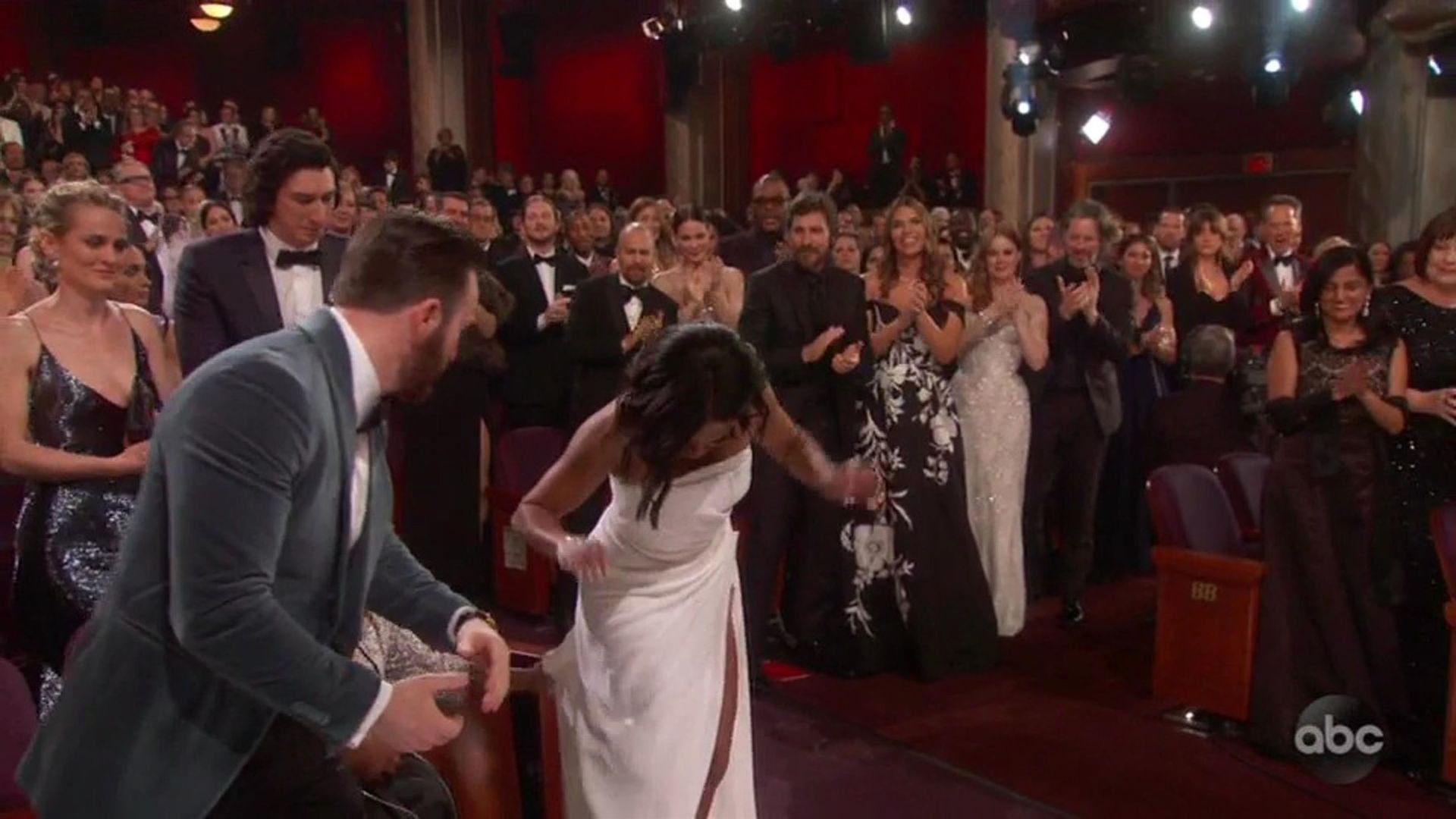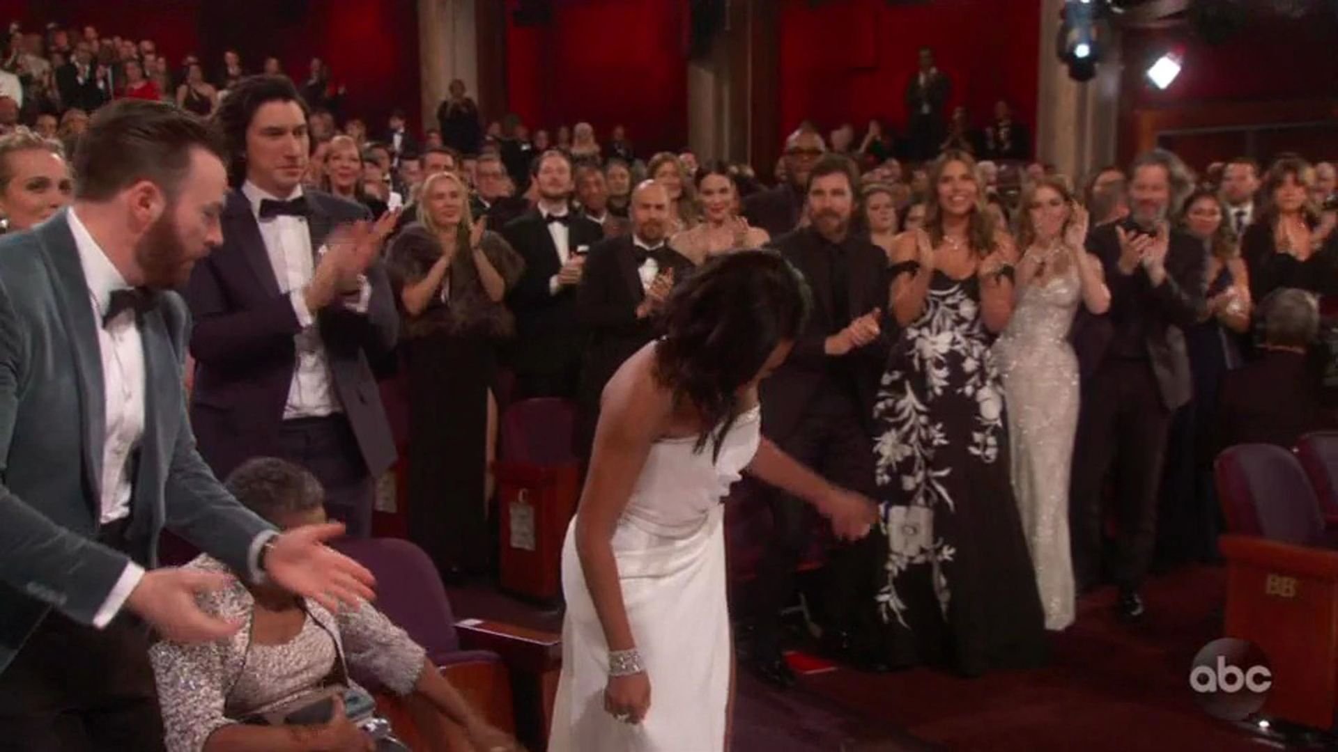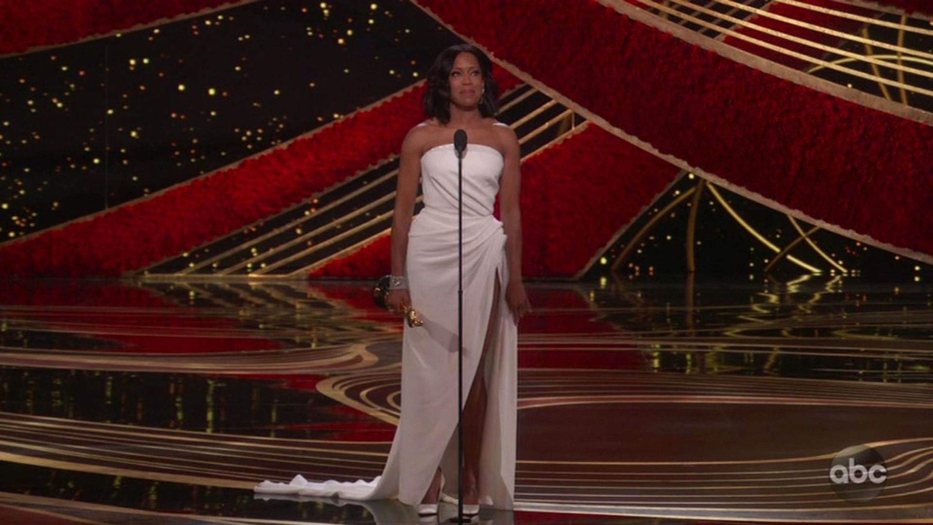 King foi anunciada como vencedora por seu papel no filme “Se a Rua Beale Falasse” e, após abraçar sua mãe Gloria, levantou-se para seguir até o palco. Mas seu deslumbrante vestido branco de alguma forma ficou enroscado, e ela quase teve um acidente – até que Evans, que estava sentado ao lado de Gloria, se levantou e ofereceu seu braço para King enquanto ela ajeitava o vestido.