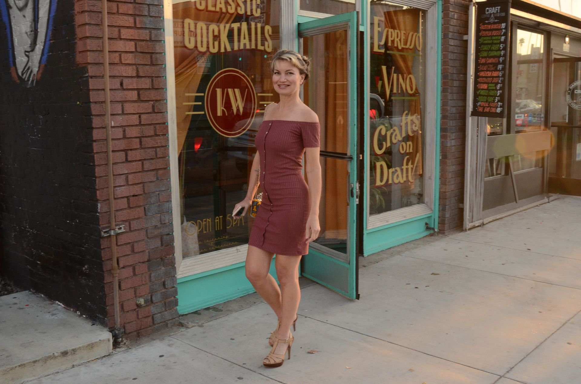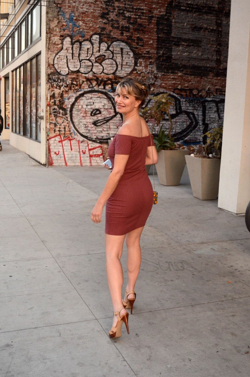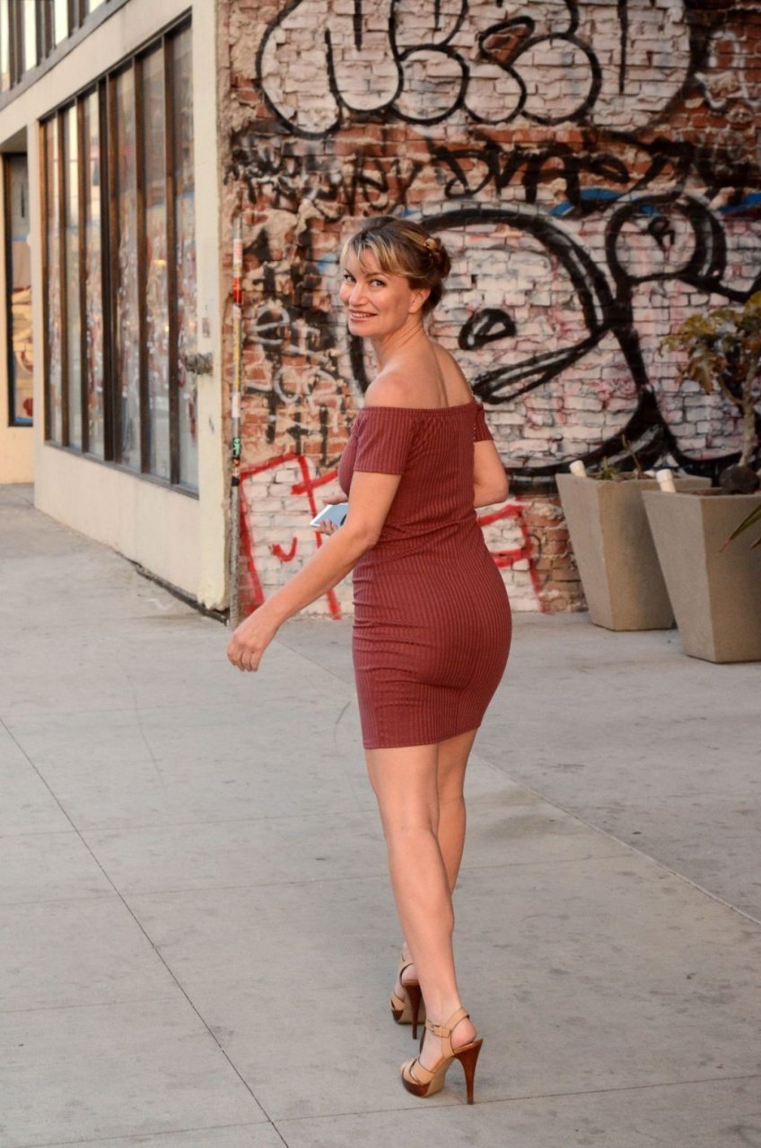 A atriz de “Showgirls” Rena Riffel foi vista em Hollywood celebrando o fim do seu casamento, mostrando o dedo anelar nu e os seios, 03/04/2019.