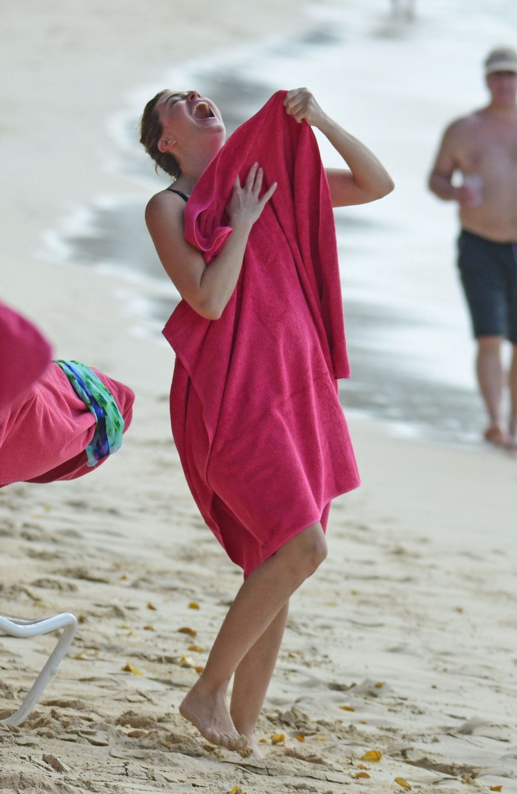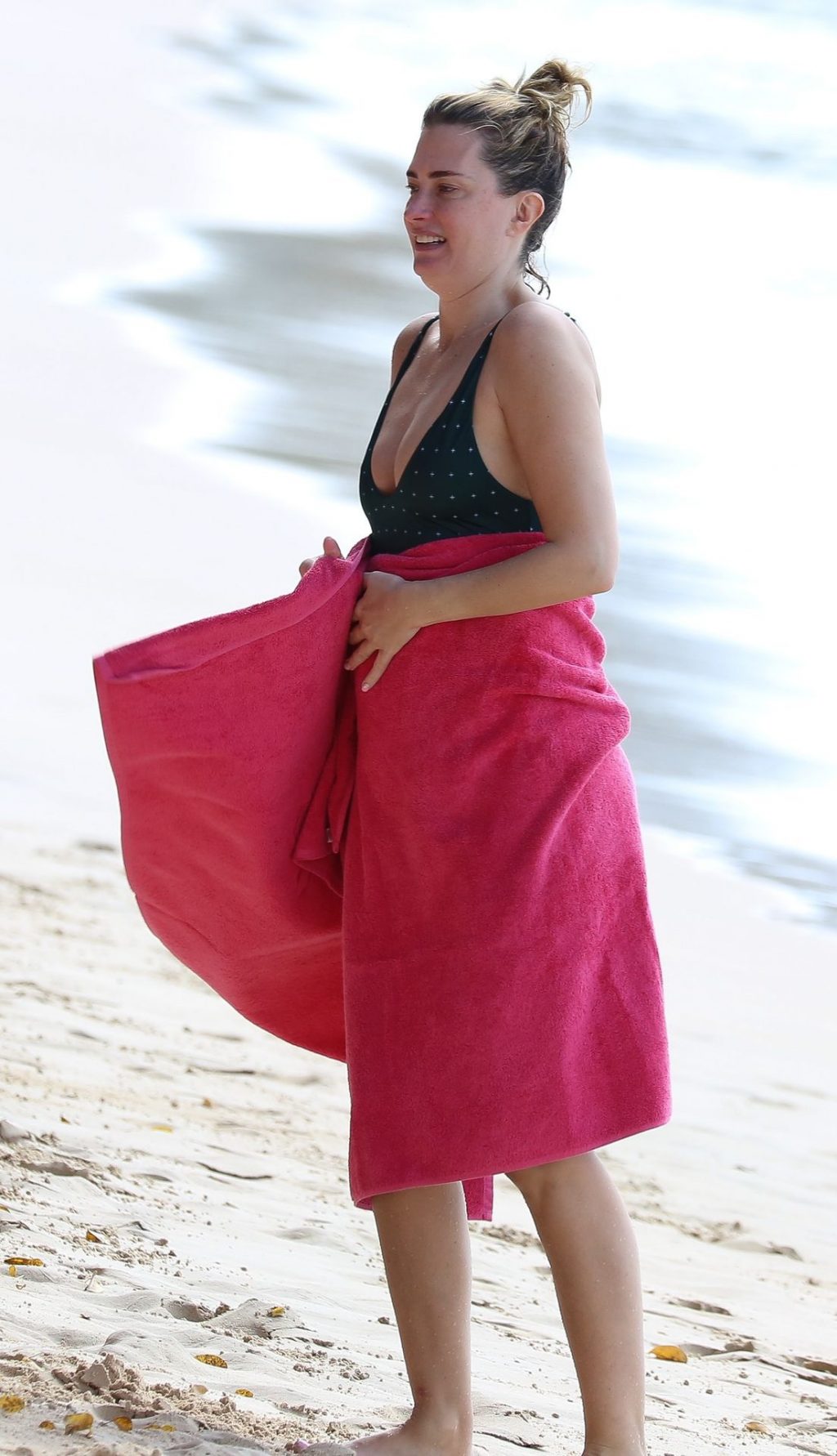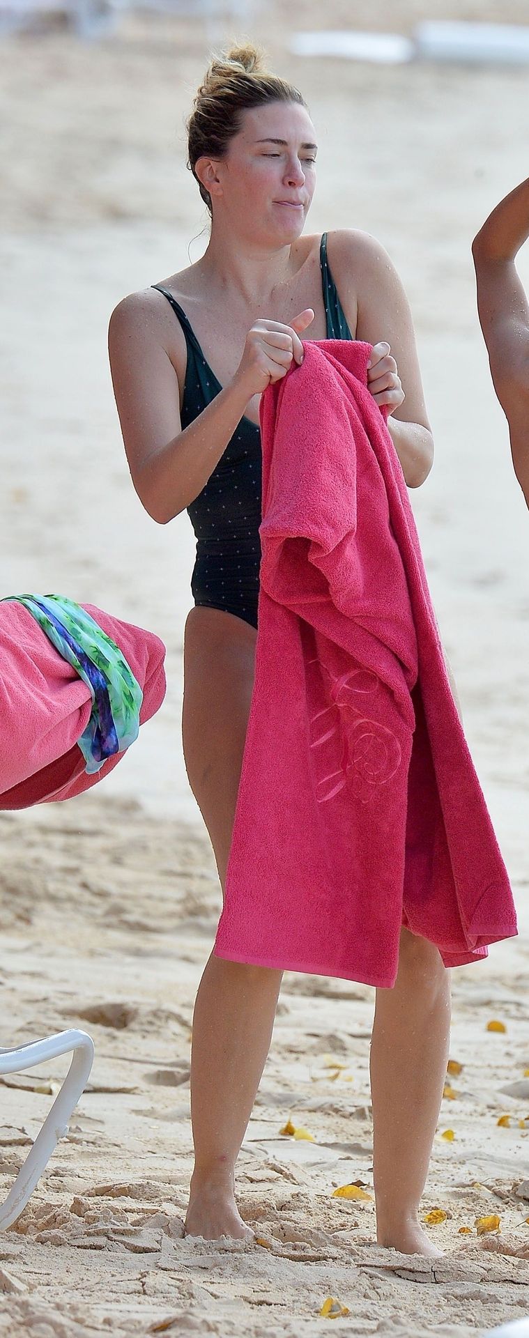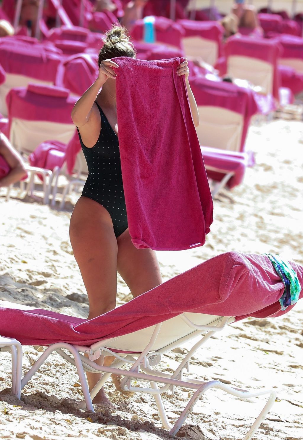 A esposa de Mark Wahlberg, Rhea Durham, foi vista rindo com um de seus filhos enquanto aproveita a praia em frente ao Sandy Lane Hotel em Barbados, 28/12/2019. Depois de ganhar alguns quilos, seu bumbum está ótimo.