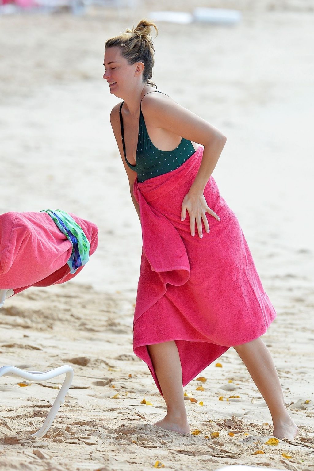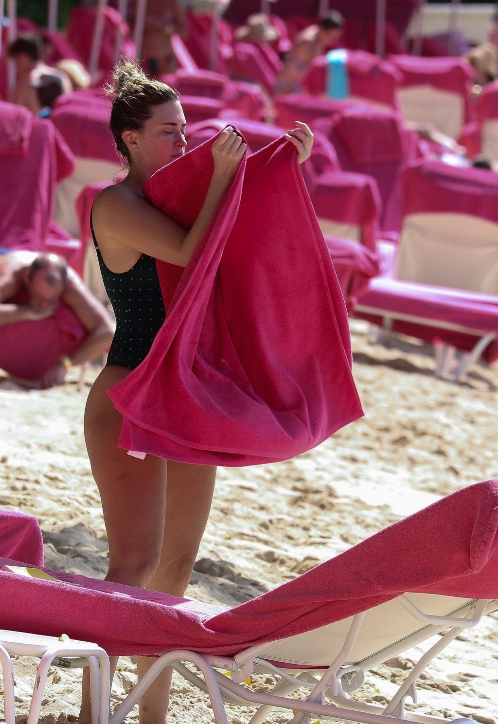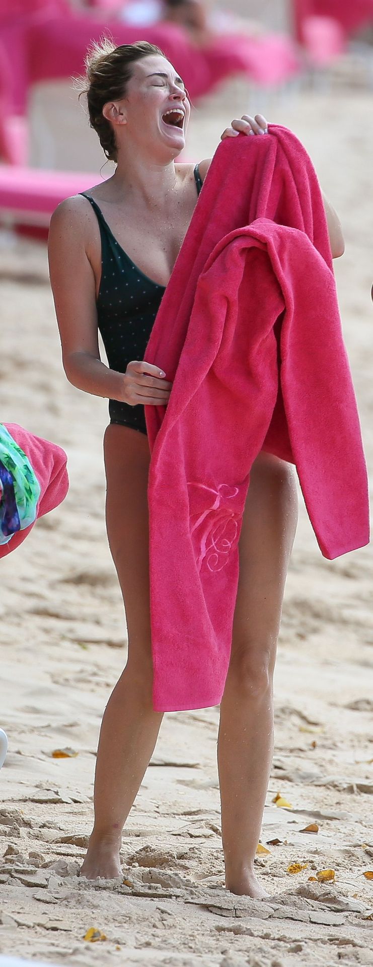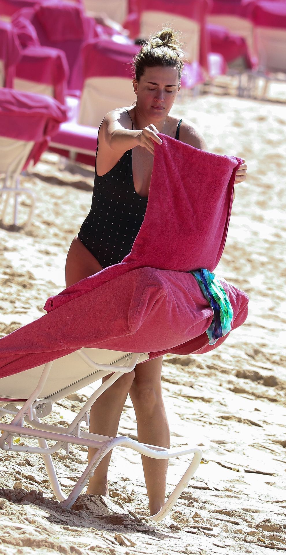 A esposa de Mark Wahlberg, Rhea Durham, foi vista rindo com um de seus filhos enquanto aproveita a praia em frente ao Sandy Lane Hotel em Barbados, 28/12/2019. Depois de ganhar alguns quilos, seu bumbum está ótimo.
