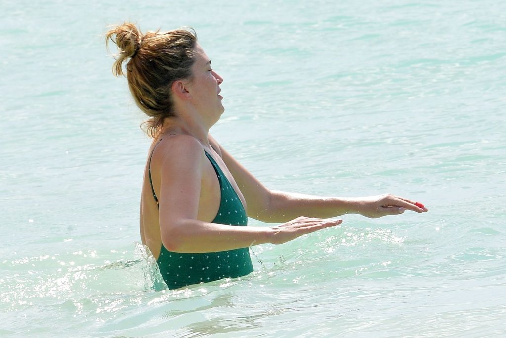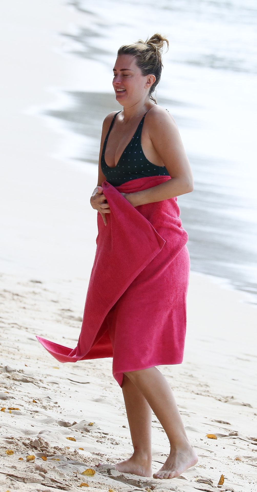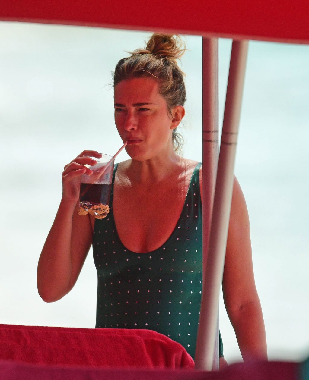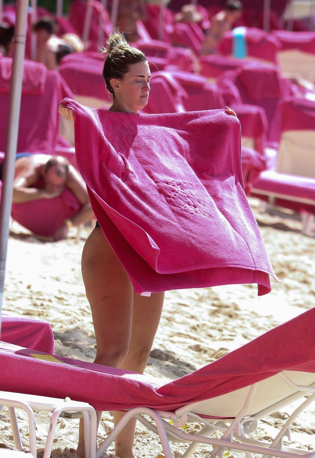 A esposa de Mark Wahlberg, Rhea Durham, foi vista rindo com um de seus filhos enquanto aproveita a praia em frente ao Sandy Lane Hotel em Barbados, 28/12/2019. Depois de ganhar alguns quilos, seu bumbum está ótimo.
