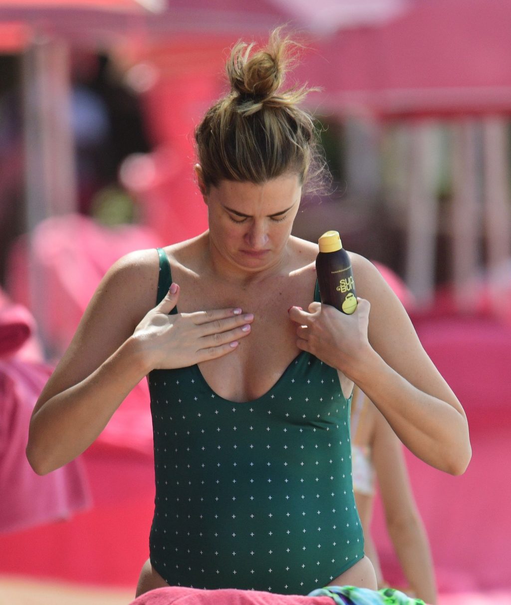 Cara, ela tem uma bunda grande e balançante, mas o maiô está tão enfiado nela que deve doer se mexer sequer uma polegada. Nossa, as manchas naquele coitado depois seriam sérias.