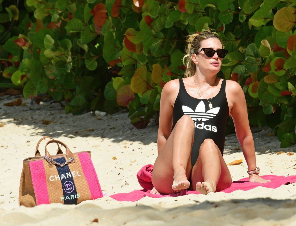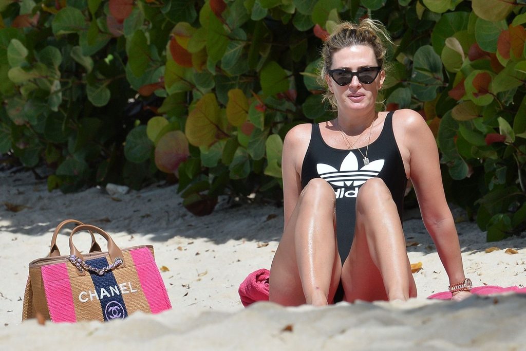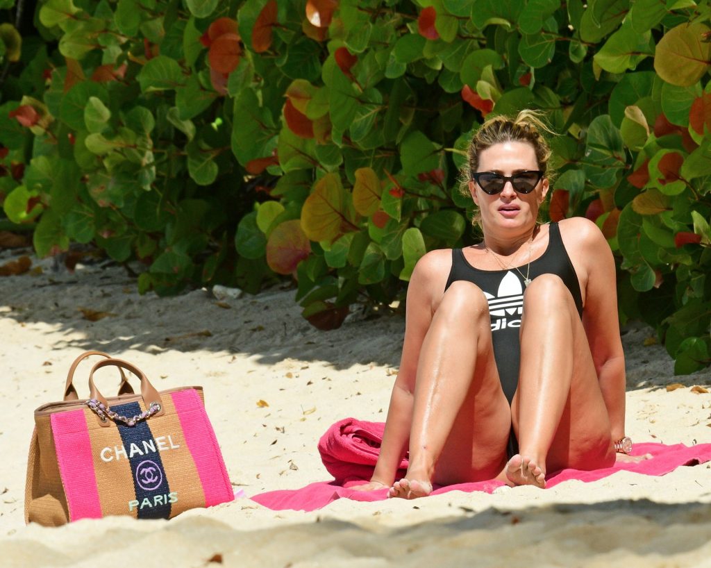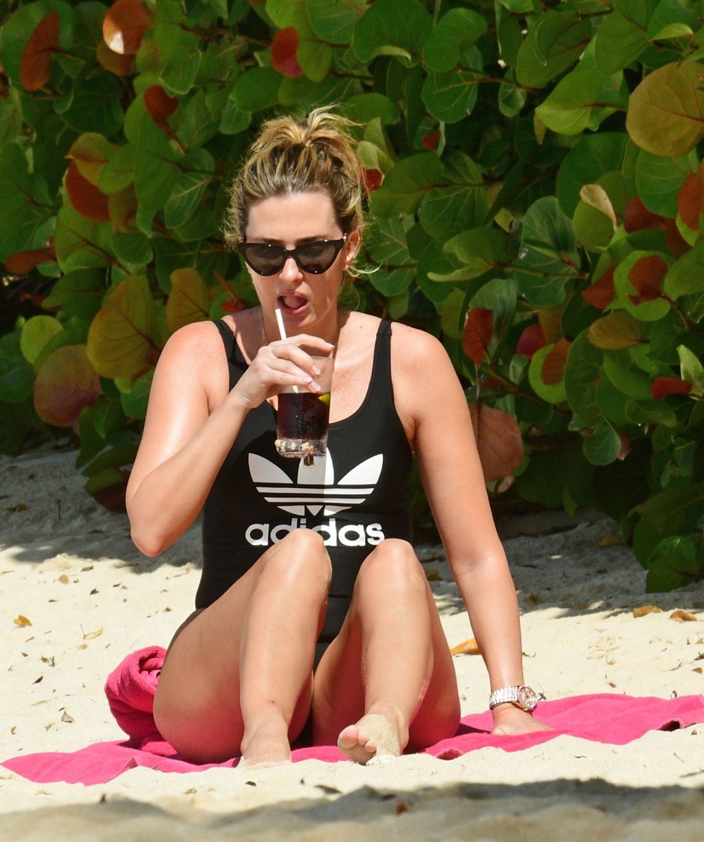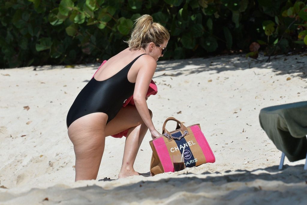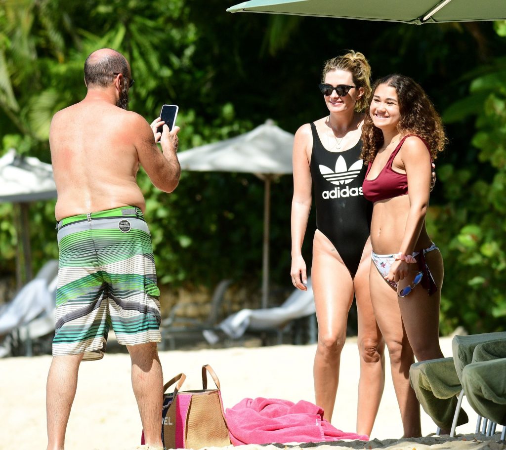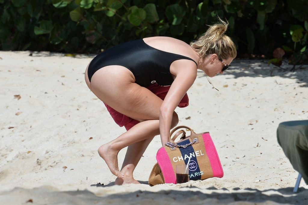 Esposa do ator americano Mark Wahlberg, a modelo de moda de 41 anos Rhea Durham parece incrível exibindo suas curvas sensacionais em seu maiô preto, sendo fotografada aproveitando as férias de inverno na praia em Barbados, 30/12/2019.