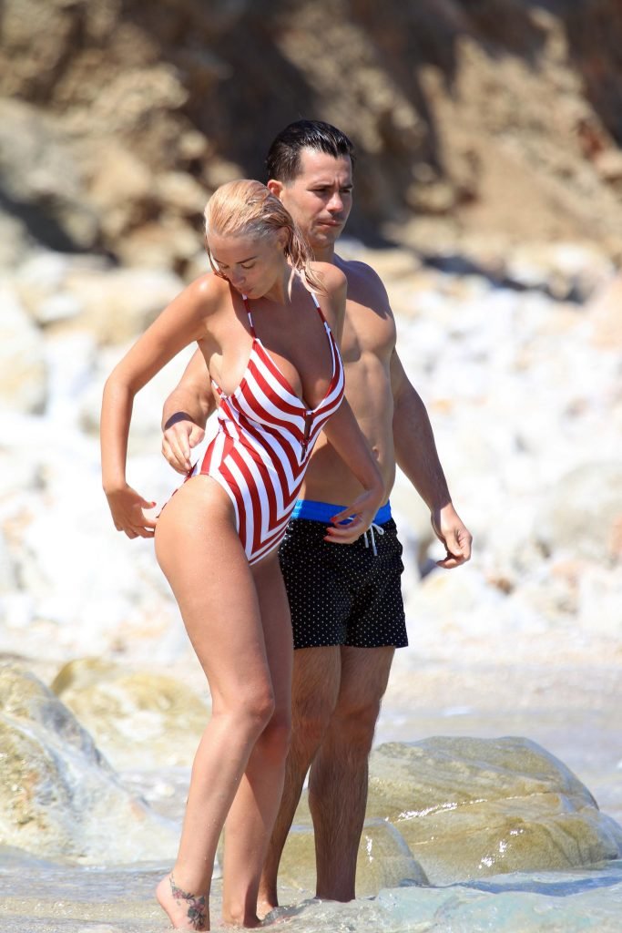 Busty loira Rhian Sugden usa um maiô vermelho&branco de férias com seu homem em Kalkan, Turquia, 04/06/2017. Rhian Sugden é uma modelo glamour, estrela de televisão (Celebrity Big Brother) e atriz de Londres. Idade – 30 anos.