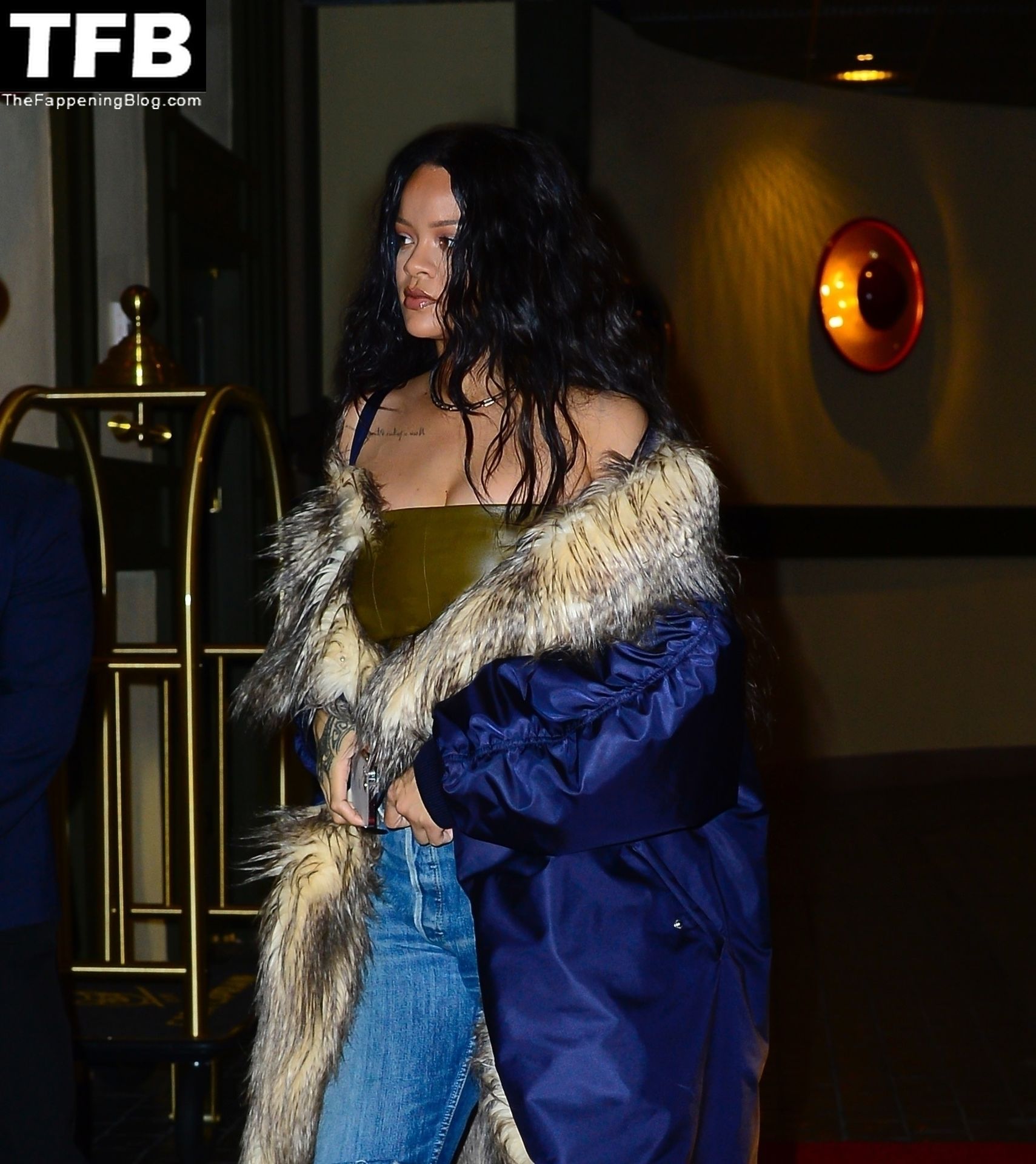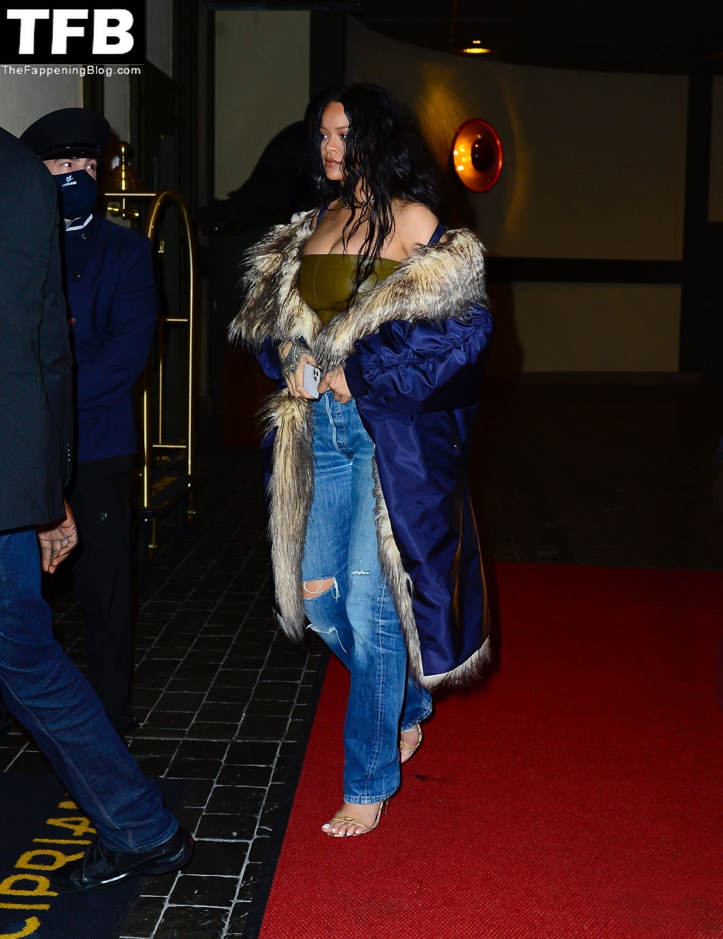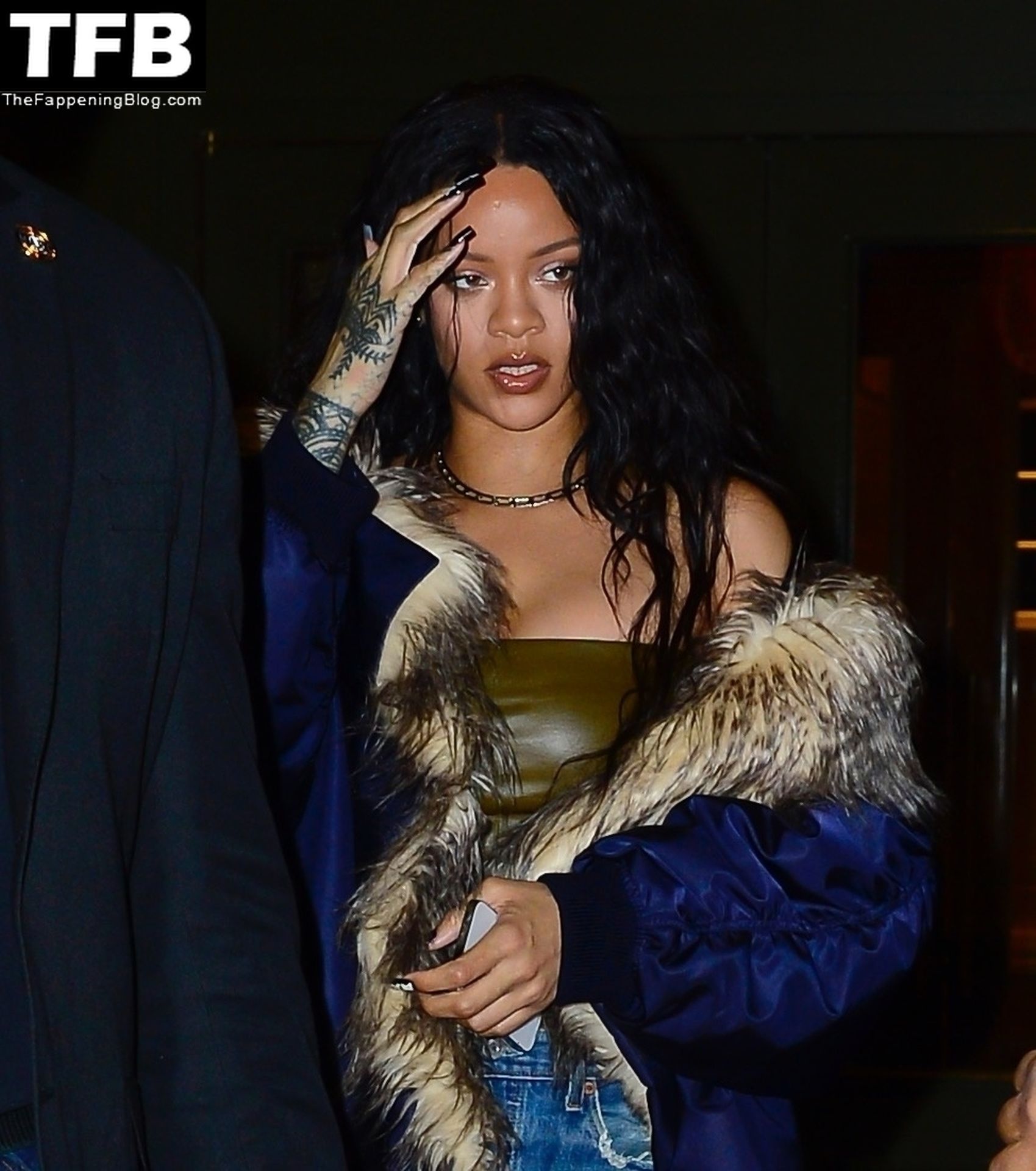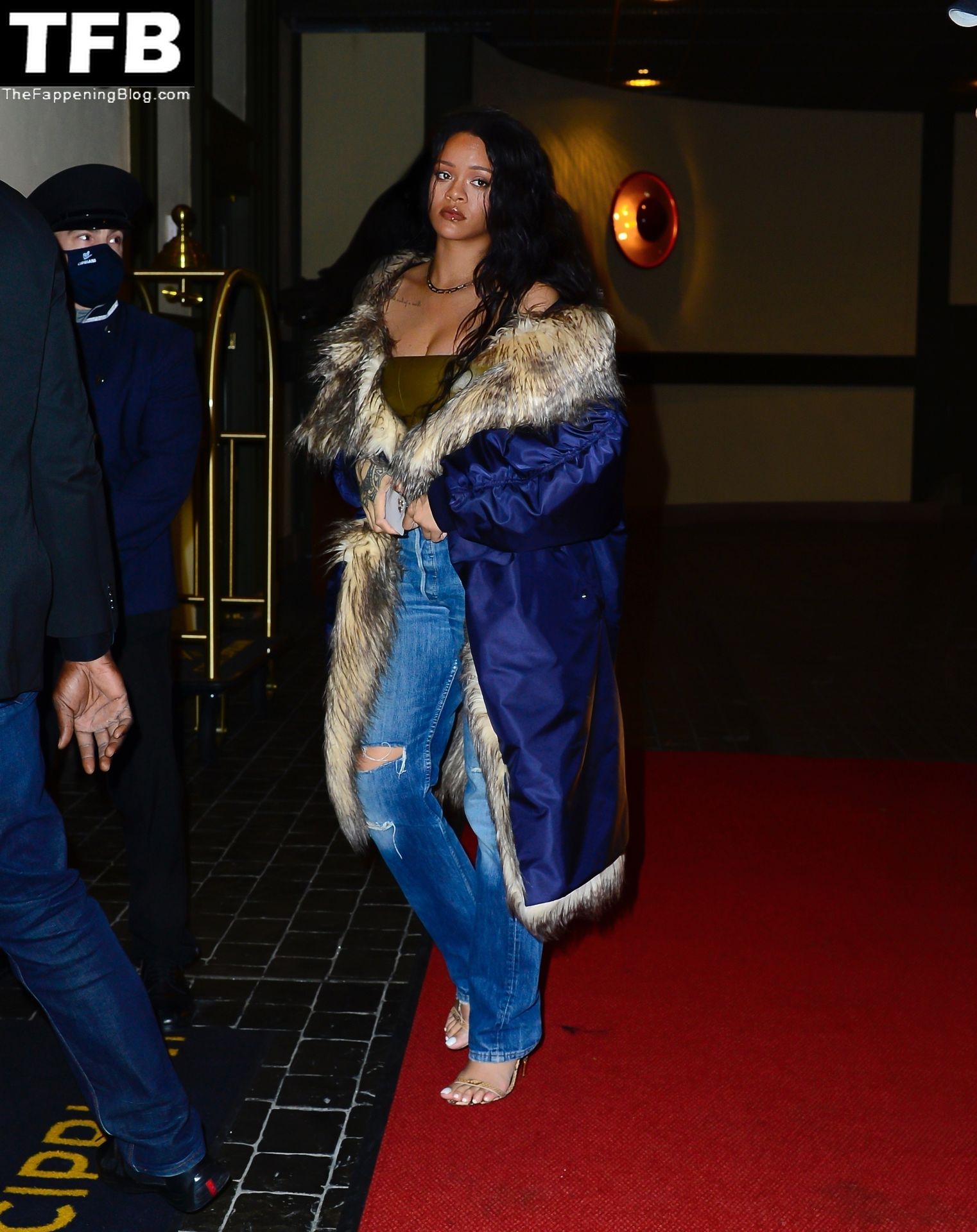 A estrela do Fappening Rihanna rouba a cena com um casaco marcante combinado com jeans enquanto sai para jantar em NYC antes de partir para Los Angeles, 11/04/2021.