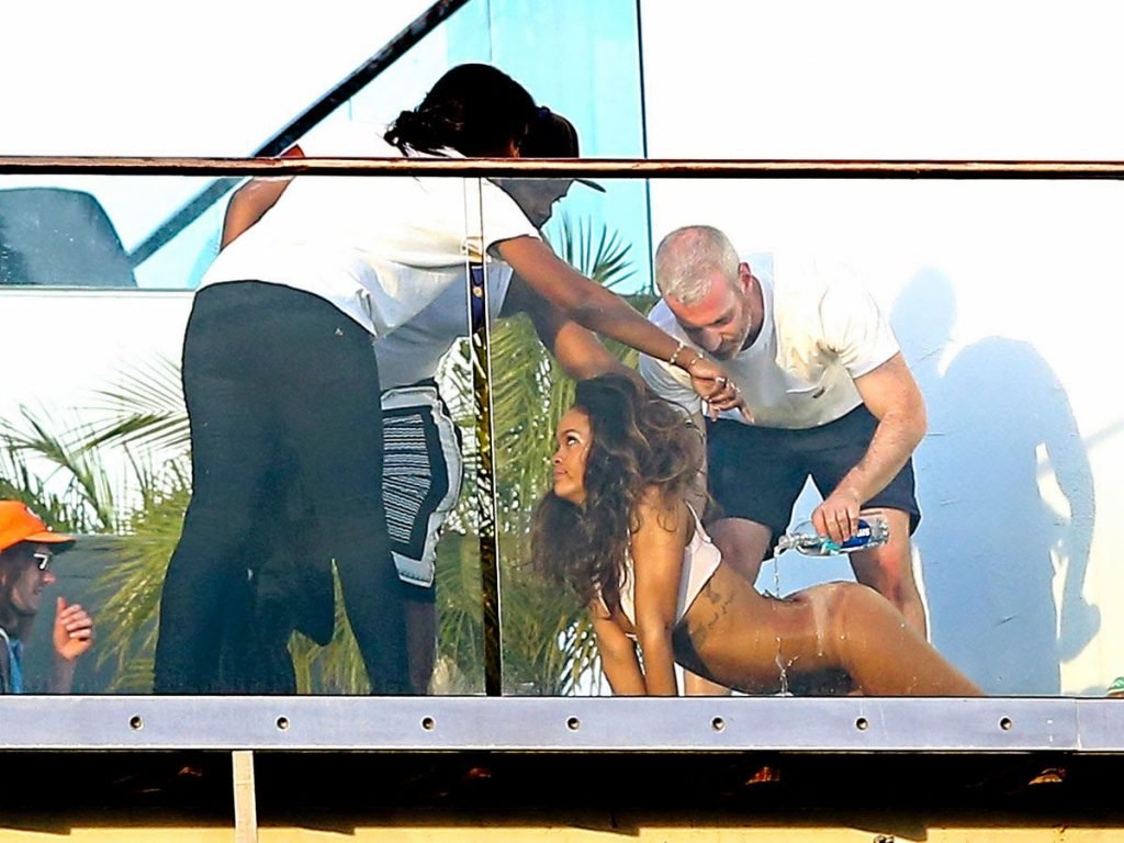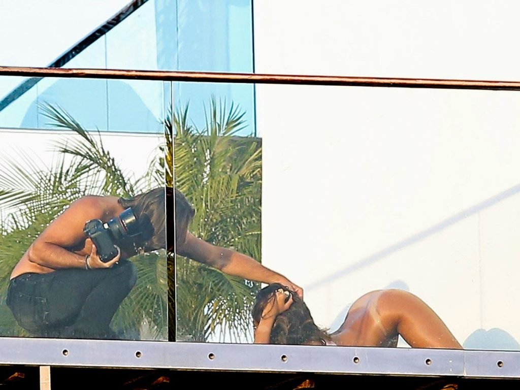 A cantora apareceu no terraço de uma mansão luxuosa em Hollywood quase nua. O peito de Rihanna estava pelo menos um pouco coberto com um top curto, e a parte inferior da roupa estava exposta aos olhos da equipe.
